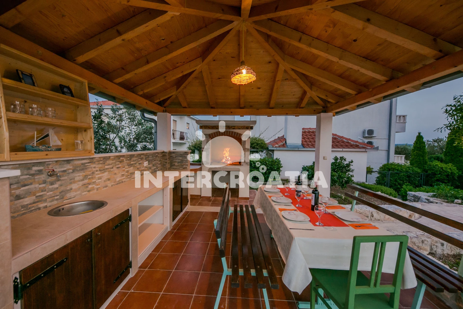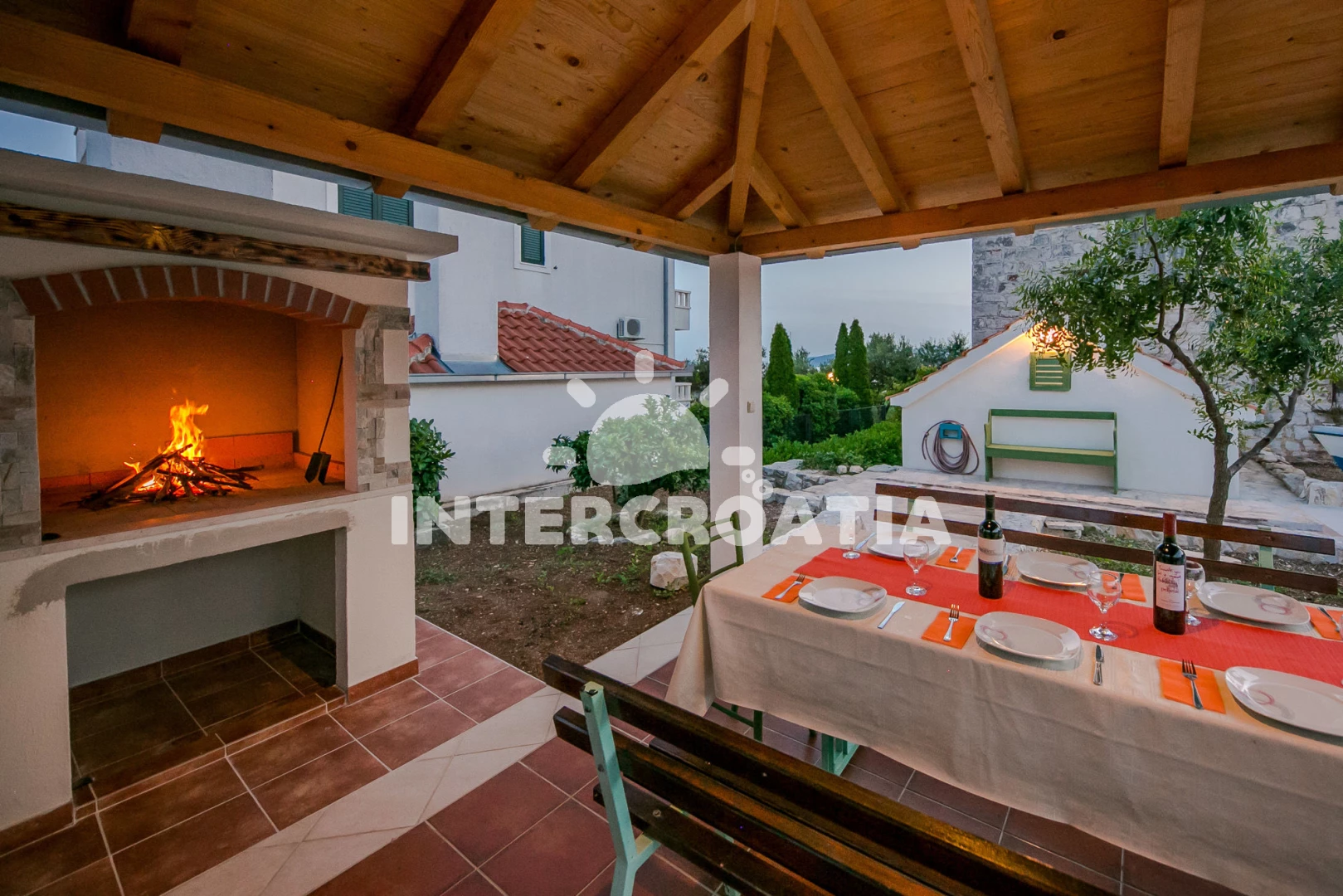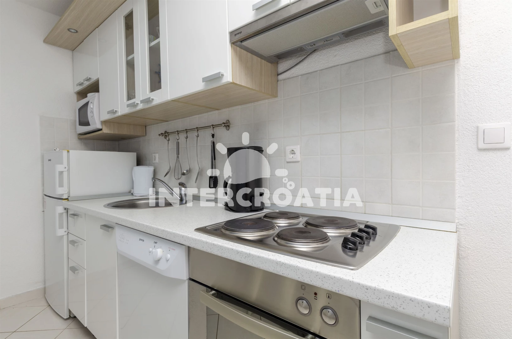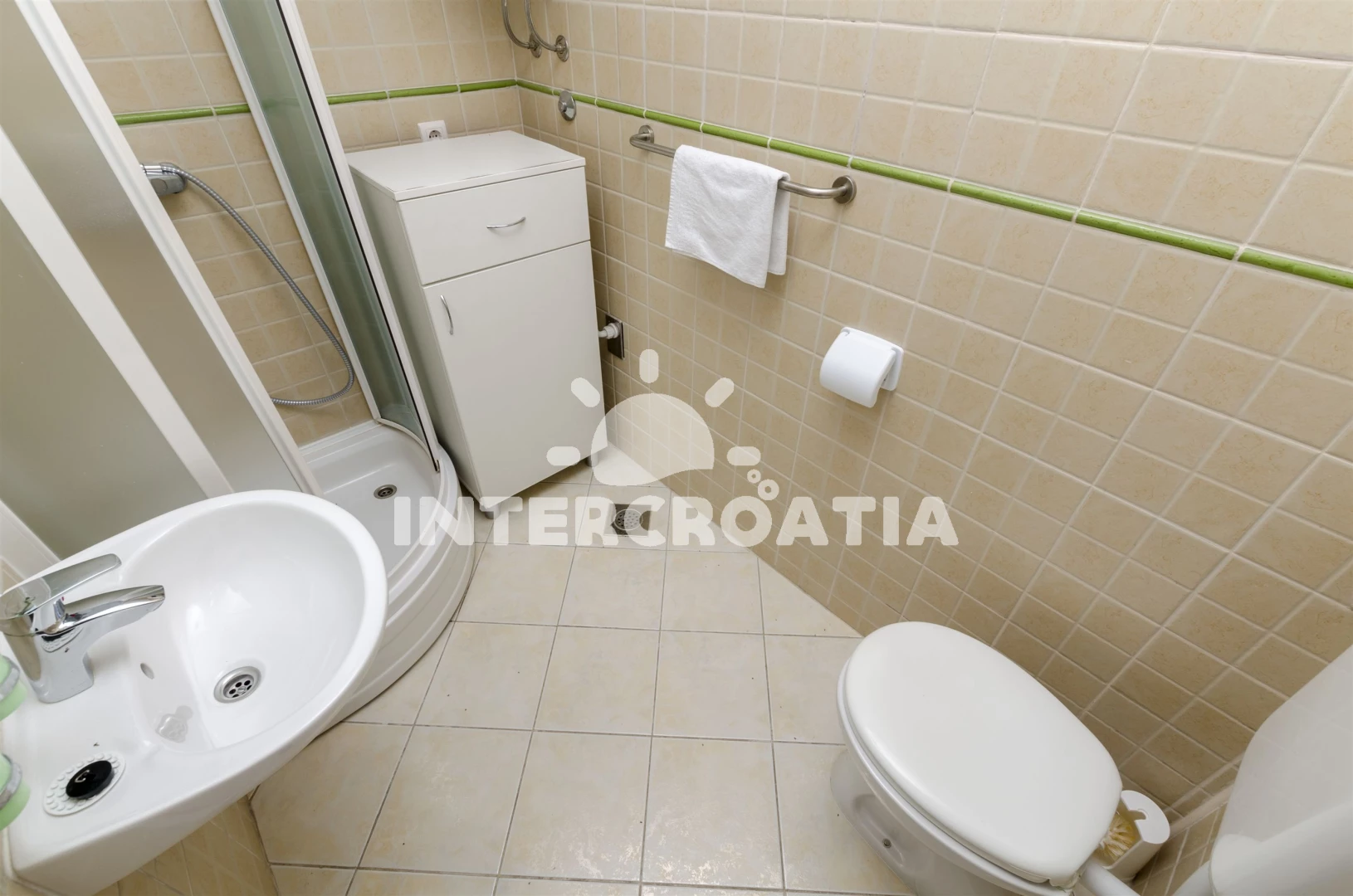 Vzdálenosti: Moře 50 m, pláž 50 m (oblázky), bar 100 m, restaurace 200 m, centrum 200 m, marina 300 m, kotviště pro čluny 300 m, lékárna 400 m, směnárna 400 m, pošta 400 m, supermarket 500 m, trajekt (Trogir) 2 km, ambulance 2 km, banka 2 km, čerpací stanice 3 km, letiště (Split) 7 km,