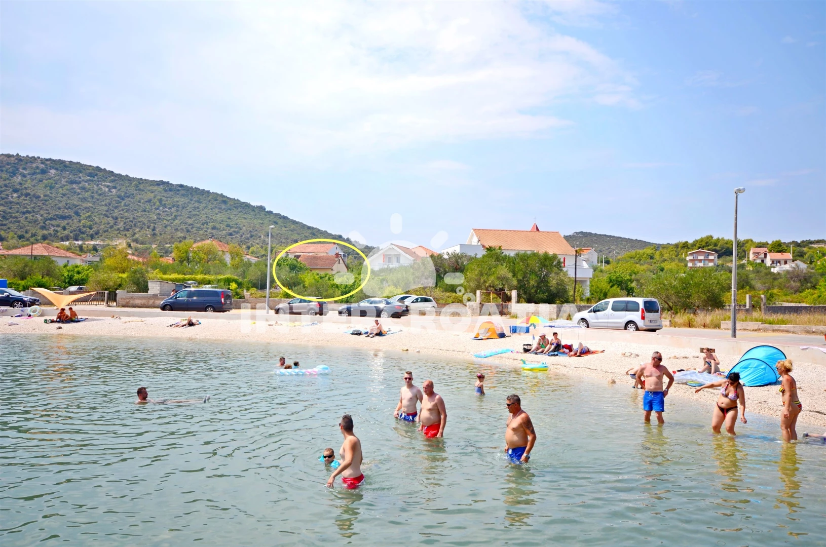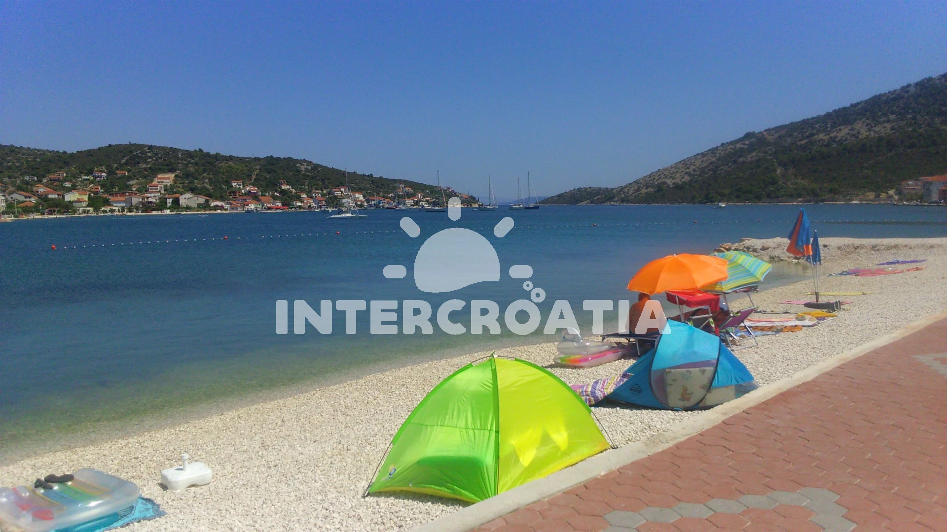 Vzdálenosti: Moře 30 m, pláž 50 m (oblázky), pošta 100 m, centrum 100 m, veřejná doprava 100 m, supermarket 100 m, ambulance 100 m, směnárna 100 m, restaurace 200 m, bar 200 m, půjčovna motorových člunů 300 m, marina 400 m, lékárna 7 km, banka 7 km, diskotéka 15 km, čerpací stanice 20 km, muzeum 20 km, letiště (Split) 25 km, trajekt 45 km,