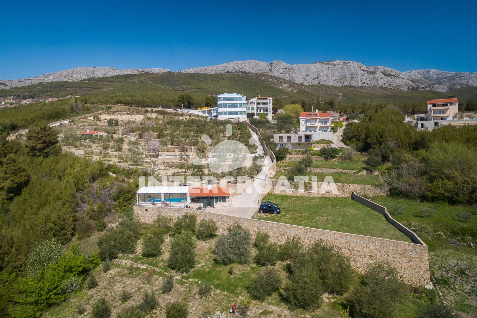 Vzdálenosti: Moře 2,5 km, pláž 2 km (písčitá, oblázková a skalnatá), veřejná doprava 500 m, bar 1 km, supermarket 1 km, lékárna 1 km, ambulance 1 km, směnárna 1 km, restaurace 1 km, pošta 1 km, mini golf 1,5 km, potápění 2 km, půjčovna kol 2 km, diskotéka 2 km, centrum 2 km, banka 2 km, tenisové kurty 2 km, půjčovna motorových člunů 2 km, čerpací stanice 6 km, muzeum 10 km, trajekt (Split) 12 km, letiště (Split) 240,0 km,