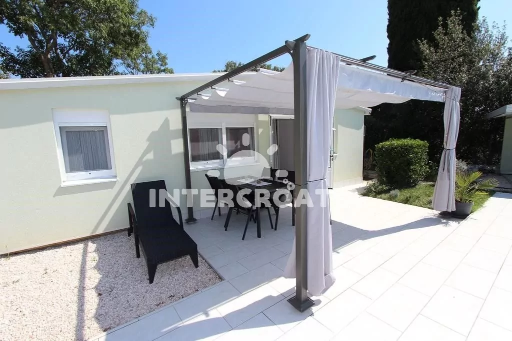 Přízemní domek (40 m2) s terasou a venkovním posezením je vhodný pro 2 až 4 osoby. Obývací pokoj je spojený s kuchyní. Kuchyňská linka s dvouplotýnkovým vařičem, mikrovlnnou troubou, rychlovarnou konvicí, kávovarem, toustovačem, nádobím a lednicí s mrazákem. Obývací pokoj s jídelním stolem pro 5 osob, rohovou pohovkou (rozložitelná na extra lůžko pro 2 osoby), televizí, klimatizací a vstupem na terasu. Ložnice s dvěma jednolůžky. Koupelna se sprchovým koutem, umyvadlem, fénem a wc. Hostům je k dispozici parkování u objektu zdarma.