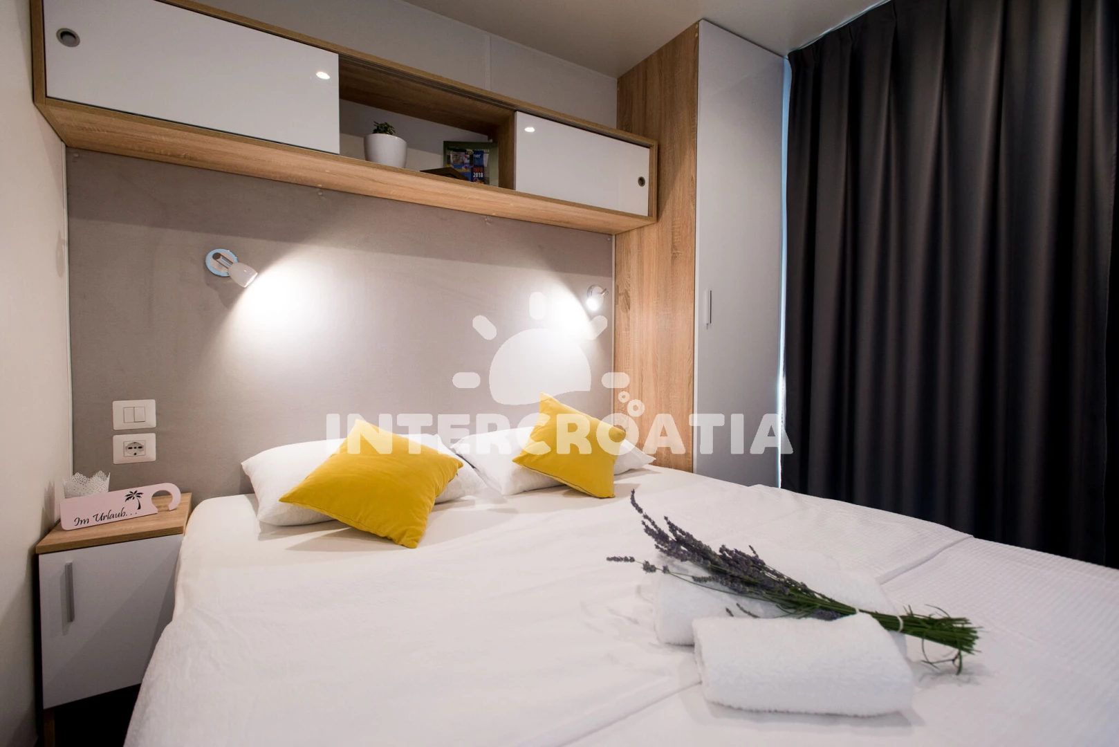 Mobilheim (2) s terasou. Nachází se v objektu. Mobilheim má 2 ložnice a je vhodný pro až 2 osoby. Kuchyňská linka je vybavena varnou deskou, troubou, kávovarem, toustovačem, myčkou na nádobí, rychlovarnou konvicí, nádobím, lednicí, mrazákem. V obývací místnosti je rozložitelná pohovka (extra lůžko pro osoby). K dispozici televize, radio. První ložnice s dvoulůžky. Druhá ložnice s jednolůžky.