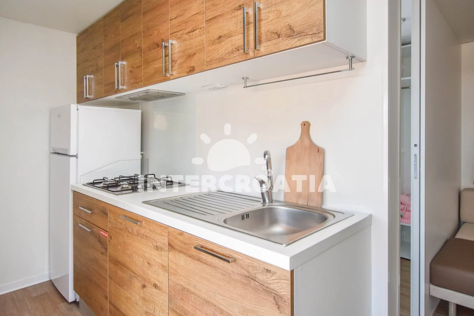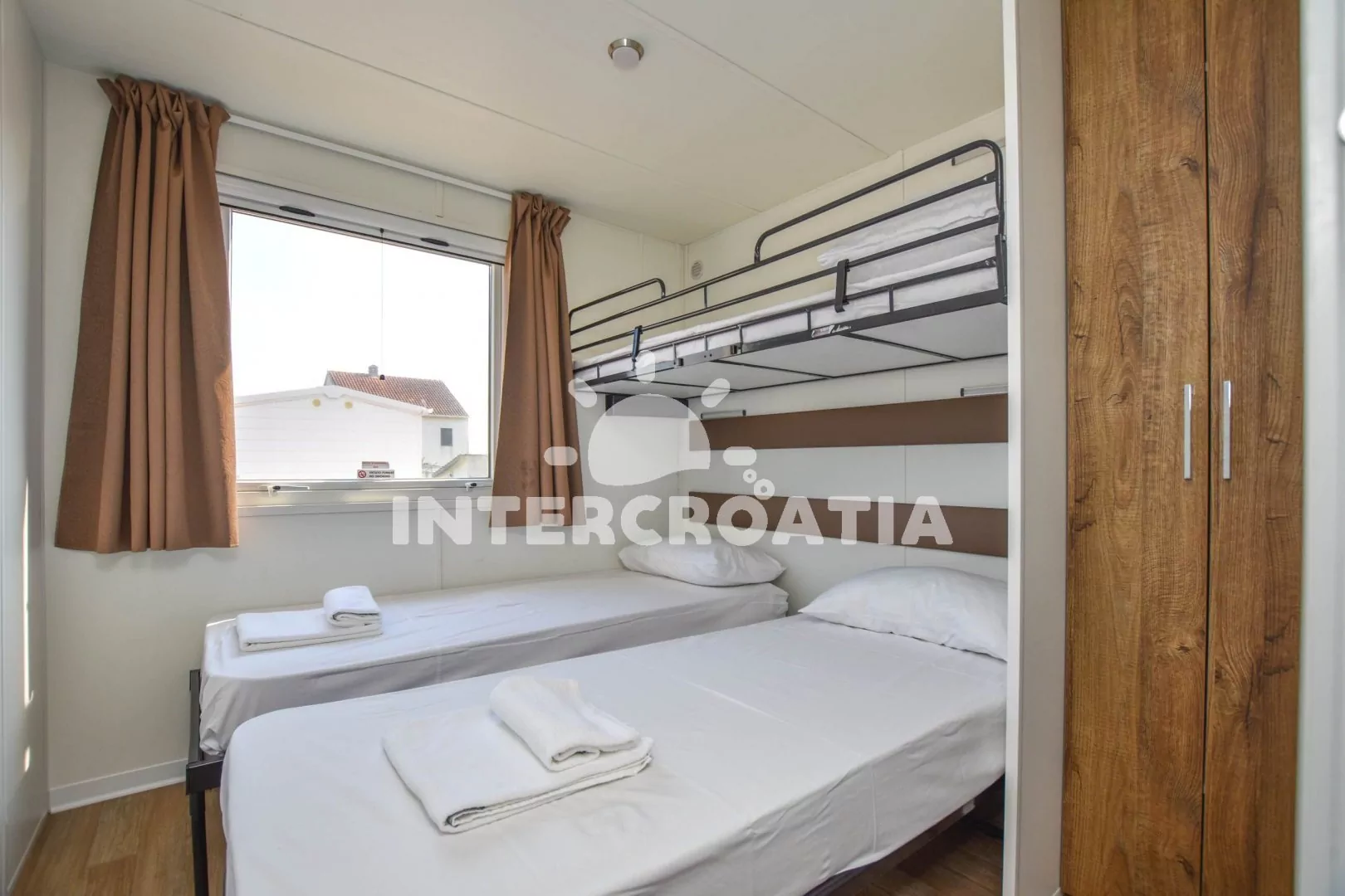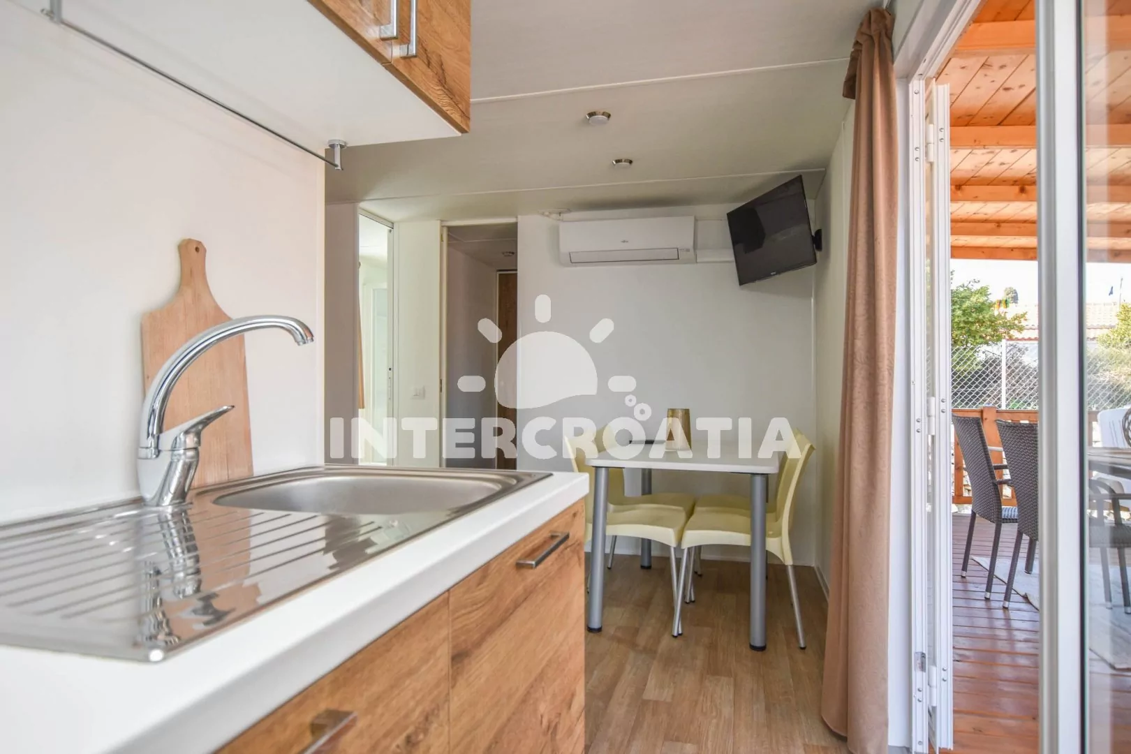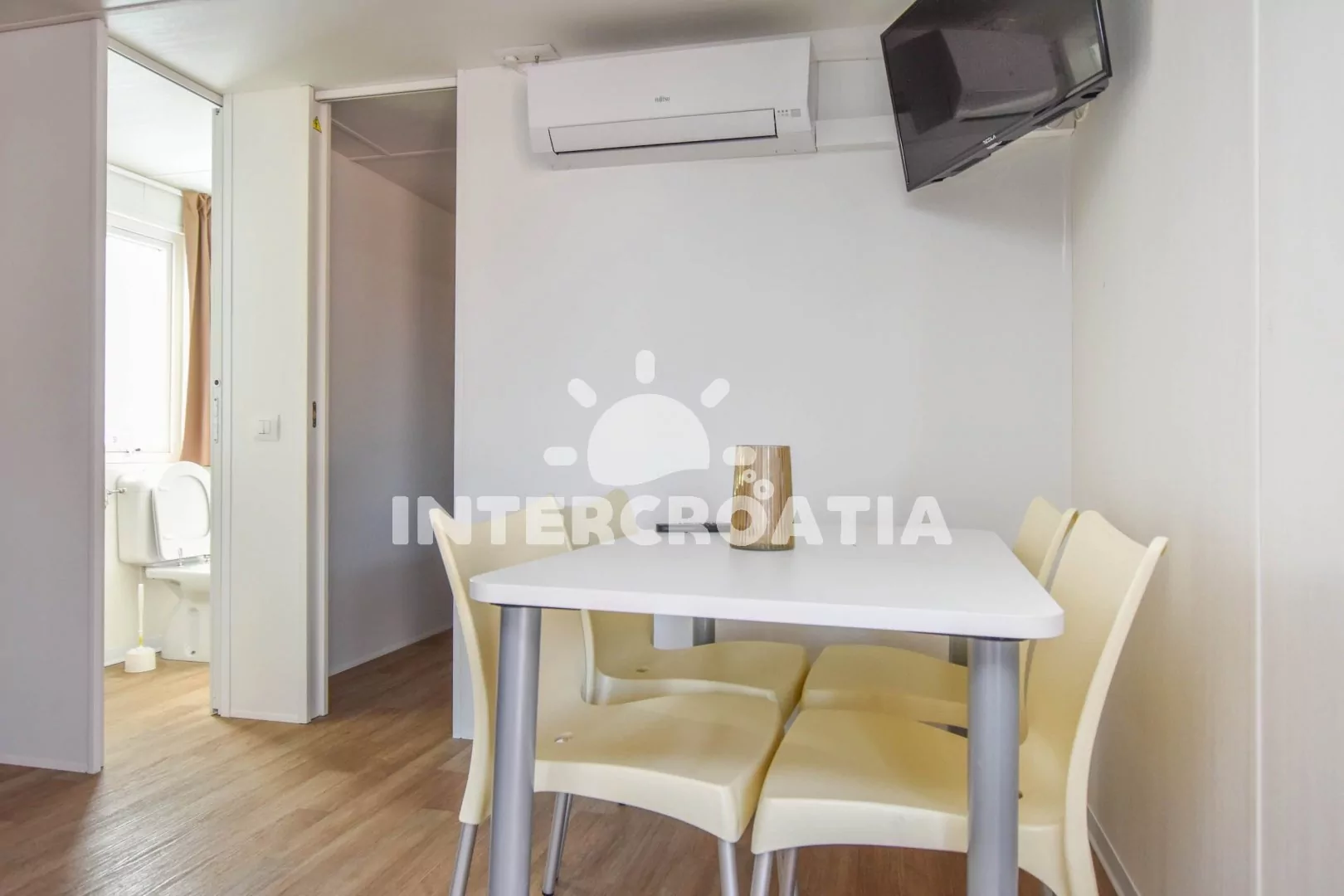 Dům (32 m2) s terasou a venkovním posezením. Domek má 2 ložnice a je vhodný pro 4 až 5 osob. Obývací pokoj je spojený s kuchyní. Kuchyňská linka je vybavena varnou deskou, kávovarem, nádobím a lednicí s mrazákem. Obývací pokoj s jídelním stolem, pohovkou, televizí, klimatizací a vstupem na terasu. První ložnice s dvoulůžkem. Druhá ložnice s dvěma jednolůžky a jedním patrovým lůžkem. Koupelna se sprchovým koutem, umyvadlem a wc. Hostům je k dispozici parkování u objektu zdarma.