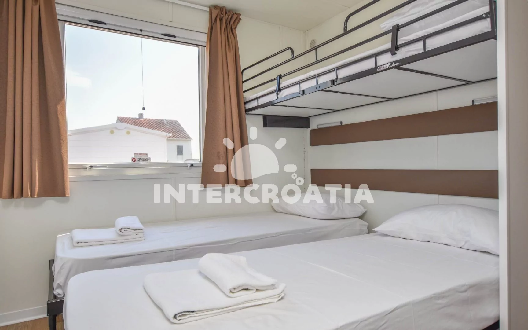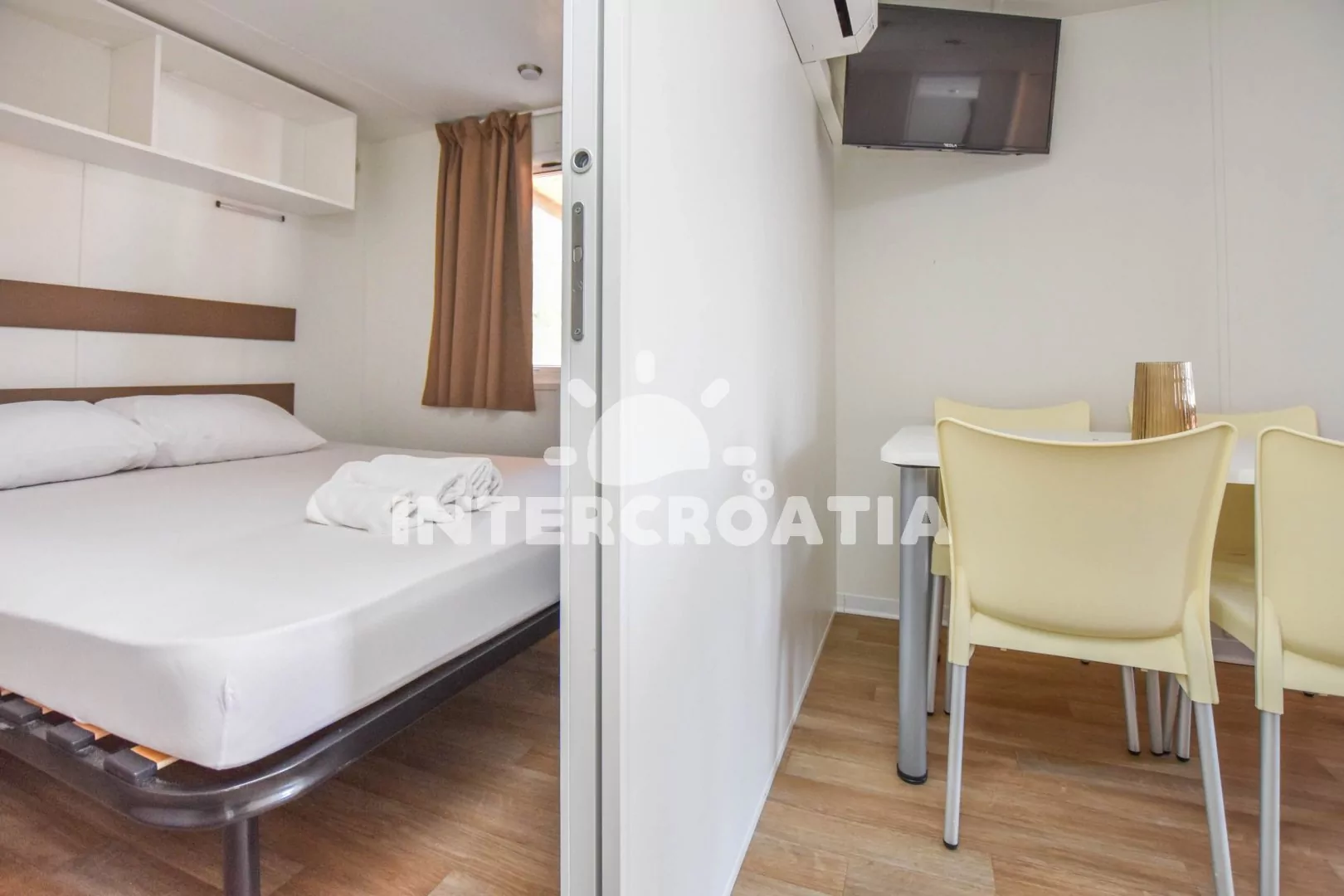 Dům (32 m2) s terasou a venkovním posezením. Domek má 2 ložnice a je vhodný pro 4 až 5 osob. Obývací pokoj je spojený s kuchyní. Kuchyňská linka je vybavena varnou deskou, kávovarem, nádobím a lednicí s mrazákem. Obývací pokoj s jídelním stolem, pohovkou, televizí, klimatizací a vstupem na terasu. První ložnice s dvoulůžkem. Druhá ložnice s dvěma jednolůžky a jedním patrovým lůžkem. Koupelna se sprchovým koutem, umyvadlem a wc. Hostům je k dispozici parkování u objektu zdarma.