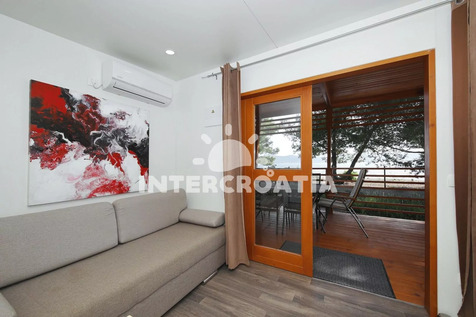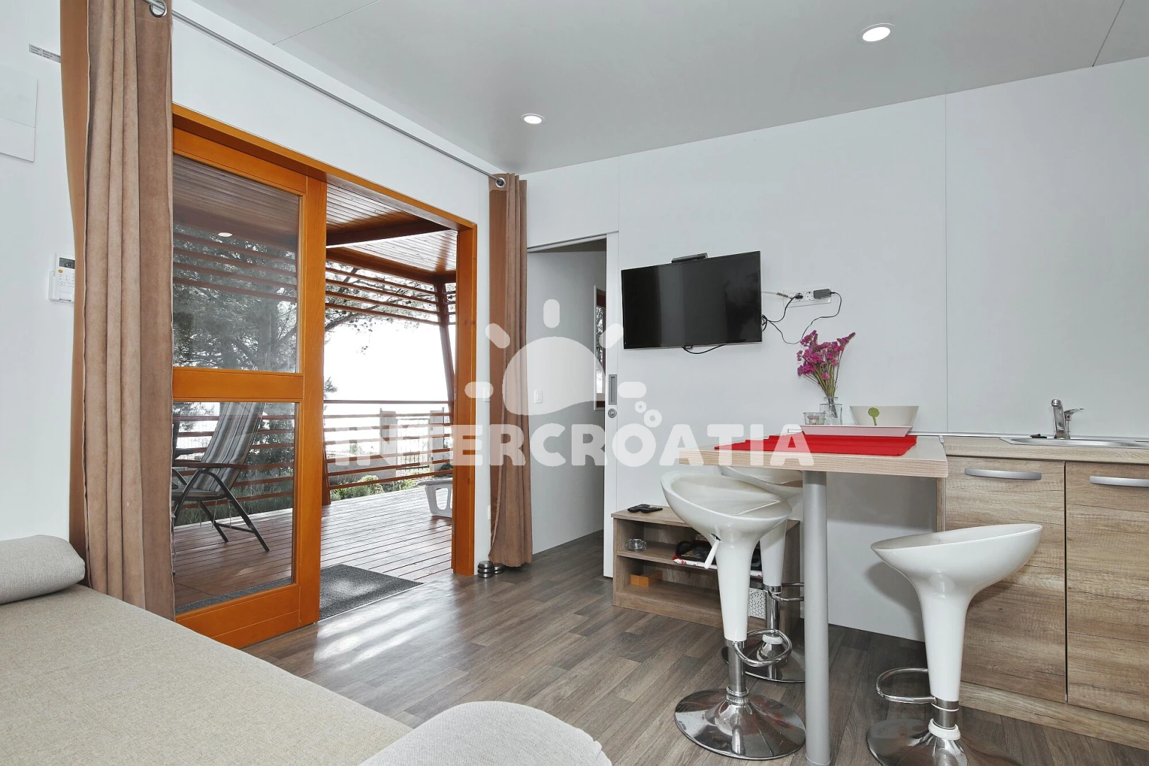 Přízemní dům (32 m2) s terasou je vhodný pro až 6 osob. Obývací pokoj je spojený s kuchyní. Kuchyňská linka je vybavena dvouplotýnkovou varnou deskou, digestoří, mikrovlnnou troubou, rychlovarnou…