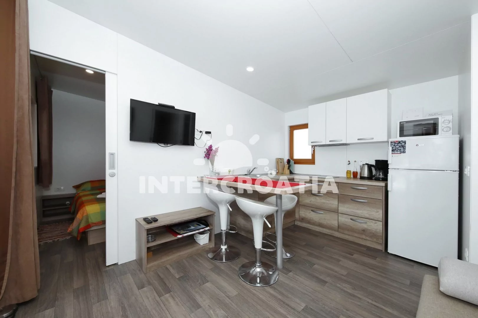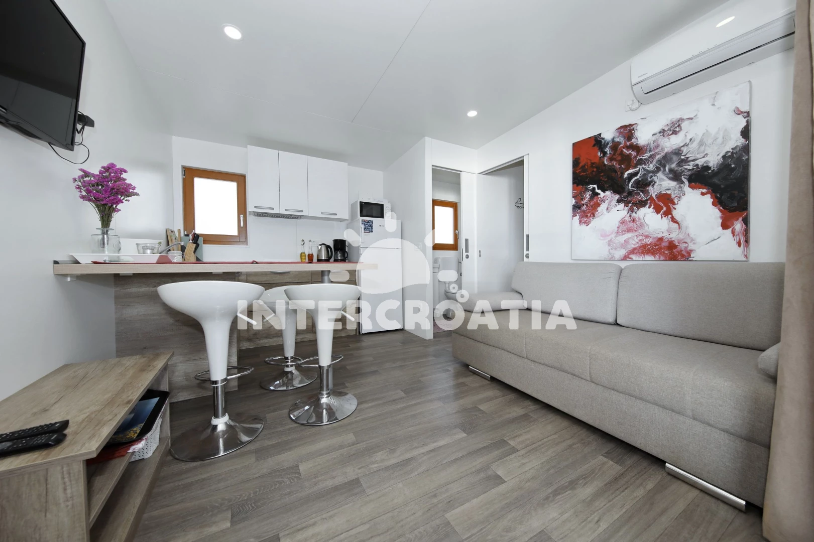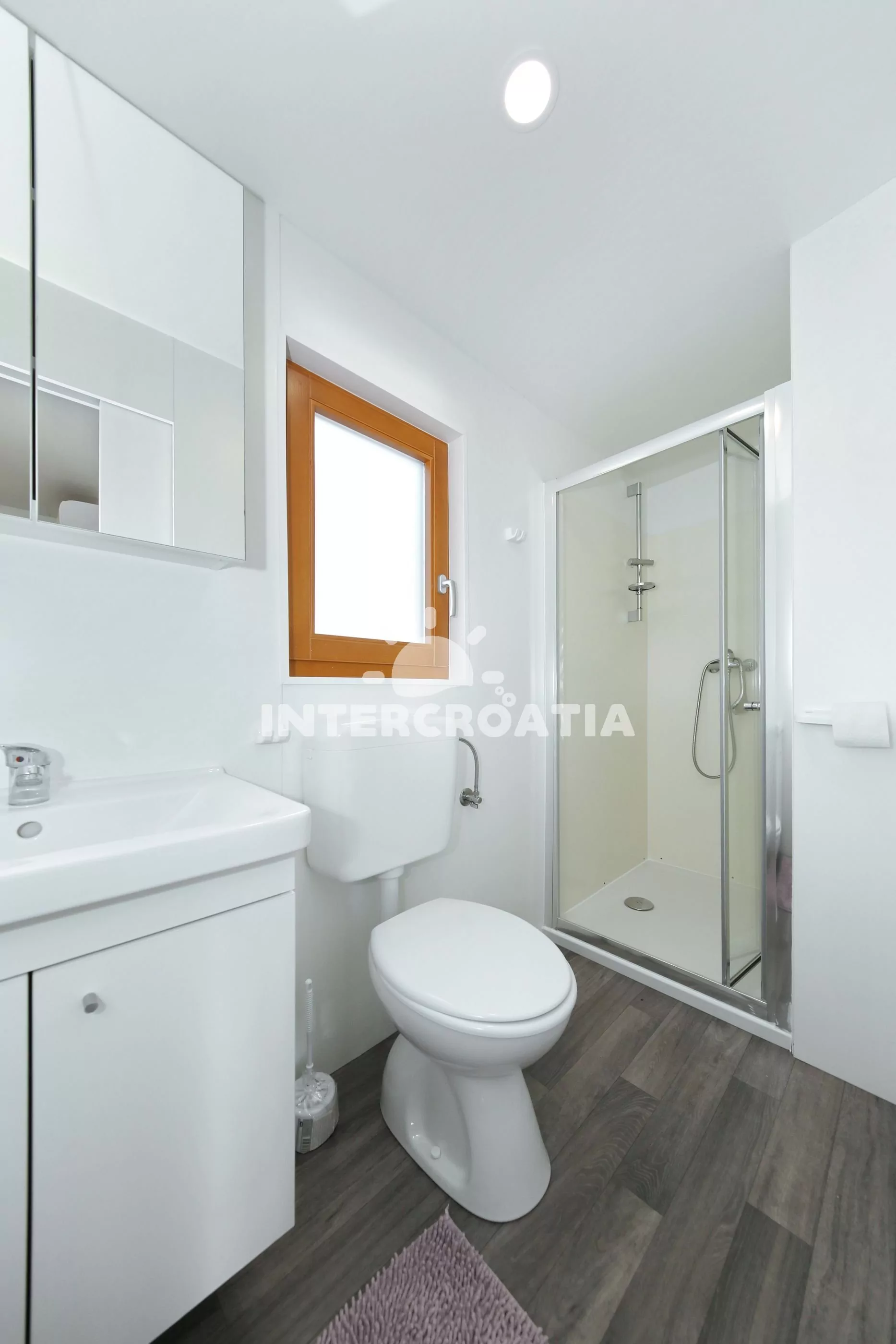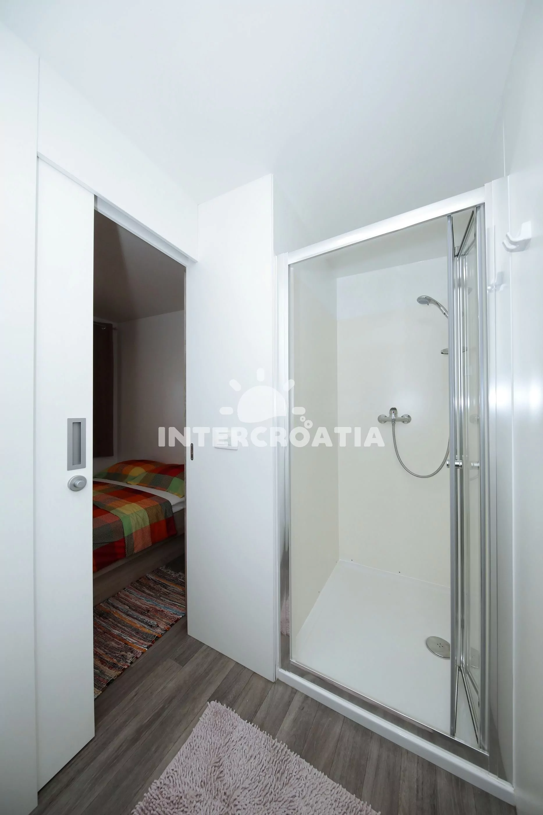 Přízemní dům (32 m2) s terasou je vhodný pro až 6 osob. Obývací pokoj je spojený s kuchyní. Kuchyňská linka je vybavena dvouplotýnkovou varnou deskou, digestoří, mikrovlnnou troubou, rychlovarnou konvicí, kávovarem, nádobím a lednicí s mrazákem. Obývací pokoj s jídelním stolem pro 3 osoby, pohovkou (rozložitelná na extra lůžko pro 2 osoby), televizí se satelitním programem, klimatizací a vstupem na terasu. První ložnice s dvoulůžkem. Druhá ložnice s dvěma jednolůžky. Dvě koupelny se sprchovým koutem, umyvadlem a wc. Hostům je k dispozici parkování u objektu zdarma.