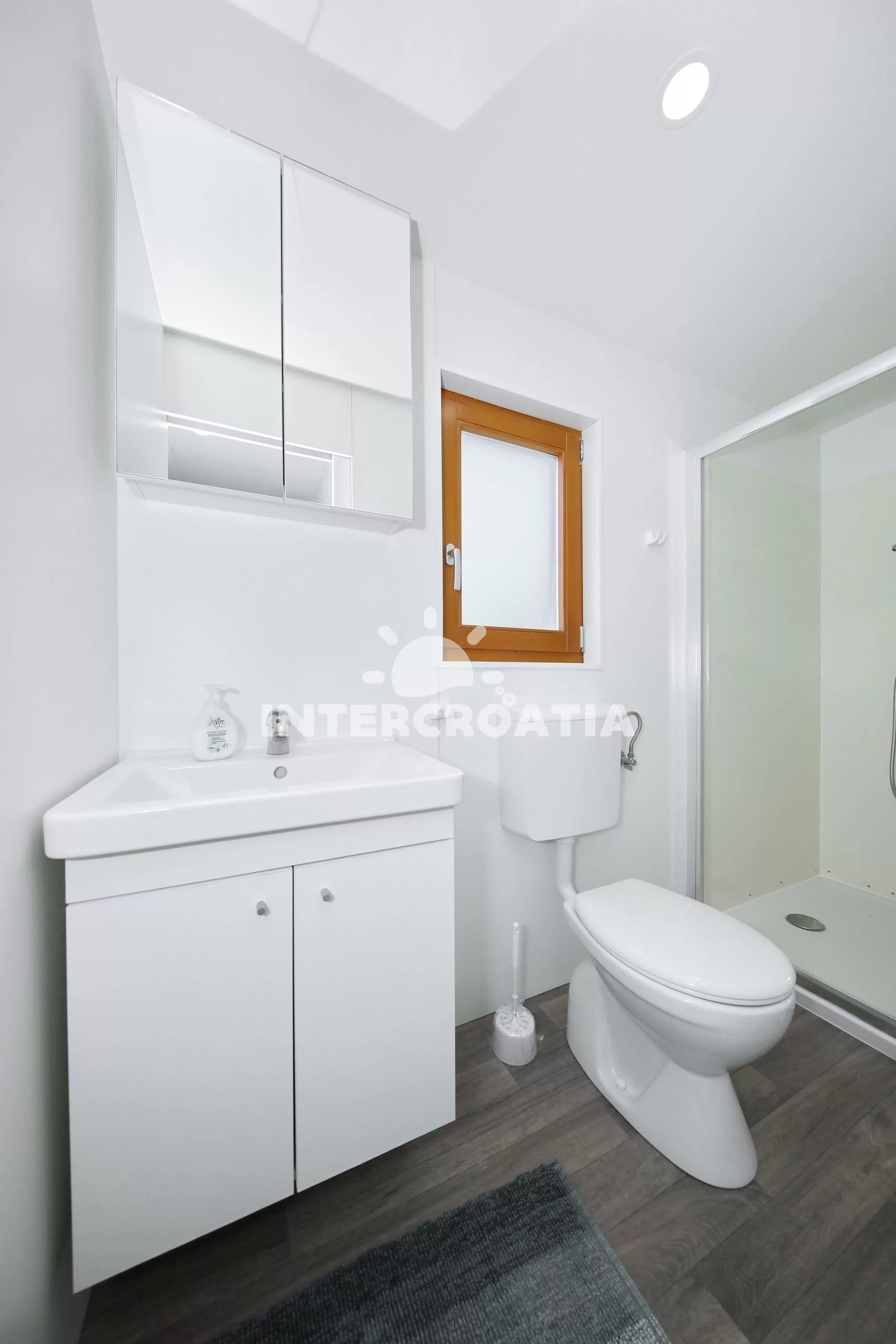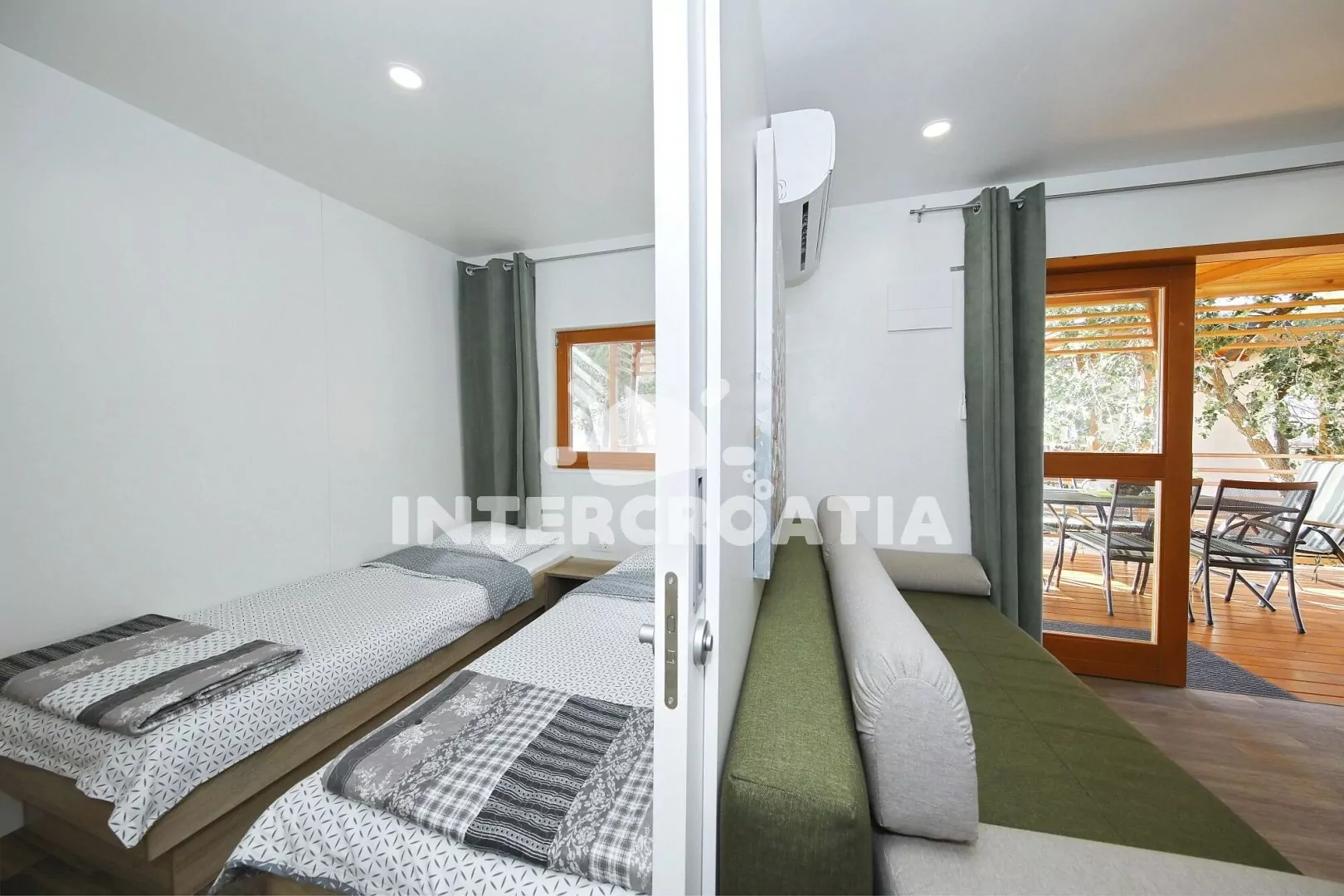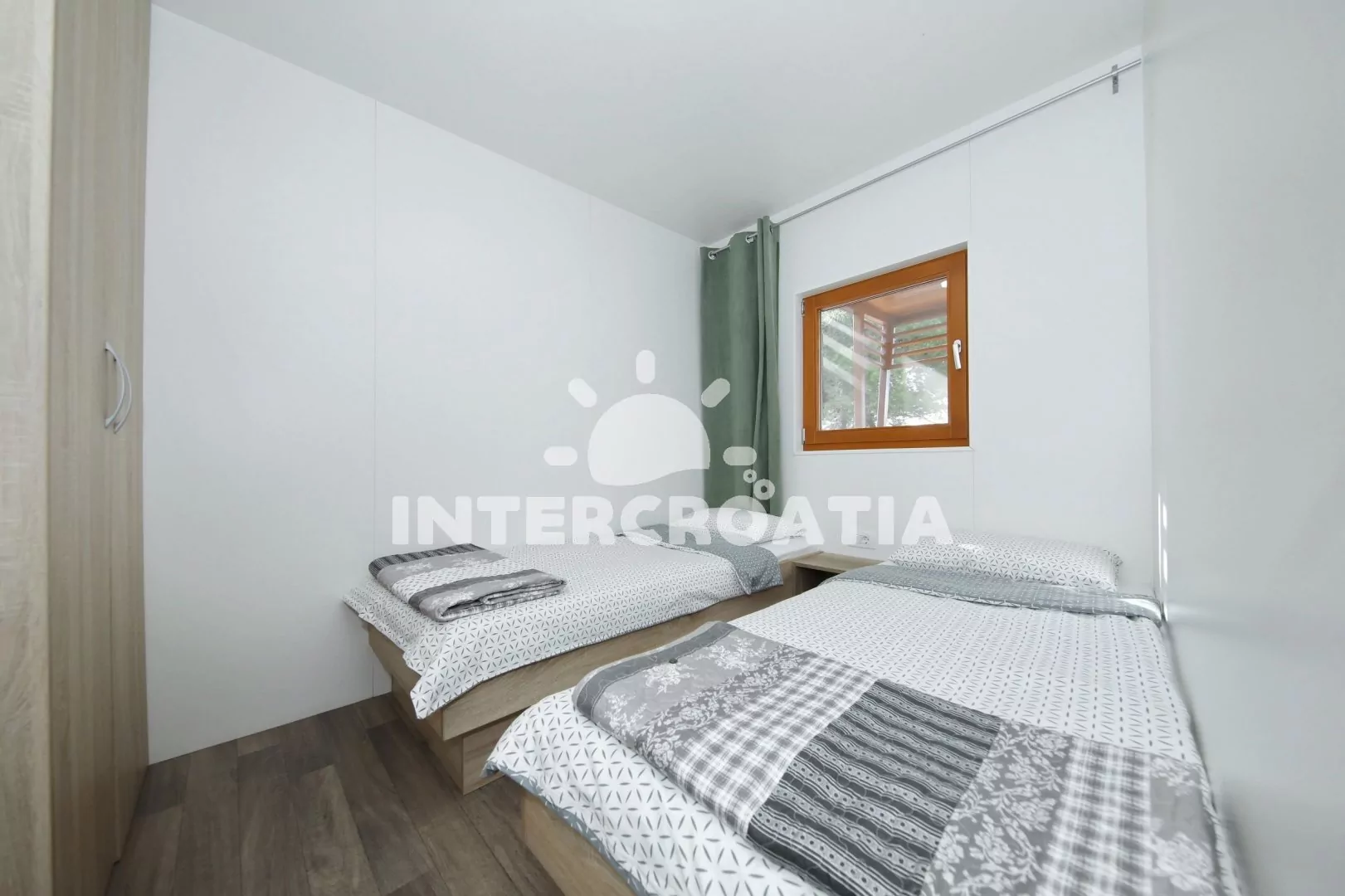 Přízemní dům (32 m2) s terasou je vhodný pro až 6 osob. Obývací pokoj je spojený s kuchyní. Kuchyňská linka je vybavena dvouplotýnkovou varnou deskou, digestoří, mikrovlnnou troubou, rychlovarnou konvicí, kávovarem, nádobím a lednicí s mrazákem. Obývací pokoj s jídelním stolem pro 3 osoby, pohovkou (rozložitelná na extra lůžko pro 2 osoby), televizí se satelitním programem, klimatizací a vstupem na terasu. První ložnice s dvoulůžkem. Druhá ložnice s dvěma jednolůžky. Dvě koupelny se sprchovým koutem, umyvadlem a wc. Hostům je k dispozici parkování u objektu zdarma.