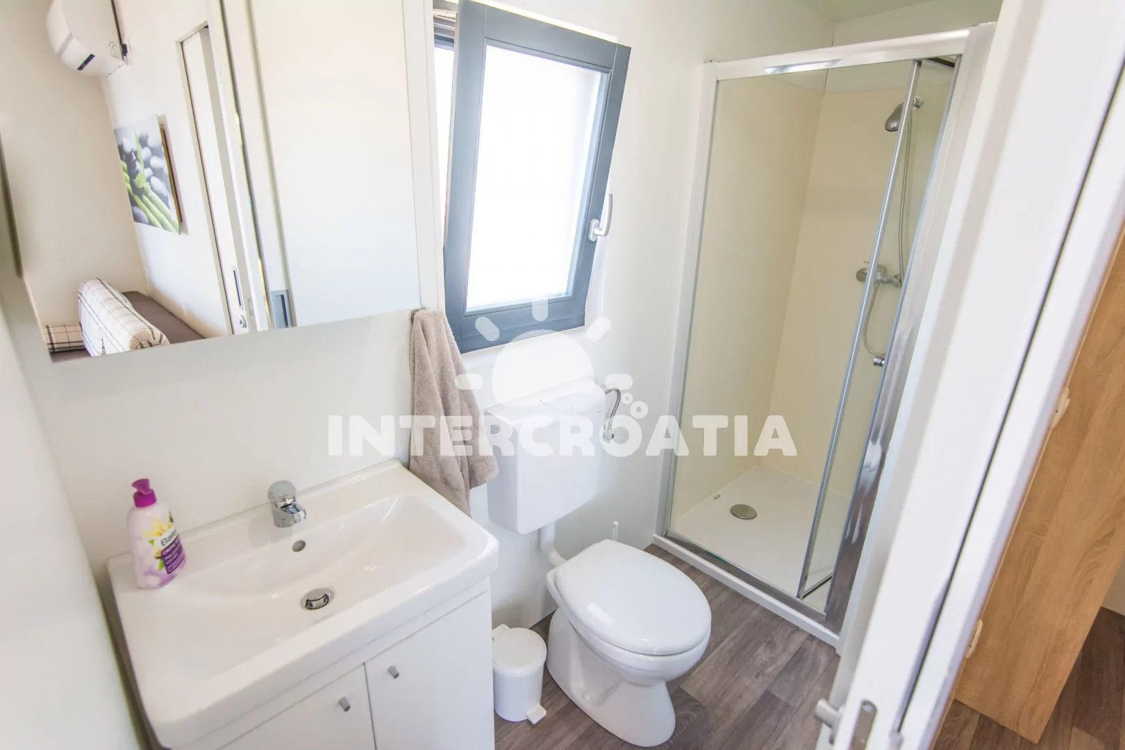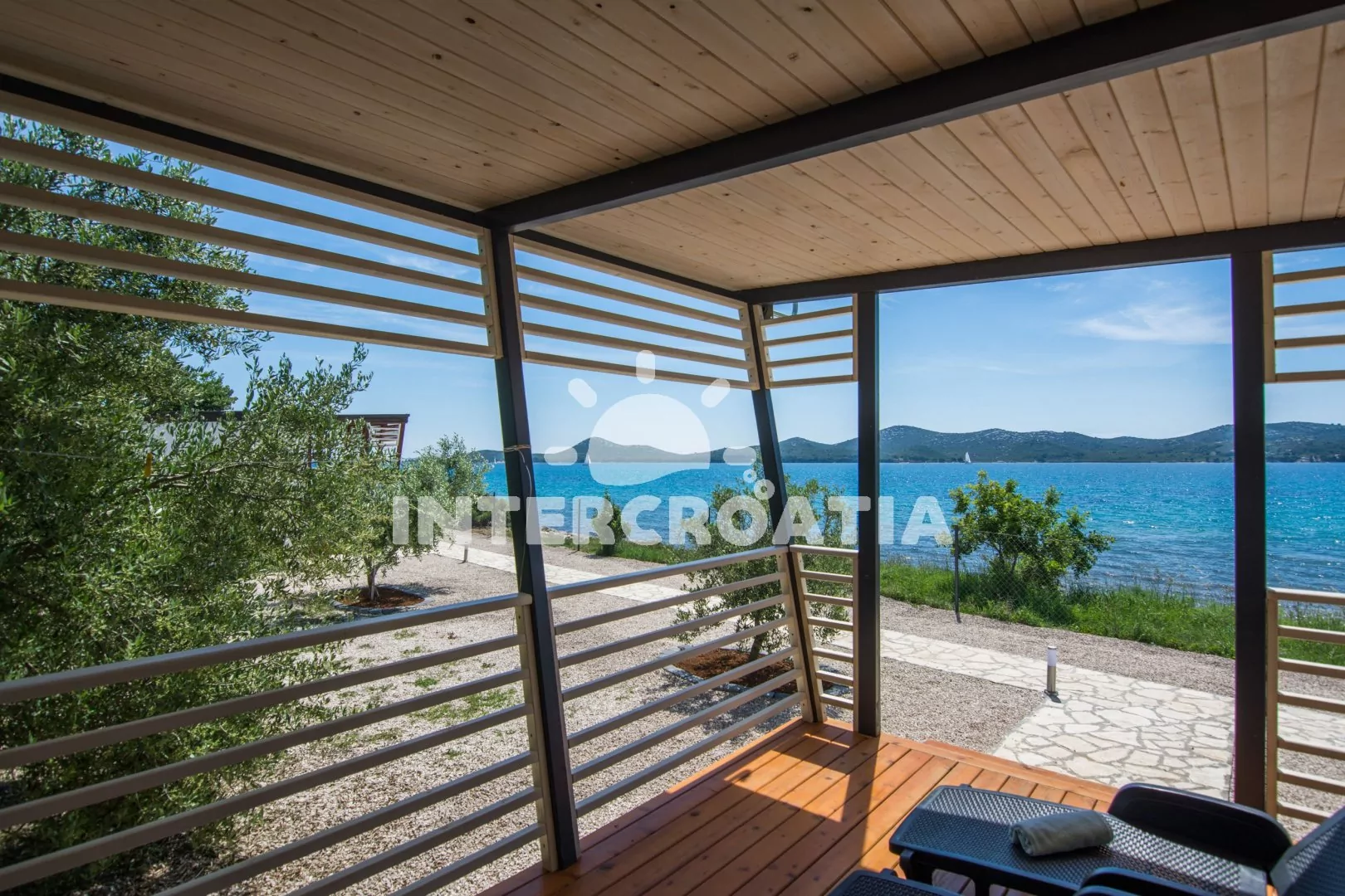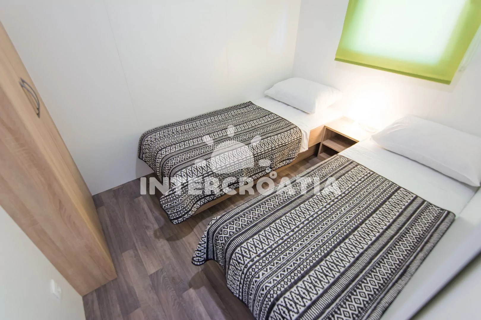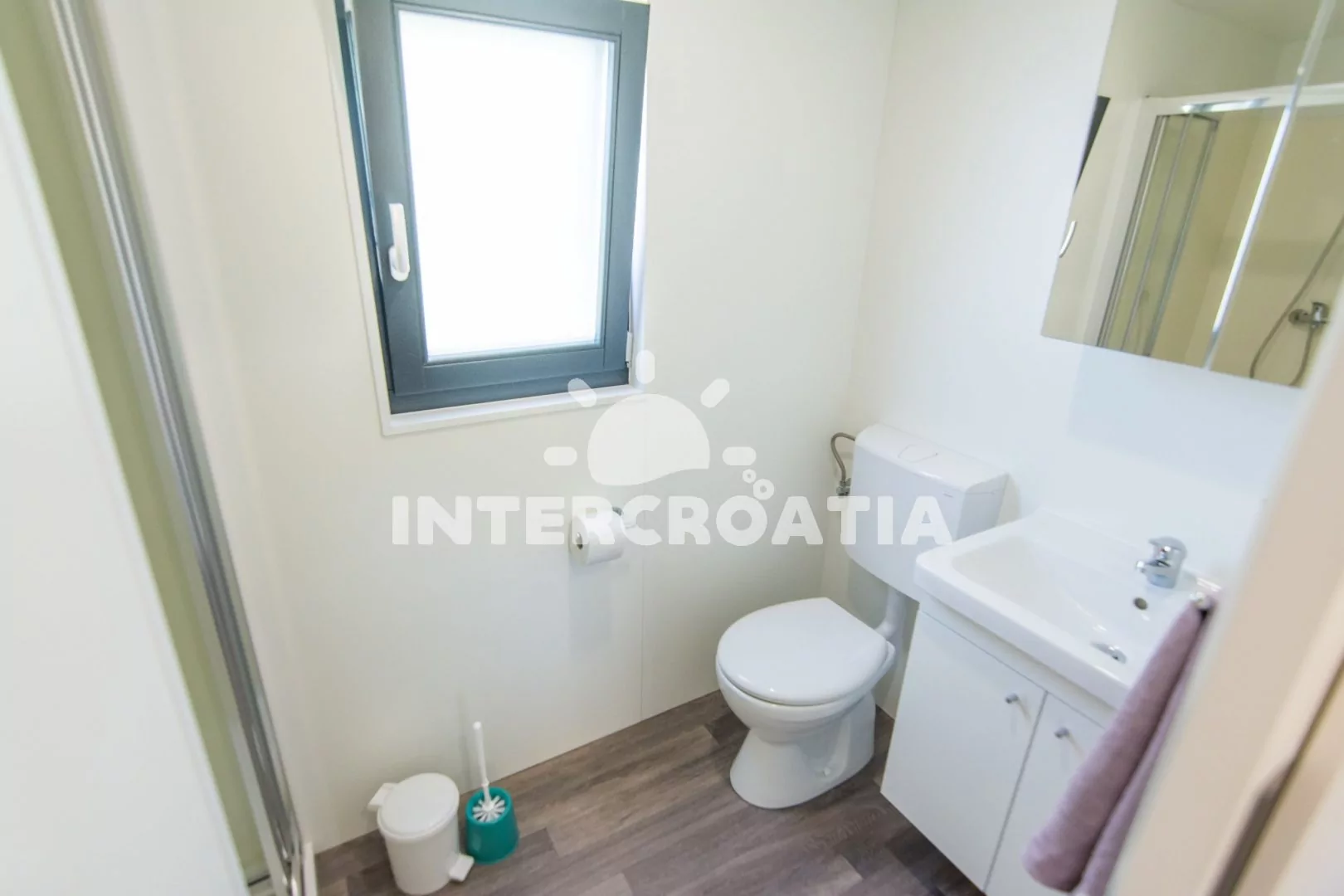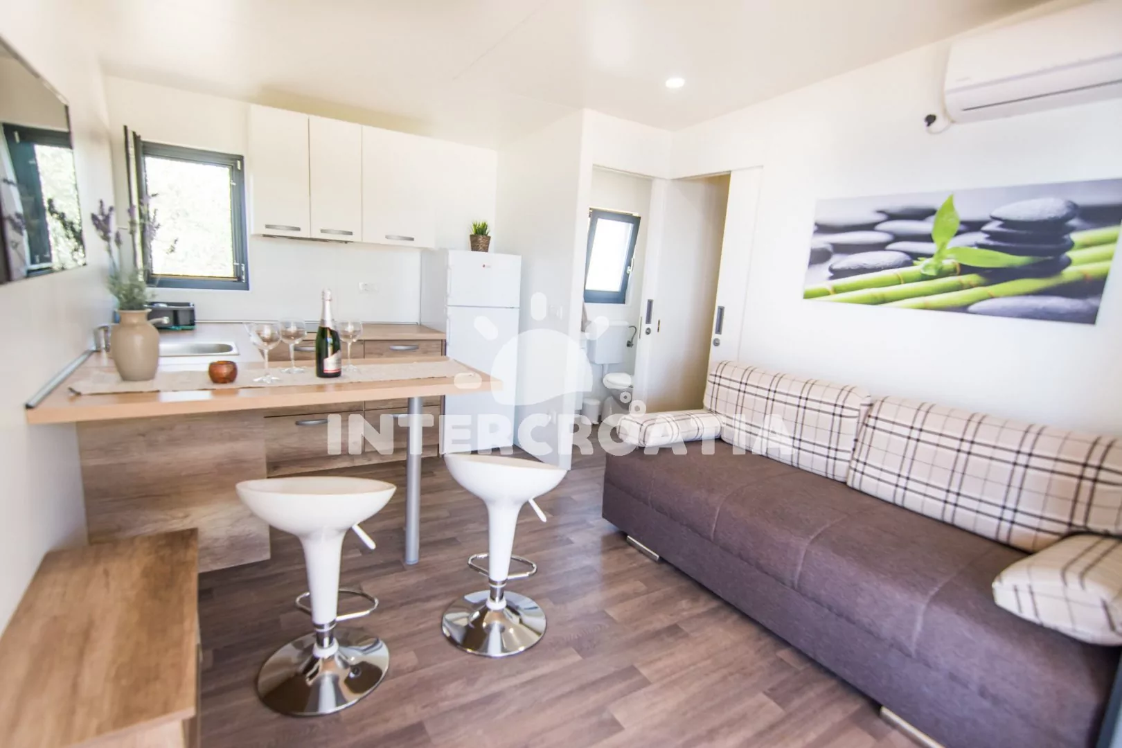 Moderní dům (32 m2) s terasou je vhodný pro až 6 osob. Obývací pokoj je spojený s kuchyní. Kuchyňská linka je vybavena dvouplotýnkovou varnou deskou, digestoří, mikrovlnnou troubou, nádobím a lednicí s mrazákem. Obývací pokoj s pohovkou (rozložitelná na extra lůžko pro 2 osoby), televizí se satelitním programem, klimatizací a vstupem na terasu. První ložnice s jedním dvoulůžkem. Druhá ložnice s dvěma jednolůžky. Dvě koupelny se sprchovým koutem, umyvadlem a wc. Hostům je k dispozici parkování u objektu zdarma.