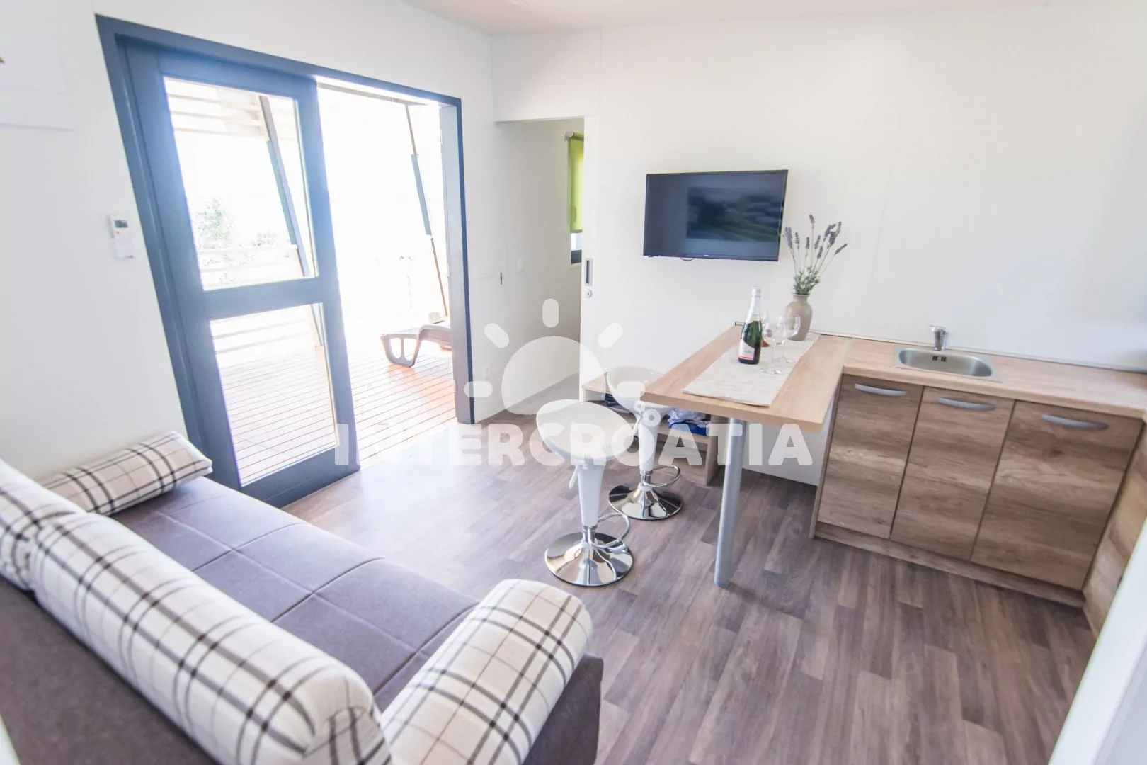 Moderní dům (32 m2) s terasou je vhodný pro až 6 osob. Obývací pokoj je spojený s kuchyní. Kuchyňská linka je vybavena dvouplotýnkovou varnou deskou, digestoří, mikrovlnnou troubou, nádobím a lednicí…