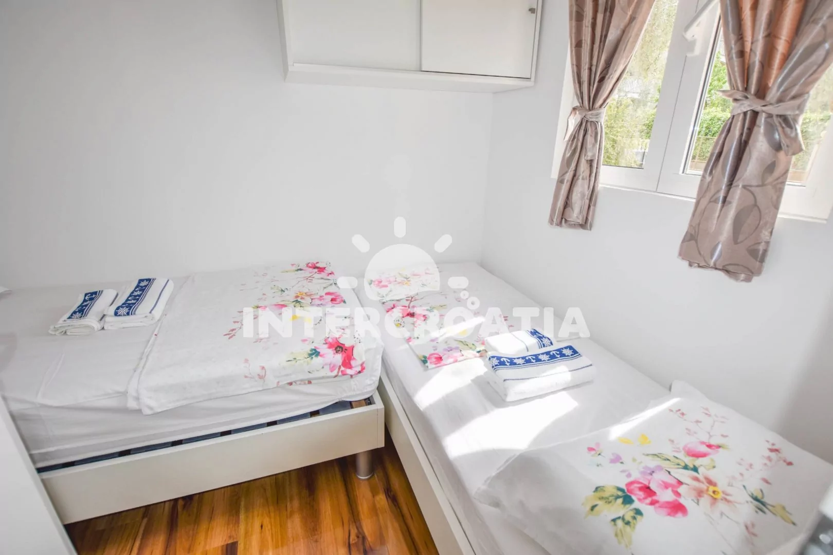 Domek (24 m2) s terasou, výhledem na moře a do dvora. Domek má 2 ložnice a je vhodný pro až 4 osoby. Obývací pokoj je spojený s kuchyní. Kuchyňská linka je vybavena dvouplotýnkovou varnou deskou, digestoří, vestavěnou troubou, rychlovarnou konvicí, kávovarem, nádobím a lednicí s mrazákem. Obývací pokoj s jídelním stolem pro 4 osoby, televizí se satelitním programem, klimatizací a vstupem na terasu. První ložnice s jedním dvoulůžkem. Druhá ložnice s dvěma jednolůžky. Koupelna se sprchovým koutem, umyvadlem a wc. Hostům je k dispozici parkování u objektu zdarma.