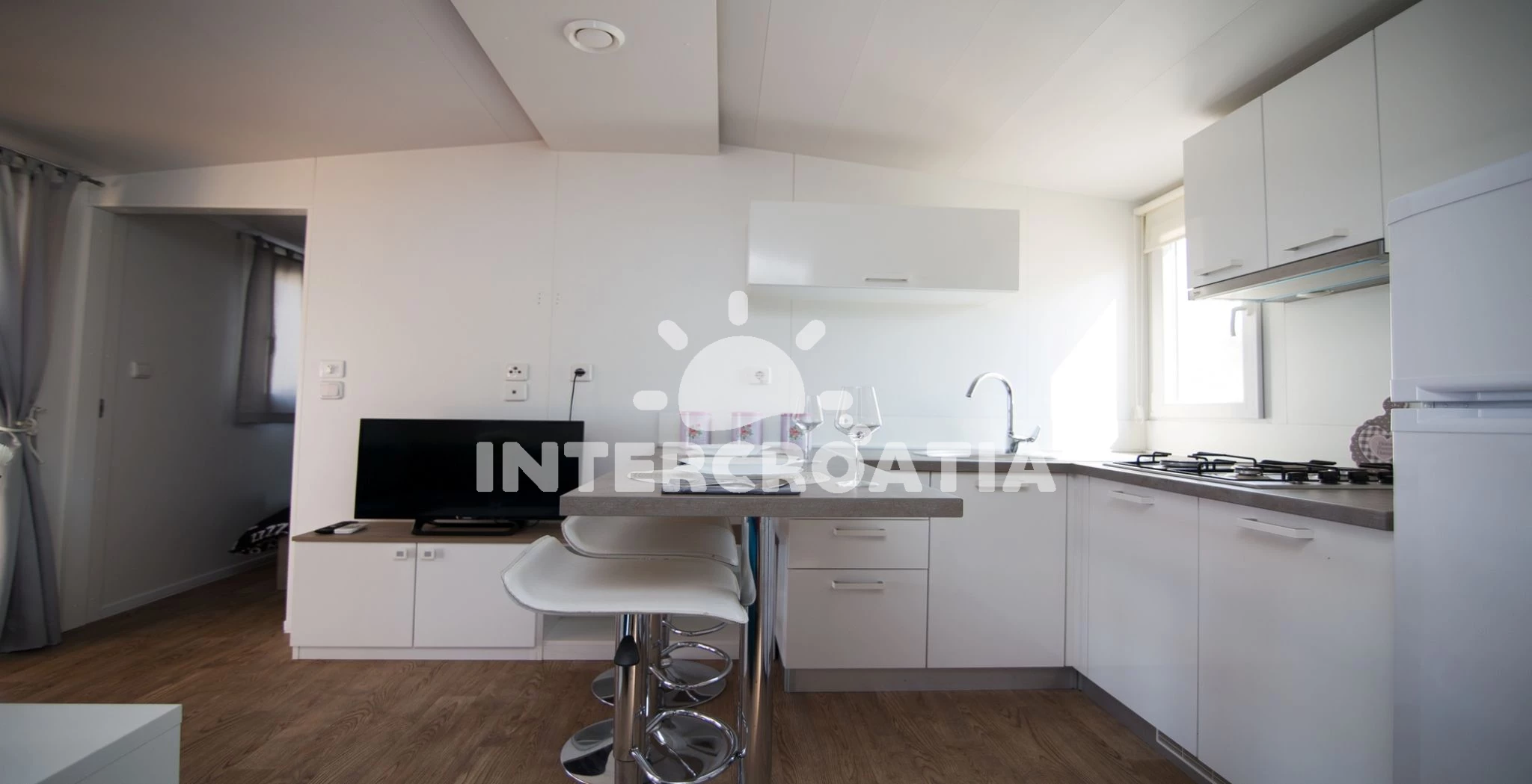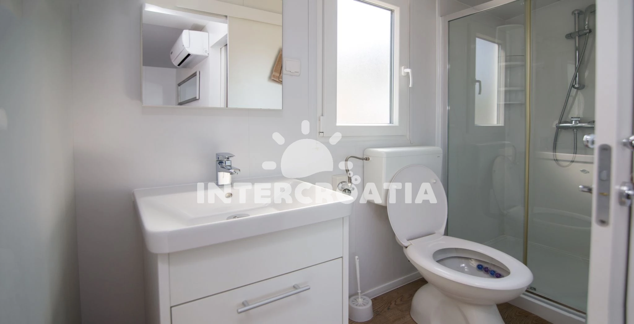 Mobilheim (32 m2) s výhledem na moře. Nachází se v přízemí objektu. Mobilheim má 2 ložnice a je vhodný pro až 6 osob. Kuchyňská linka je vybavena varnou deskou, nádobím, lednicí, mrazákem. V obývací…