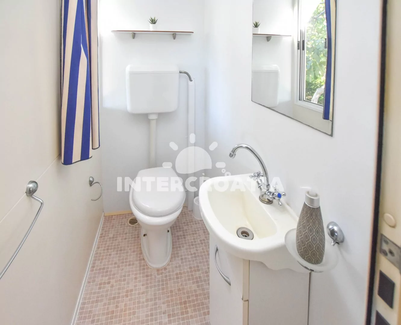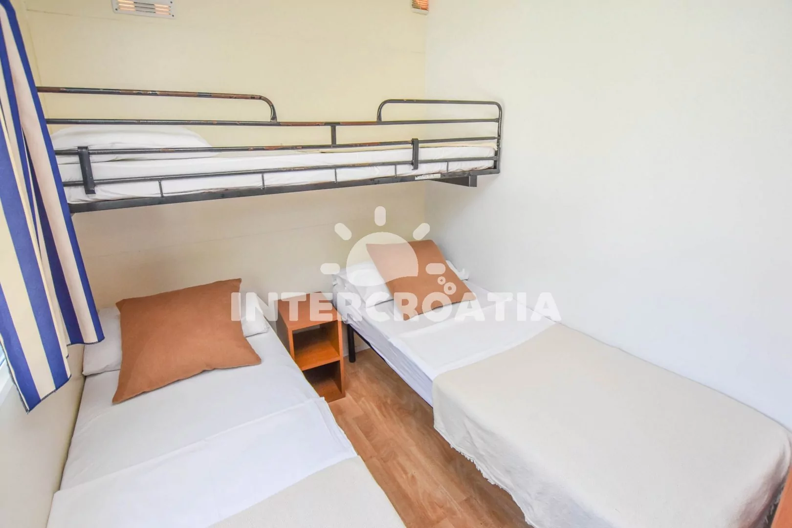 Přízemní domek (30 m2) s terasou a venkovním posezením. Dům má 2 ložnice a je vhodný pro až 5 osob. Obývací pokoj je spojený s kuchyní. Kuchyňská linka je vybavena varnou deskou, digestoří, mikrovlnnou troubou, rychlovarnou konvicí, kávovarem, nádobím a lednicí s mrazákem. Obývací pokoj s jídelním stolem pro 5 osob, televizí, klimatizací a vstupem na terasu. První ložnice s dvoulůžkem. Druhá ložnice s dvěma jednolůžky a jedním patrovým lůžkem. Koupelna se sprchovým koutem, umyvadlem a wc. Hostům je k dispozici parkování u objektu zdarma.