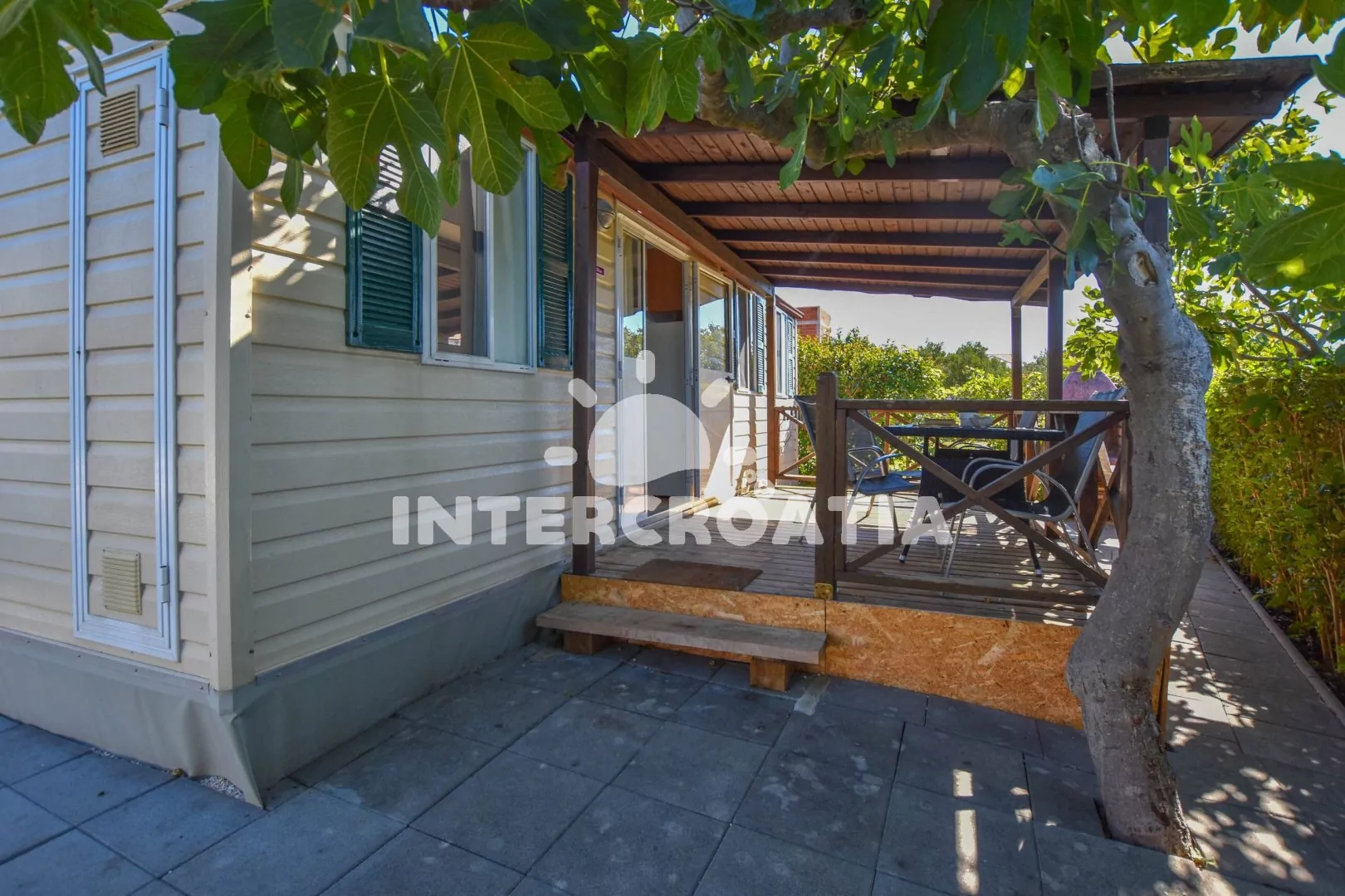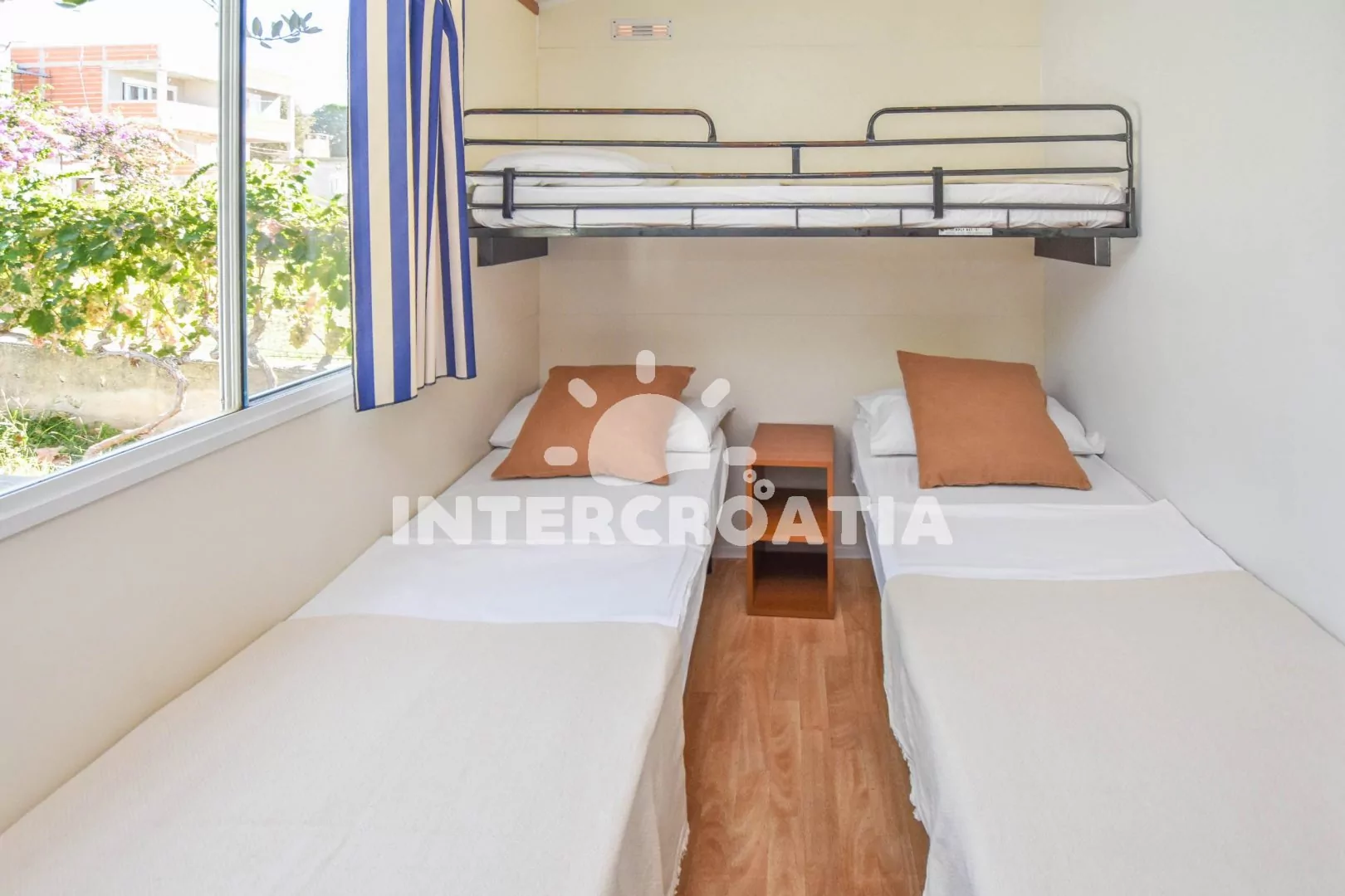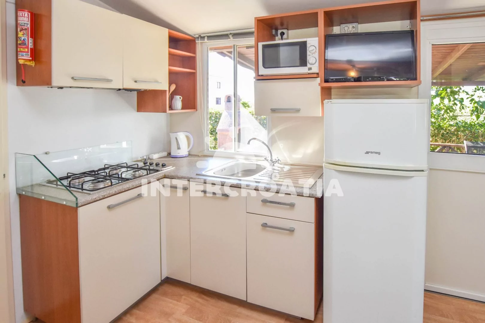 Přízemní domek (30 m2) s terasou a venkovním posezením. Dům má 2 ložnice a je vhodný pro až 5 osob. Obývací pokoj je spojený s kuchyní. Kuchyňská linka je vybavena varnou deskou, digestoří, mikrovlnnou troubou, rychlovarnou konvicí, kávovarem, nádobím a lednicí s mrazákem. Obývací pokoj s jídelním stolem pro 5 osob, televizí, klimatizací a vstupem na terasu. První ložnice s dvoulůžkem. Druhá ložnice s dvěma jednolůžky a jedním patrovým lůžkem. Koupelna se sprchovým koutem, umyvadlem a wc. Hostům je k dispozici parkování u objektu zdarma.