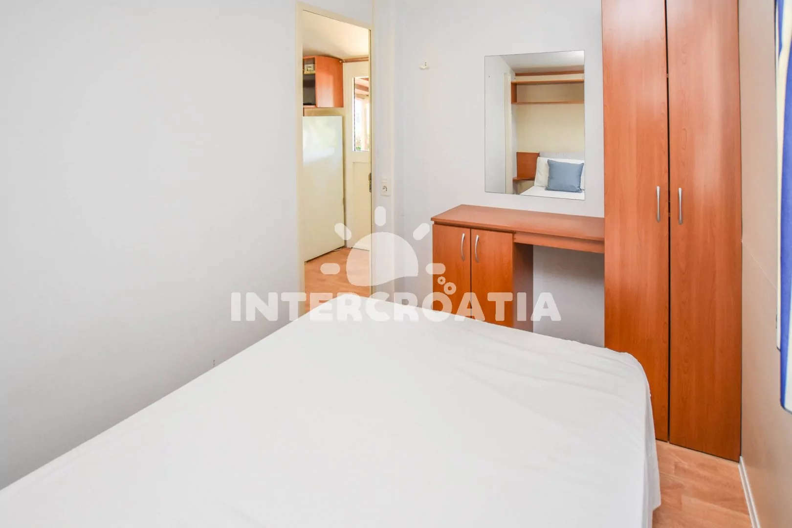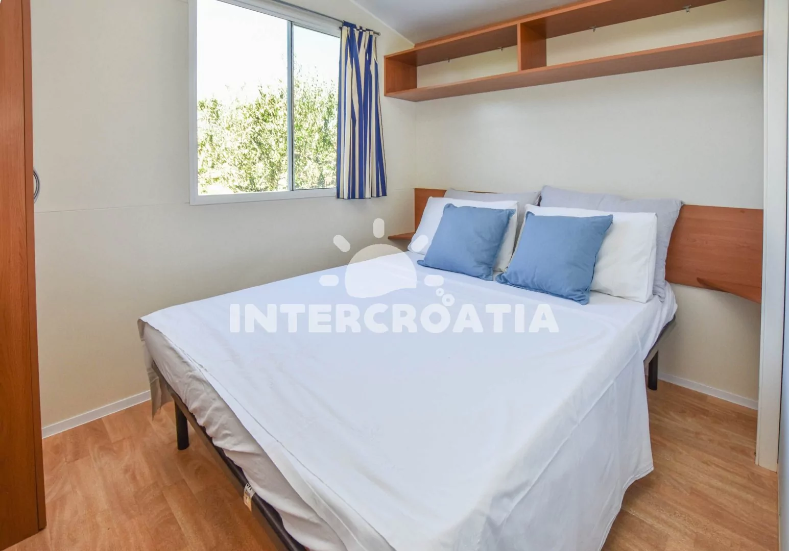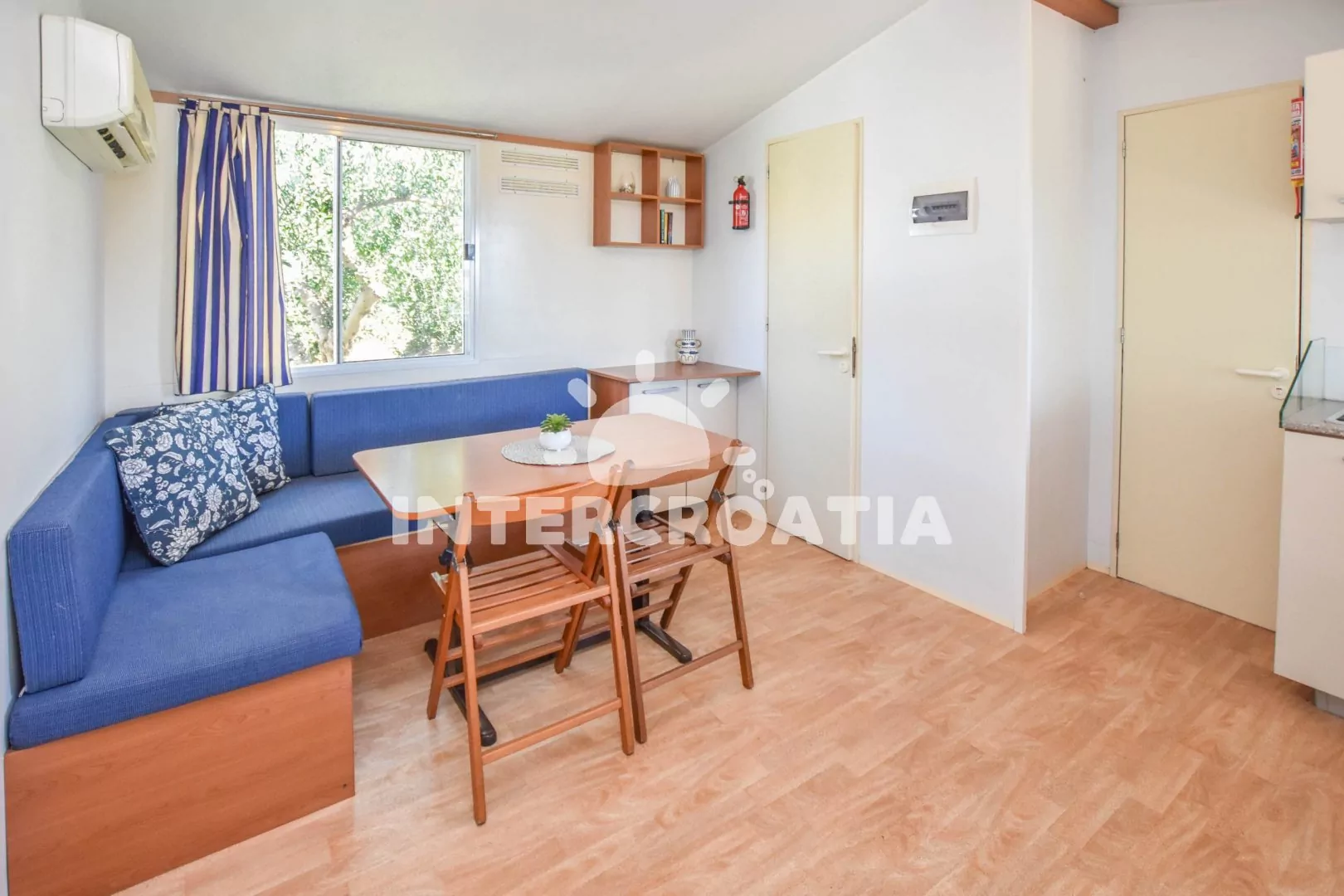 Přízemní domek (30 m2) s terasou a venkovním posezením. Dům má 2 ložnice a je vhodný pro až 5 osob. Obývací pokoj je spojený s kuchyní. Kuchyňská linka je vybavena varnou deskou, digestoří, mikrovlnnou troubou, rychlovarnou konvicí, kávovarem, nádobím a lednicí s mrazákem. Obývací pokoj s jídelním stolem pro 5 osob, televizí, klimatizací a vstupem na terasu. První ložnice s dvoulůžkem. Druhá ložnice s dvěma jednolůžky a jedním patrovým lůžkem. Koupelna se sprchovým koutem, umyvadlem a wc. Hostům je k dispozici parkování u objektu zdarma.