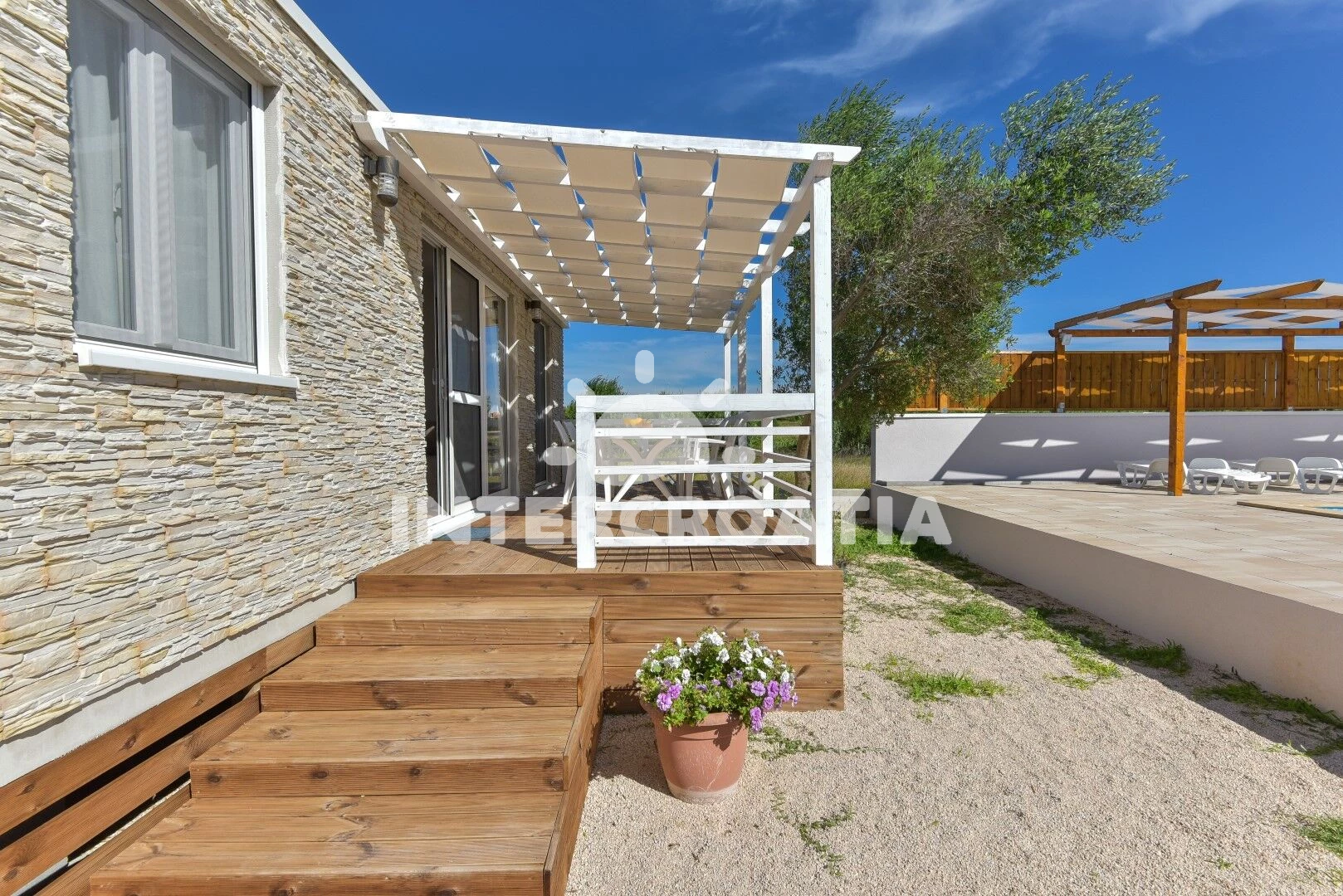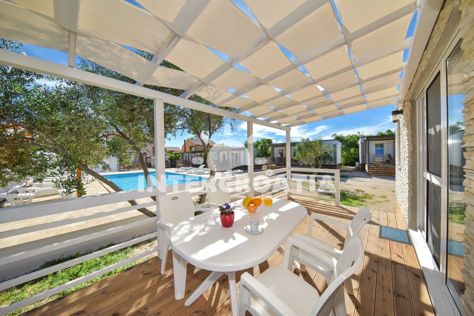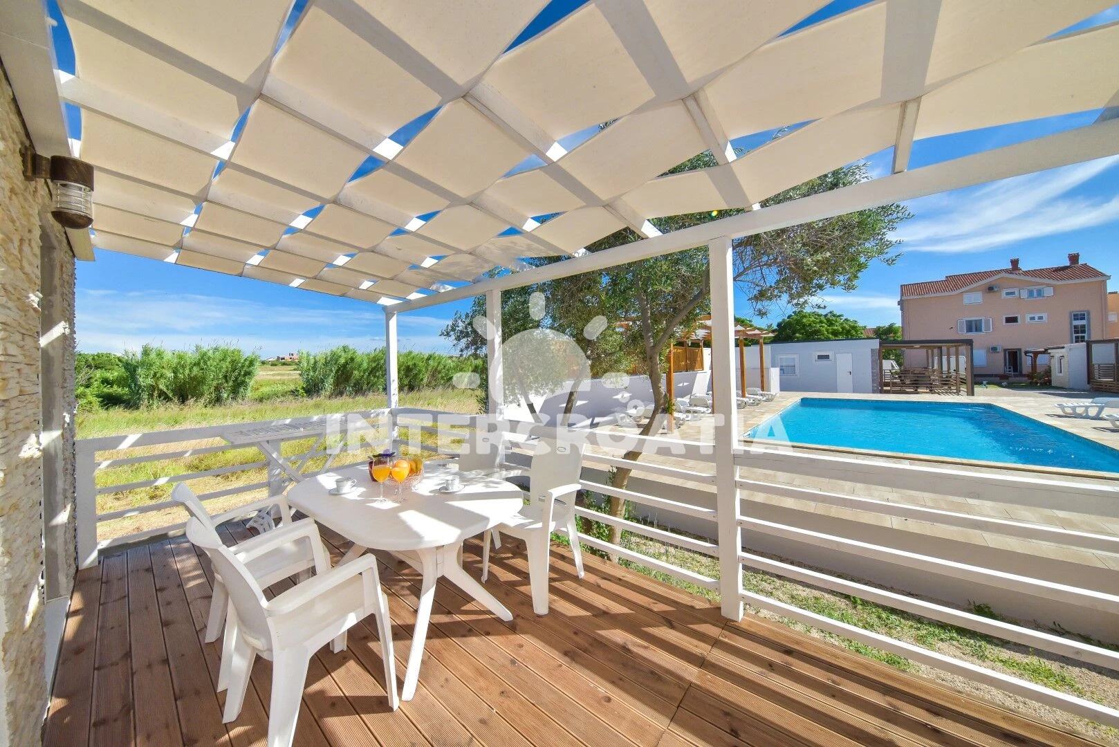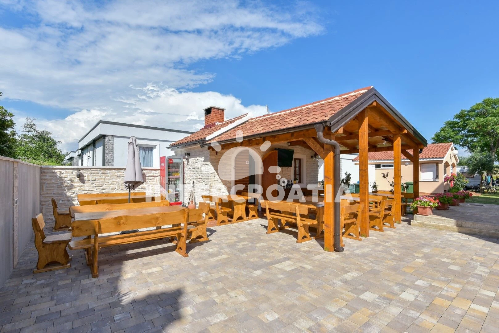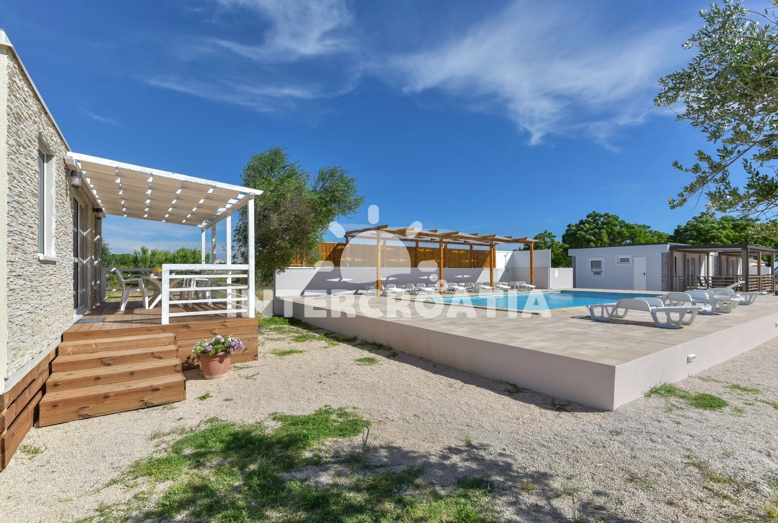 Rekreační areál se nachází 50 m od moře a pláže. Pláž je oblázková a větší kamení. Rekreační areál disponuje bazénem s lehátky pro ubytované hosty. U objektu je k dispozici společná zahrada s posezením a grilem.