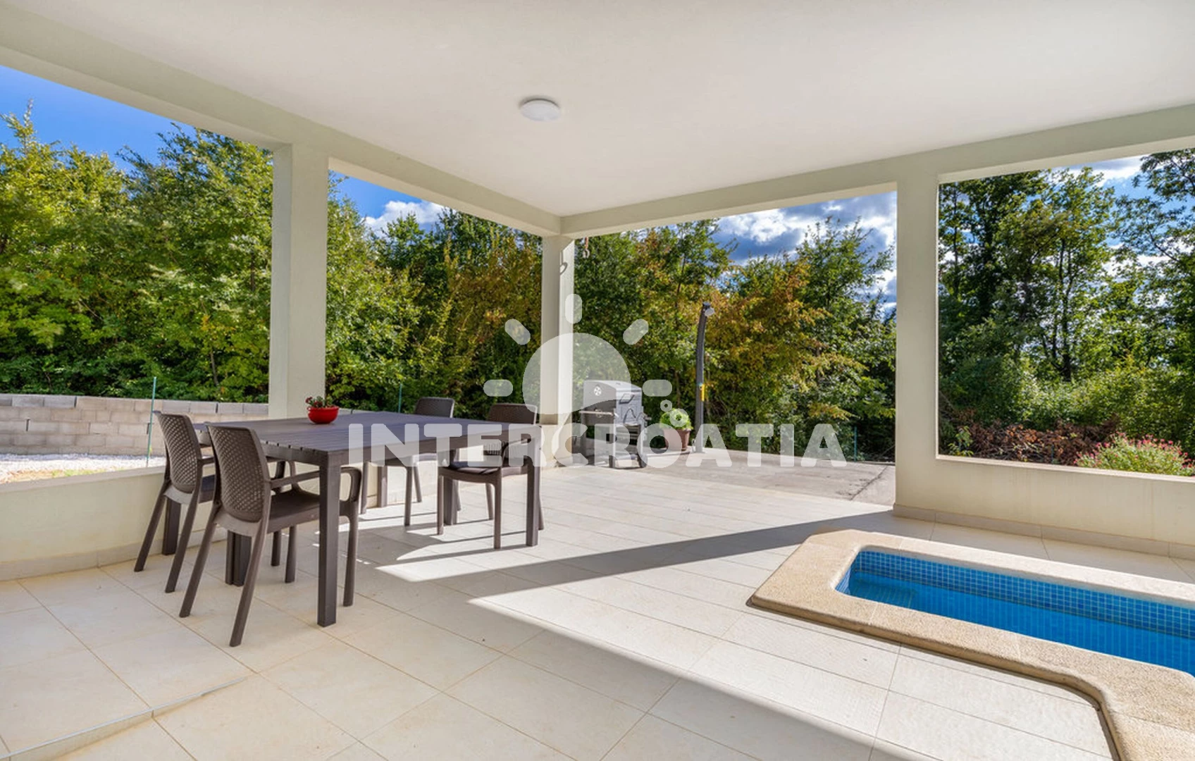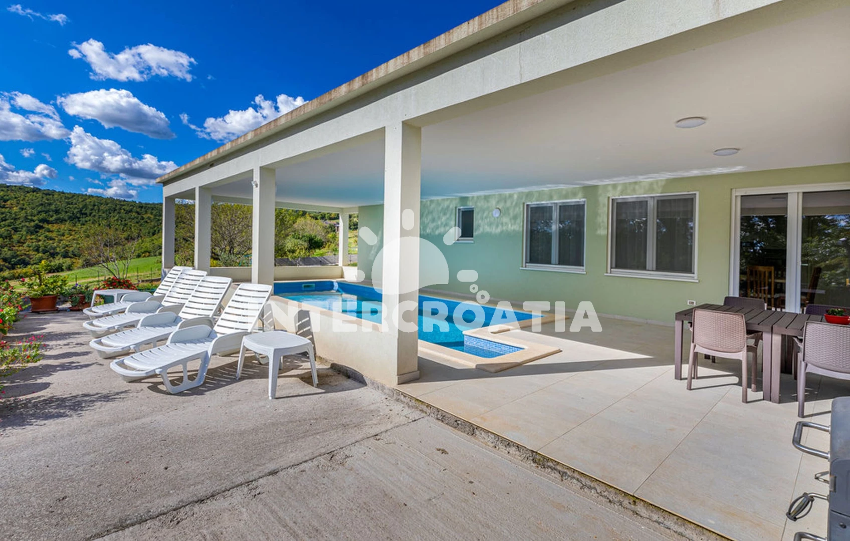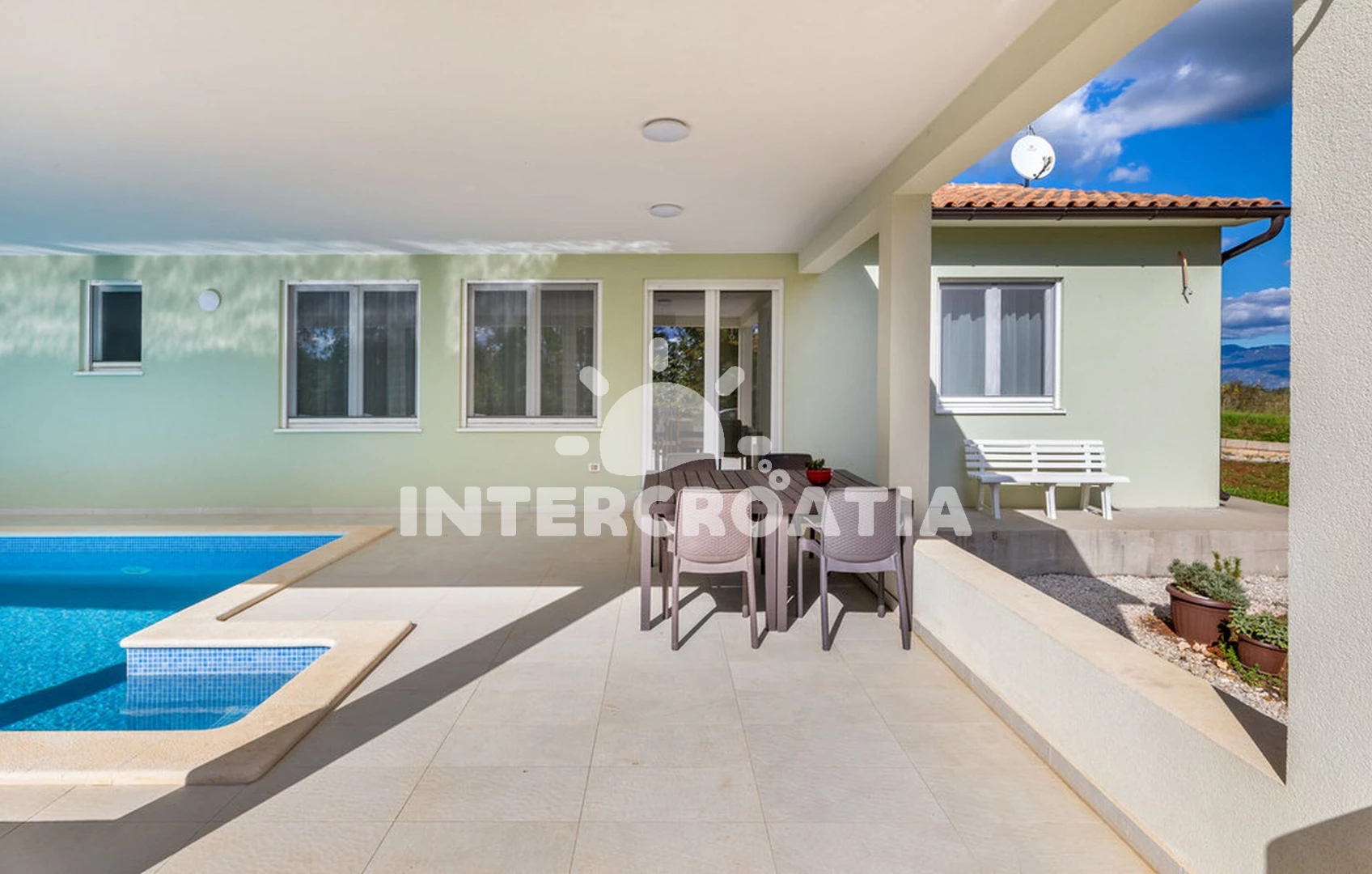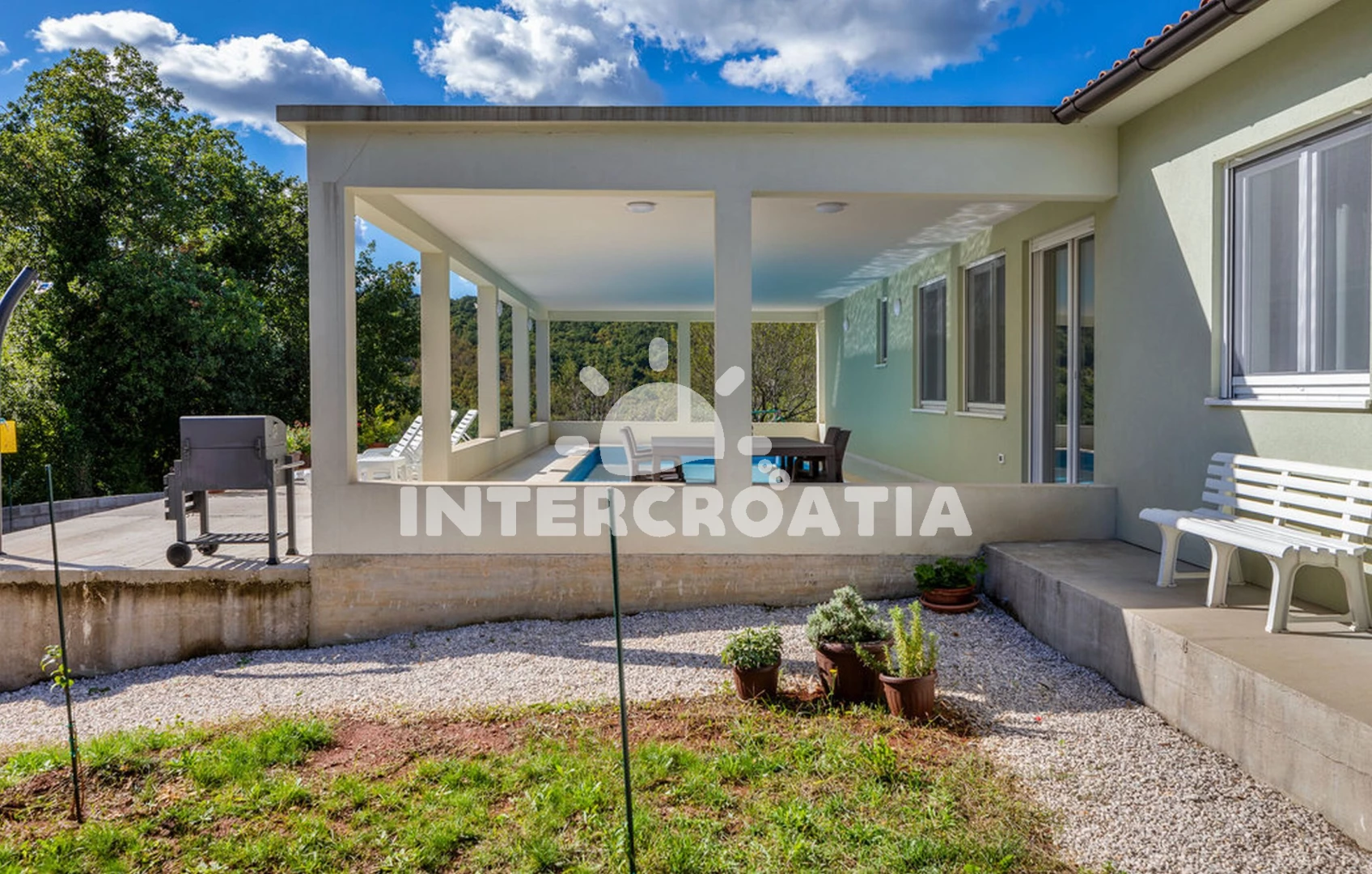 Vila se nachází 15000 m od moře a pláže. Pláž je skalnatá a oblázková. Vila disponuje bazénem s lehátky pro ubytované hosty. K dispozici posilovna. U objektu je k dispozici společná zahrada s posezením a grilem.