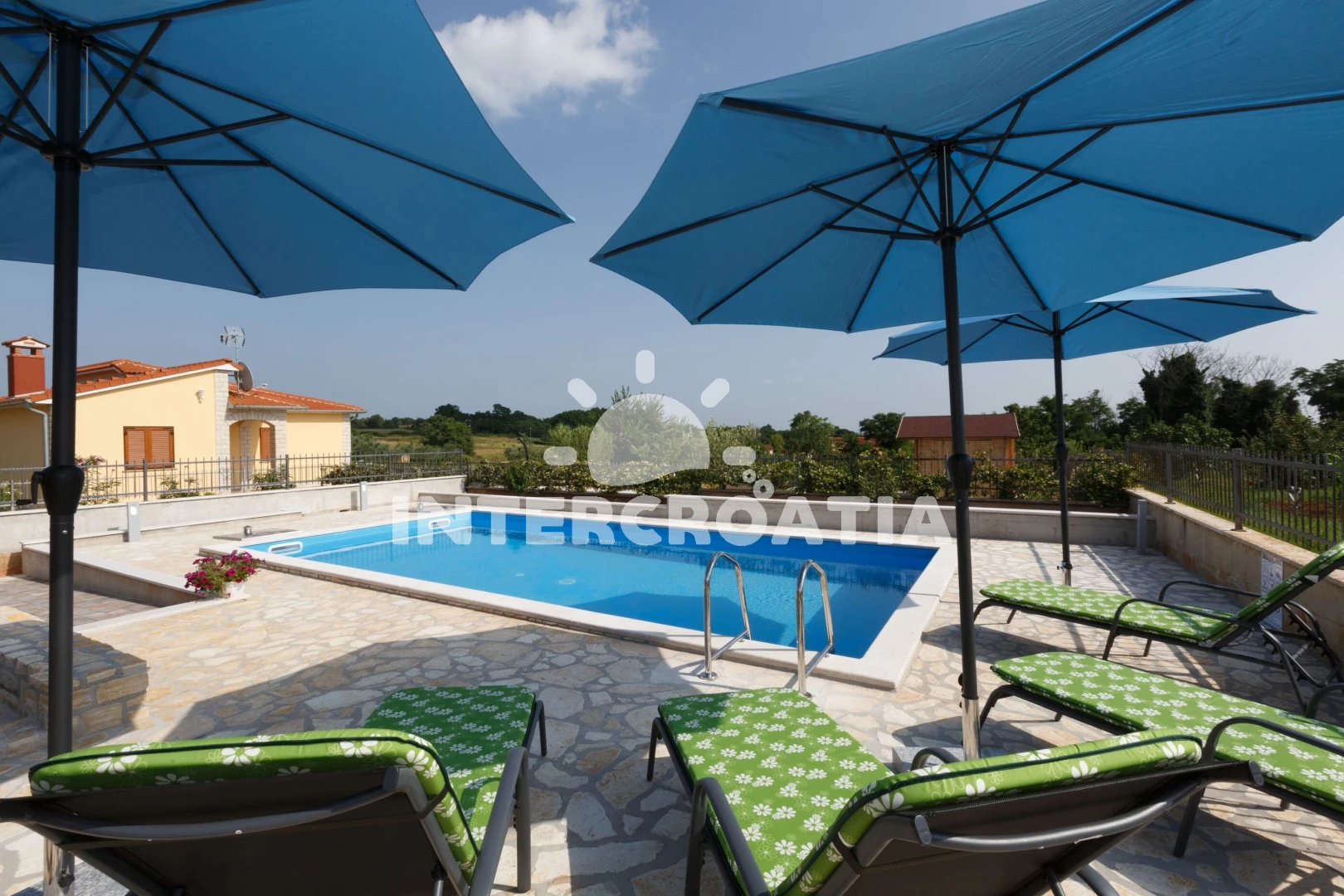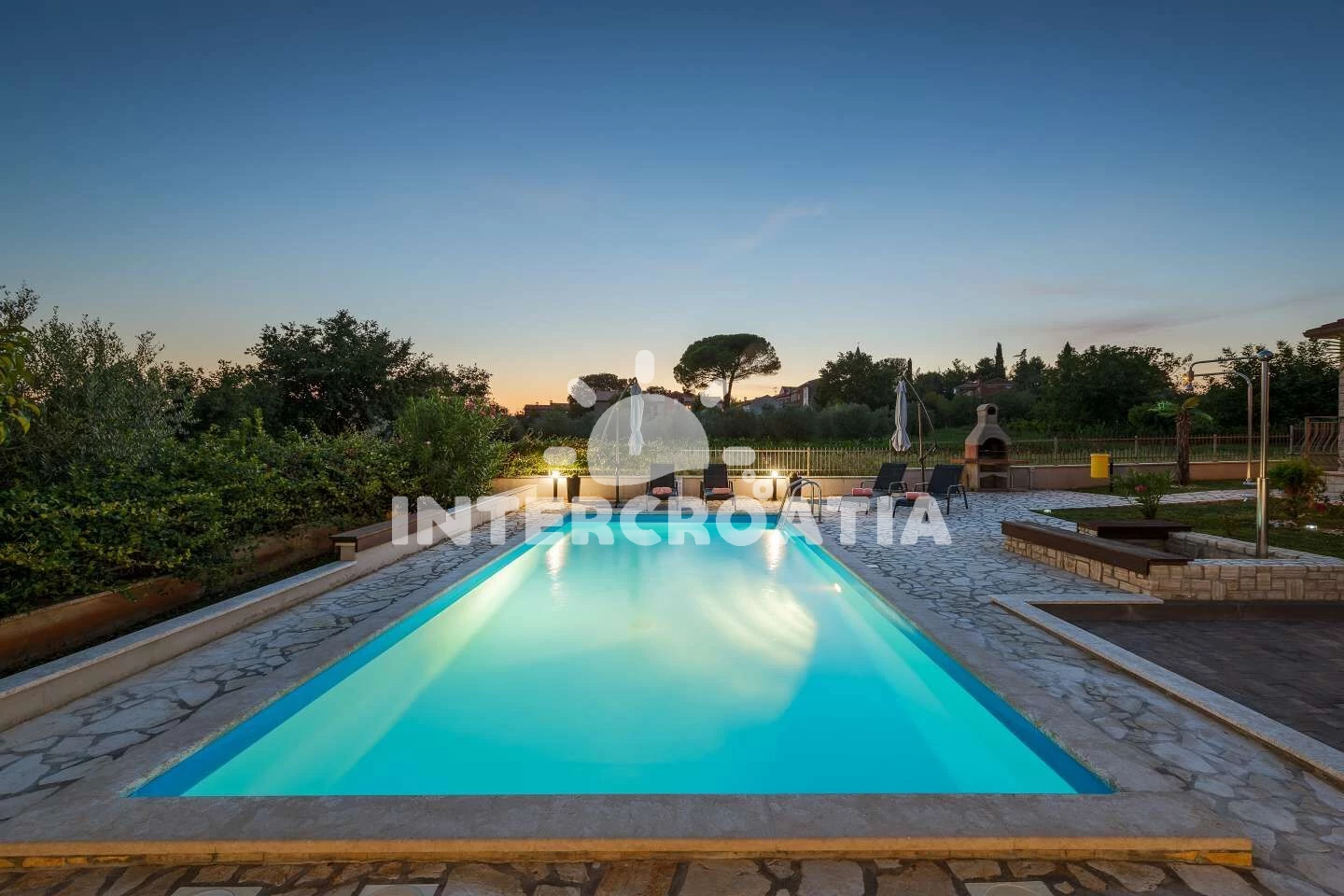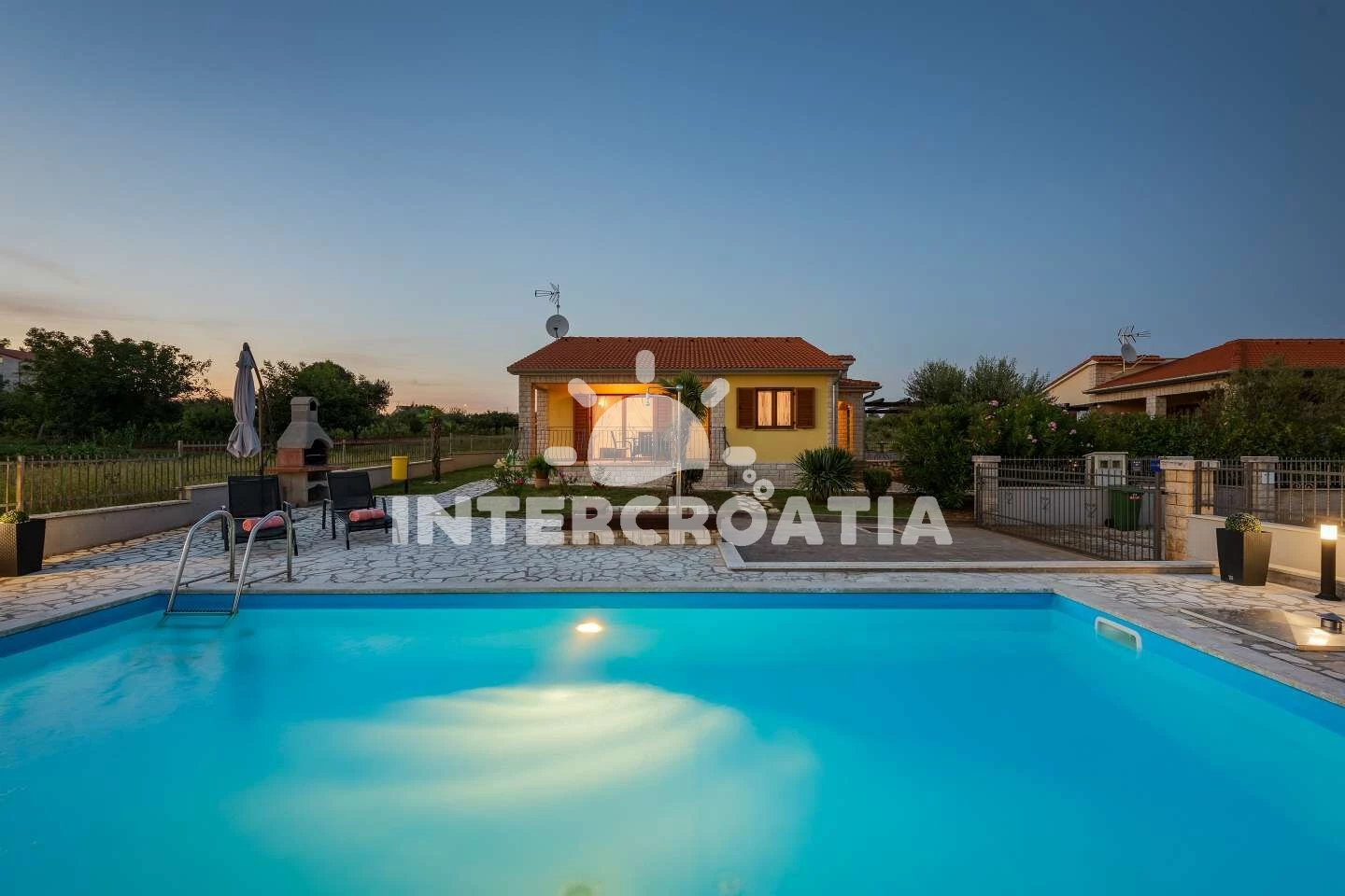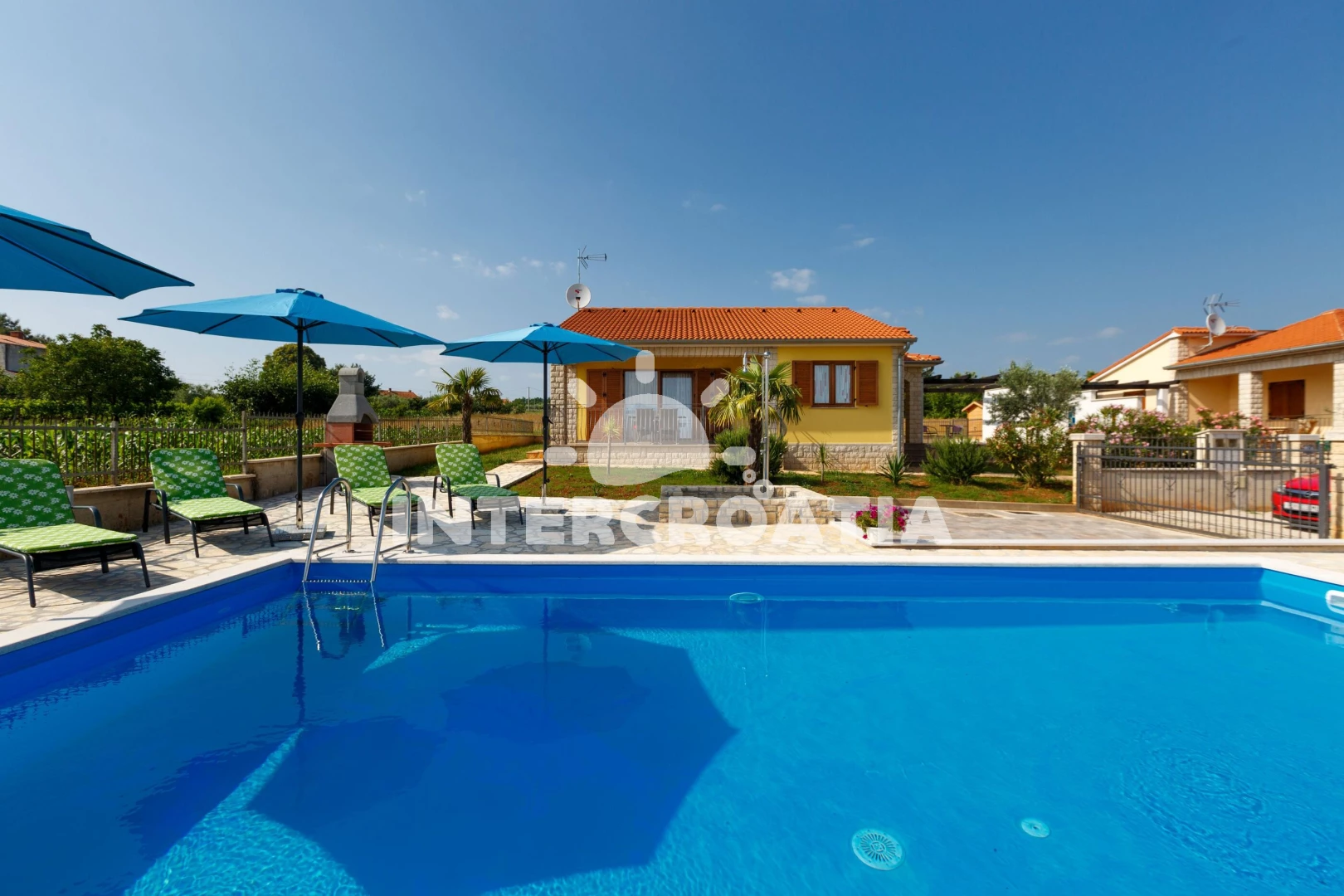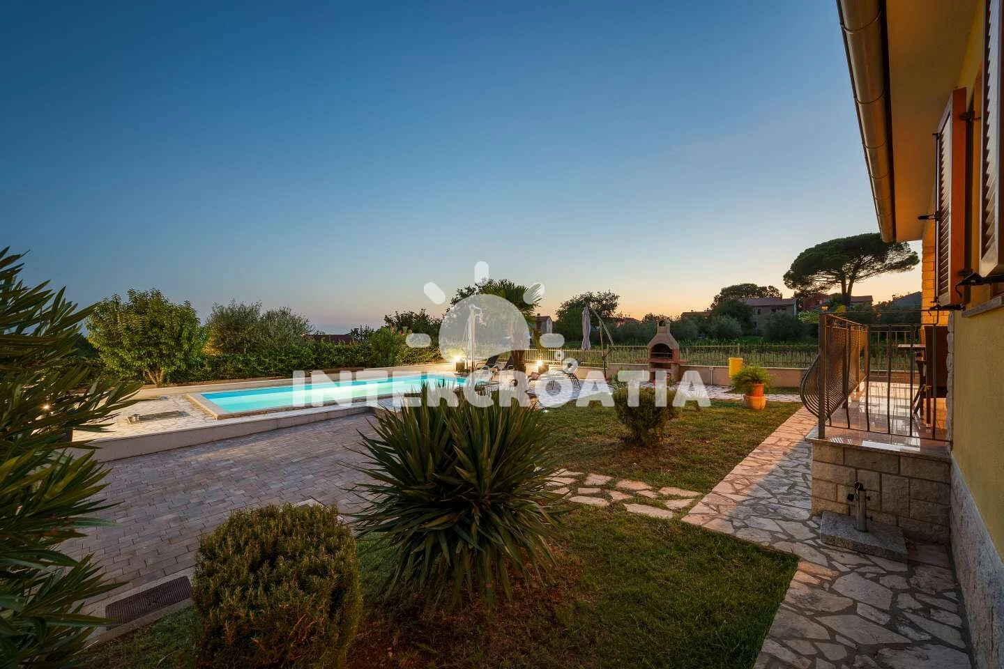 Vila se nachází 8000 m od moře a pláže. Pláž je oblázková a betonové desky. Vila disponuje bazénem s lehátky pro ubytované hosty. U objektu je k dispozici společná zahrada s posezením a grilem. Parkování je před domem.