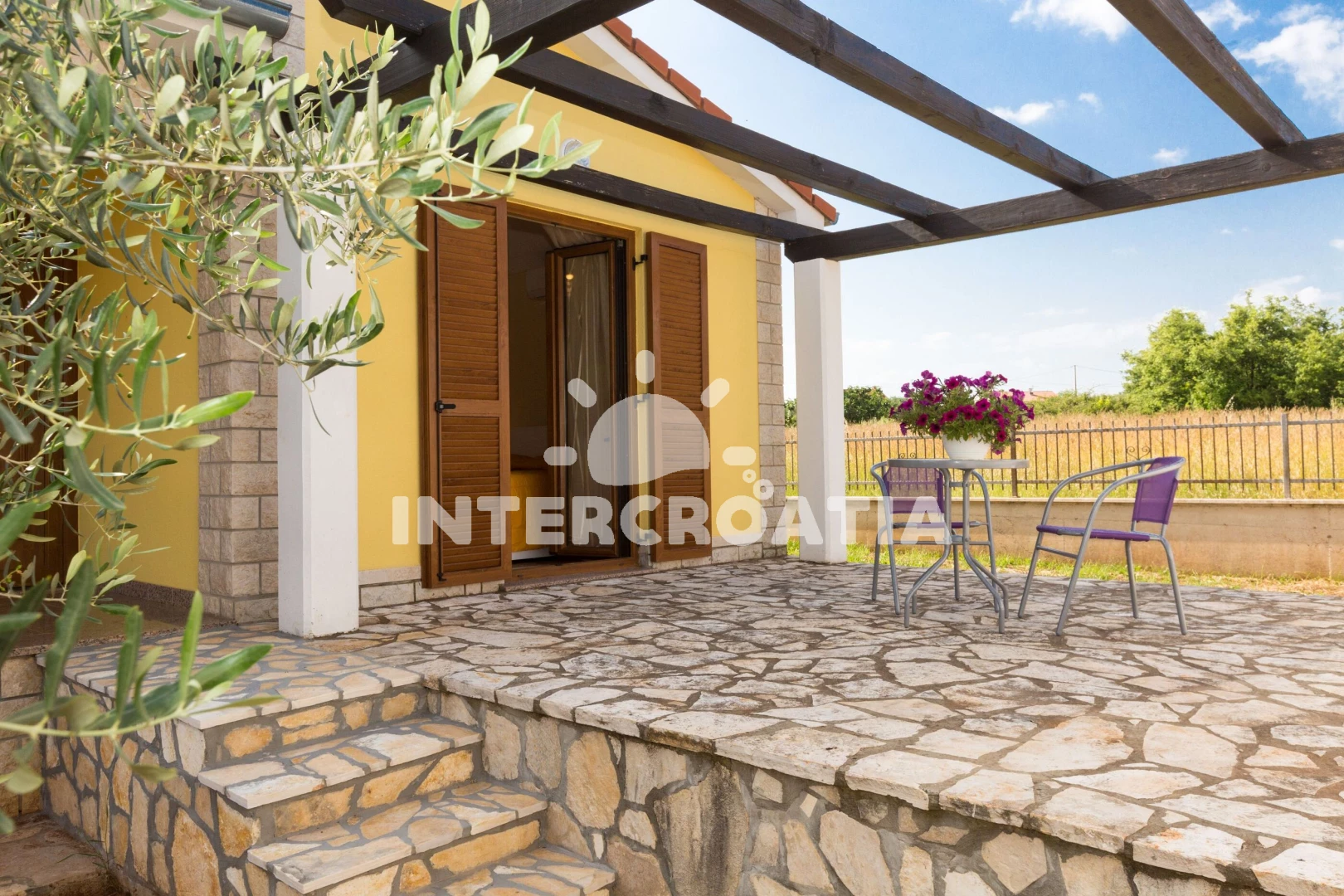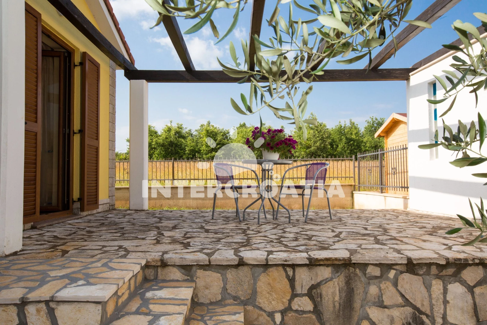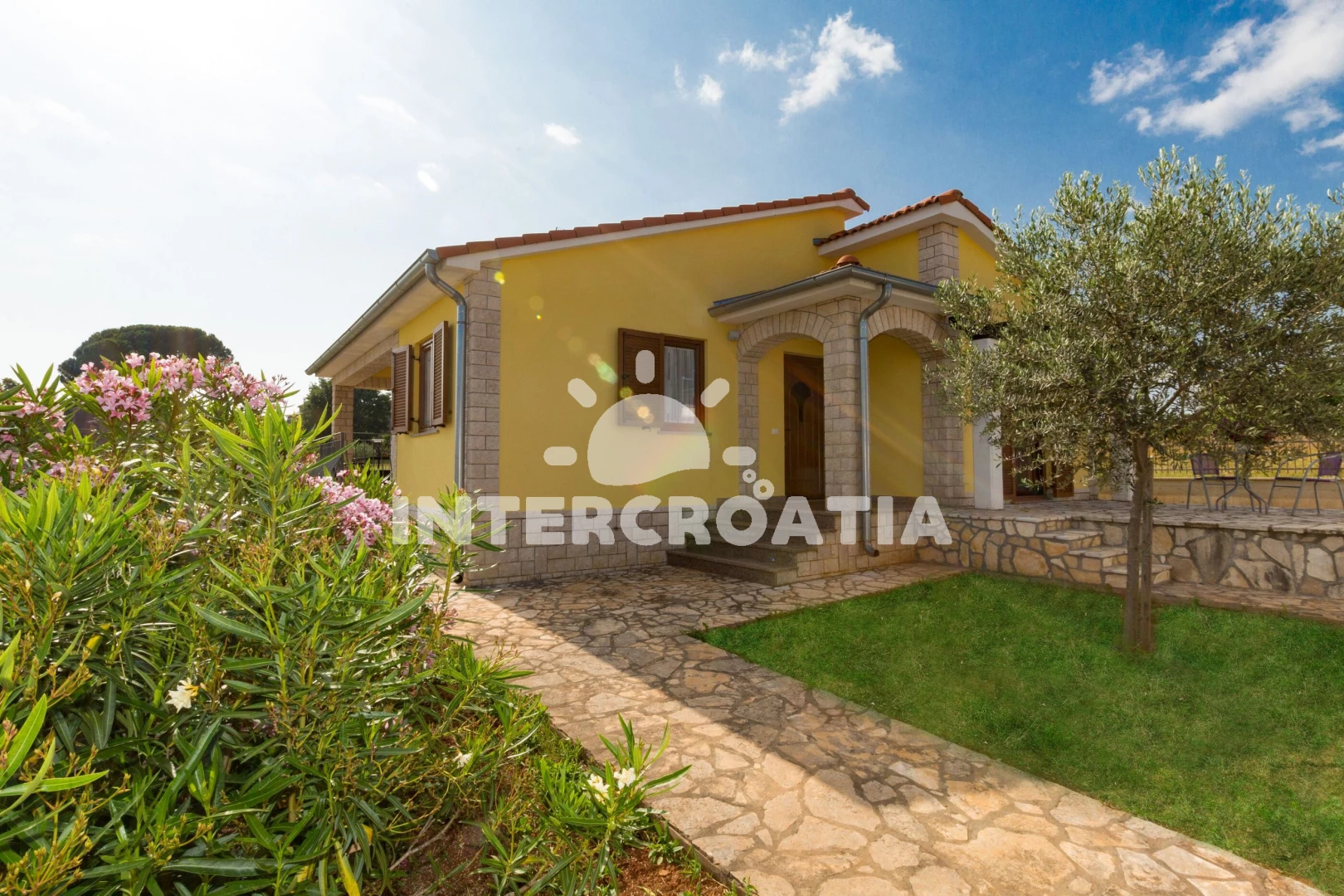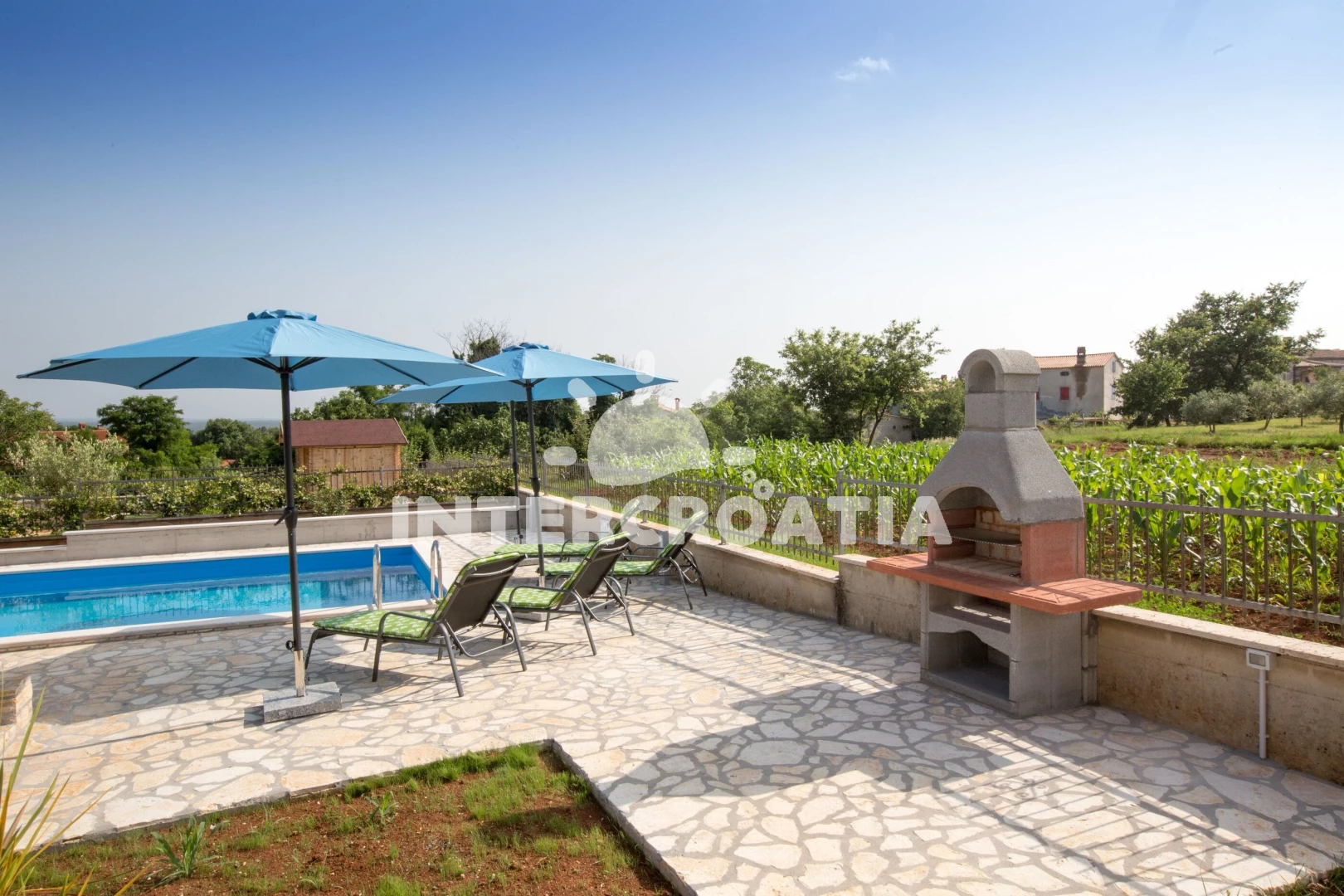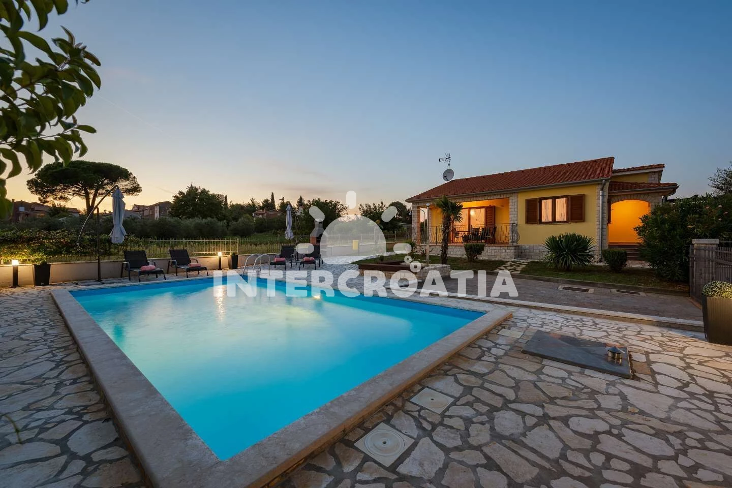Vila se nachází 8000 m od moře a pláže. Pláž je oblázková a betonové desky. Vila disponuje bazénem s lehátky pro ubytované hosty. U objektu je k dispozici společná zahrada s posezením a grilem. Parkování je před domem.