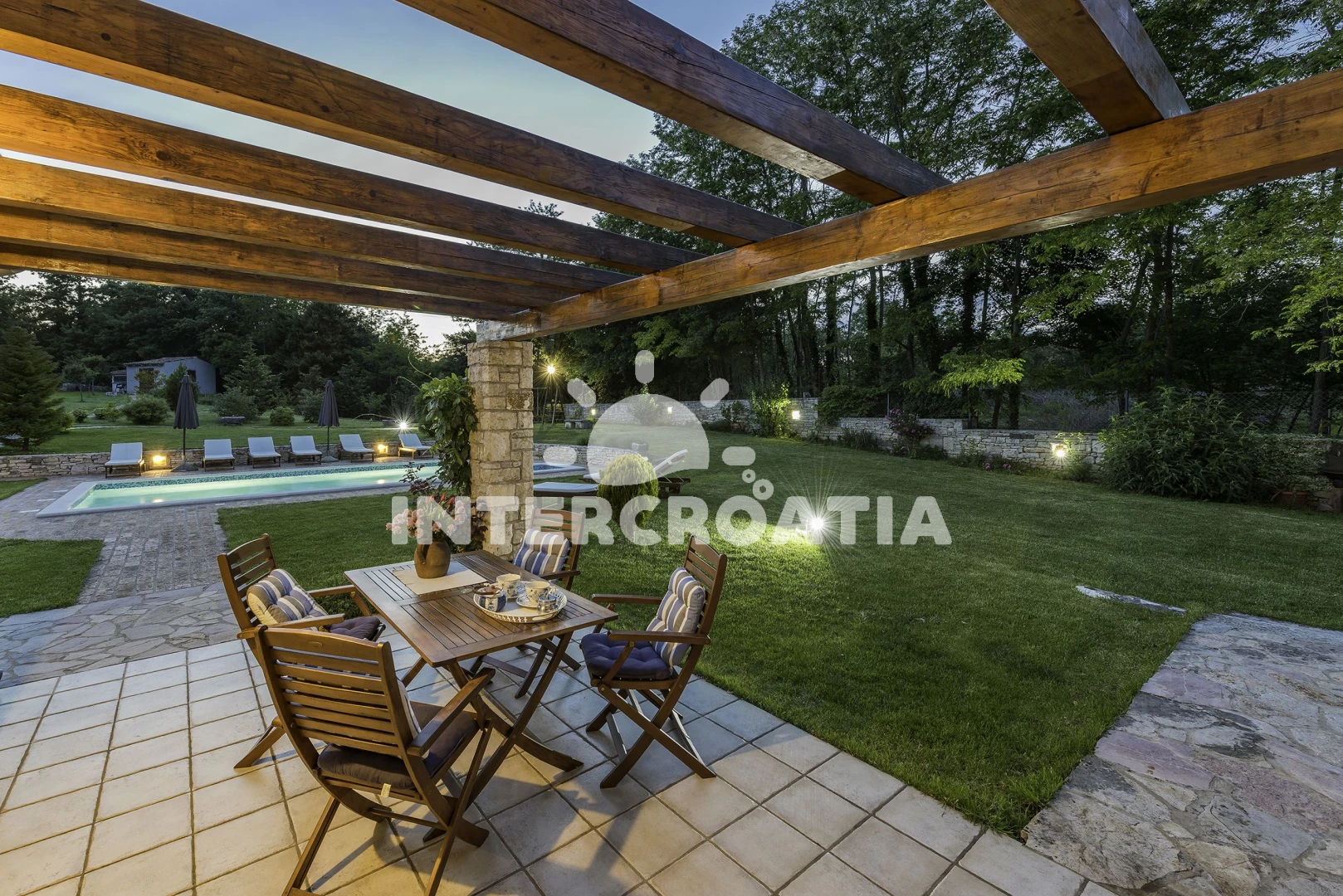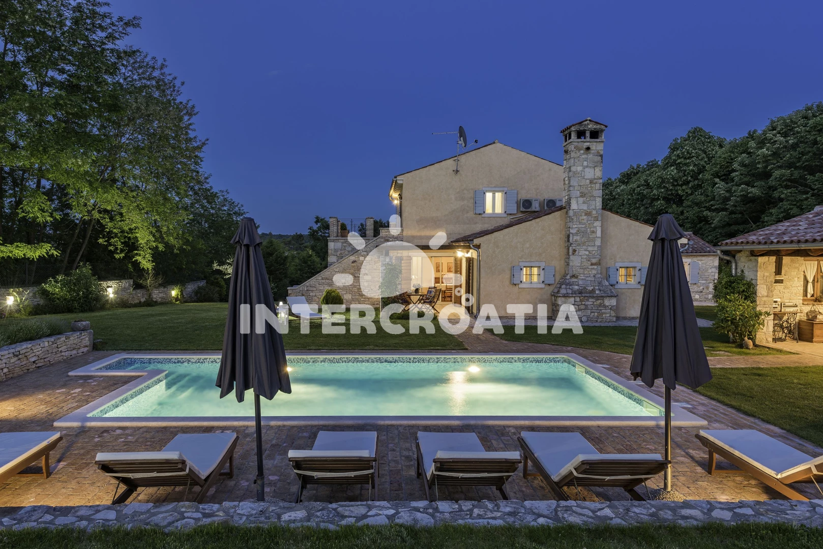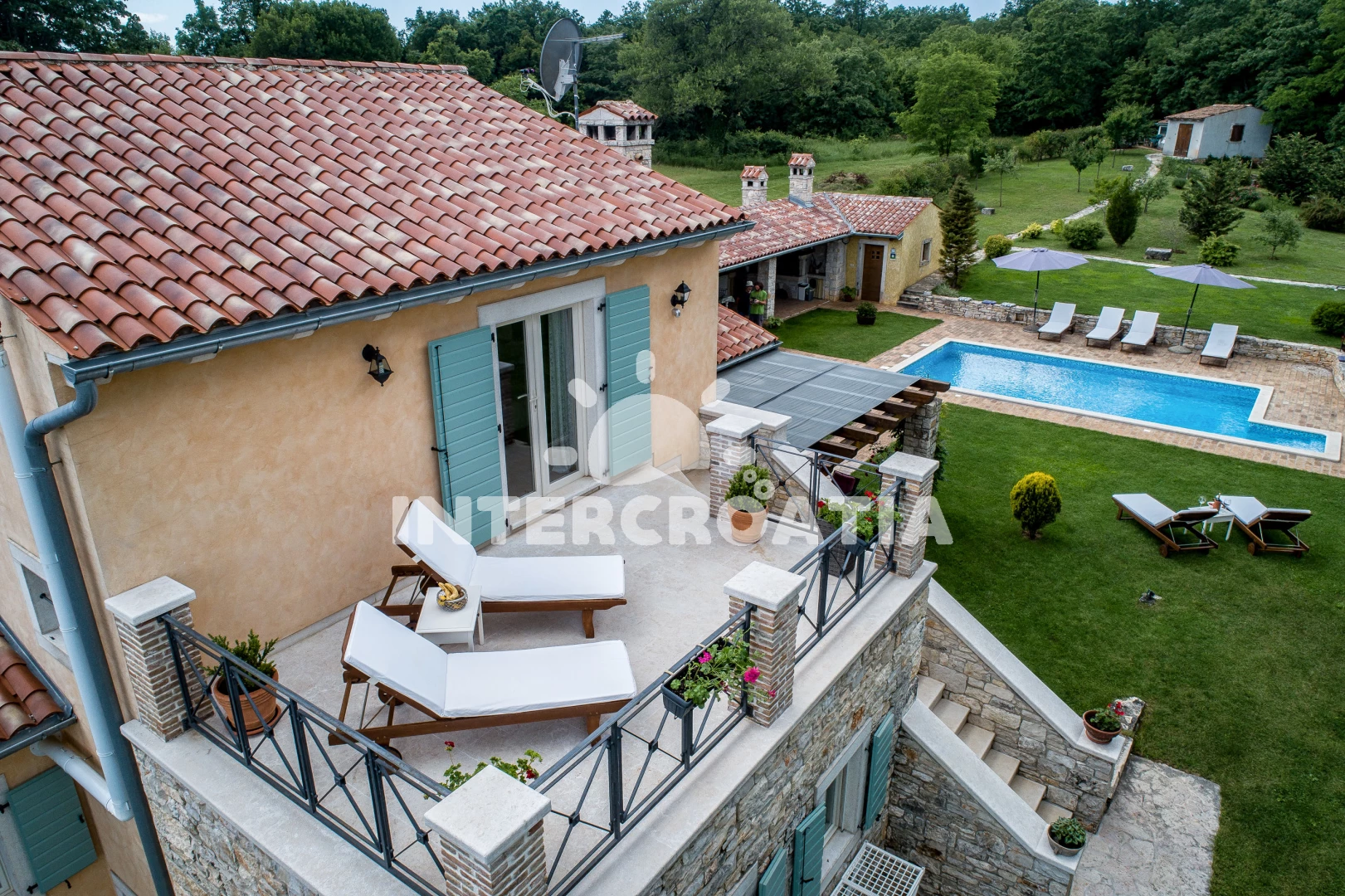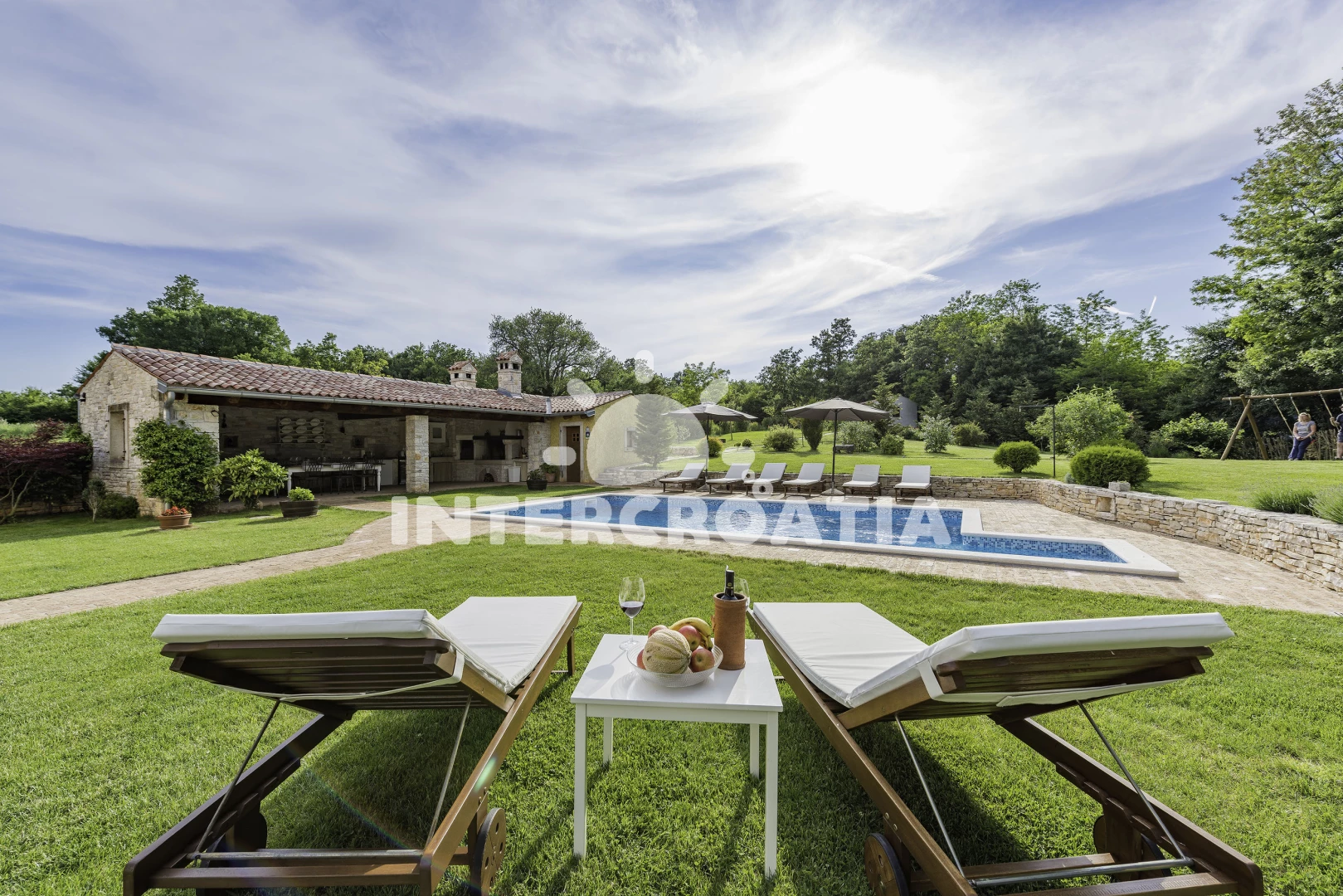 Vila se nachází 7000 m od moře a pláže. Pláž je skalnatá, oblázková a větší kamení. Vila disponuje bazénem s lehátky pro ubytované hosty. K dispozici sauna. U objektu je k dispozici společná zahrada s posezením a grilem. Parkování je před domem.