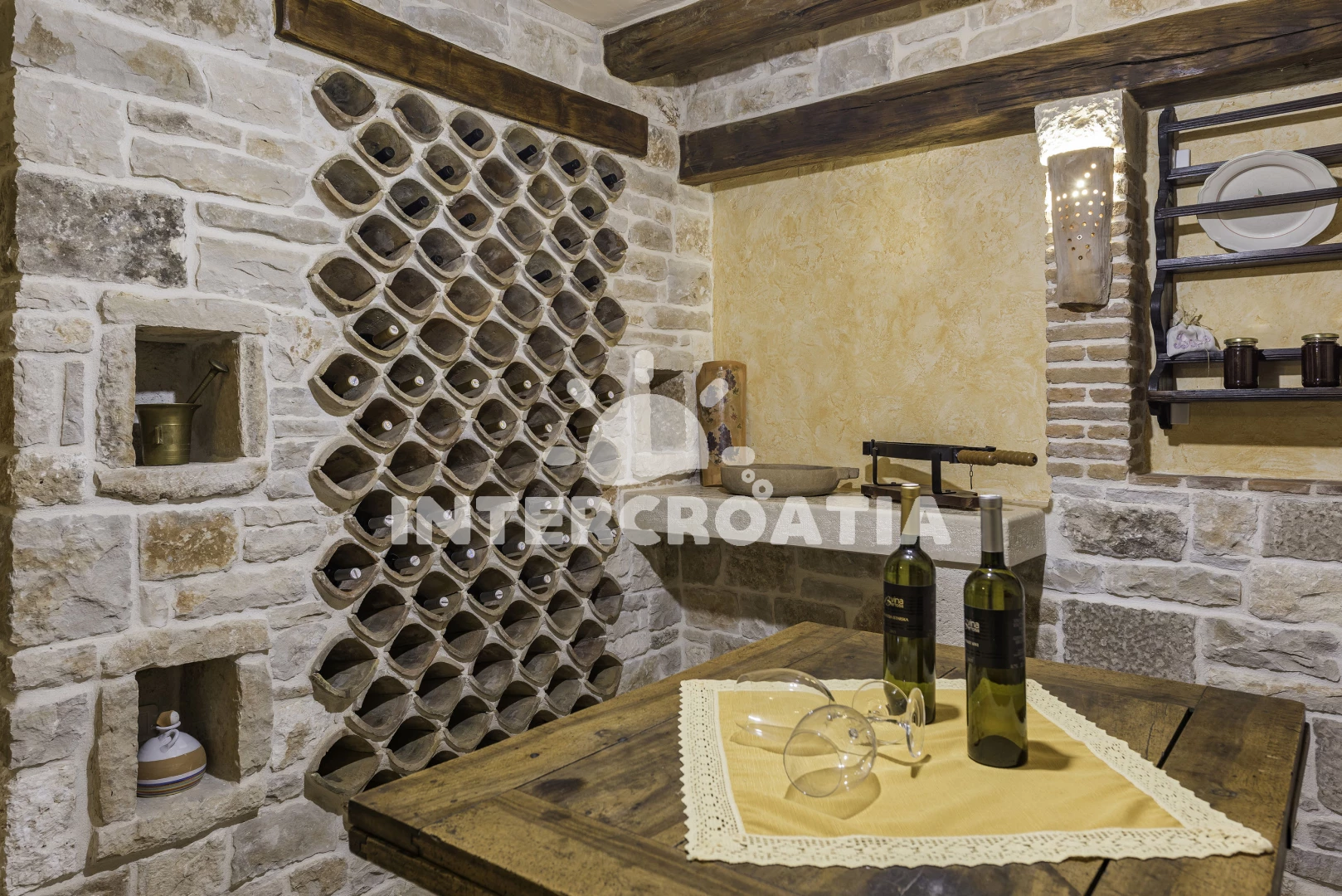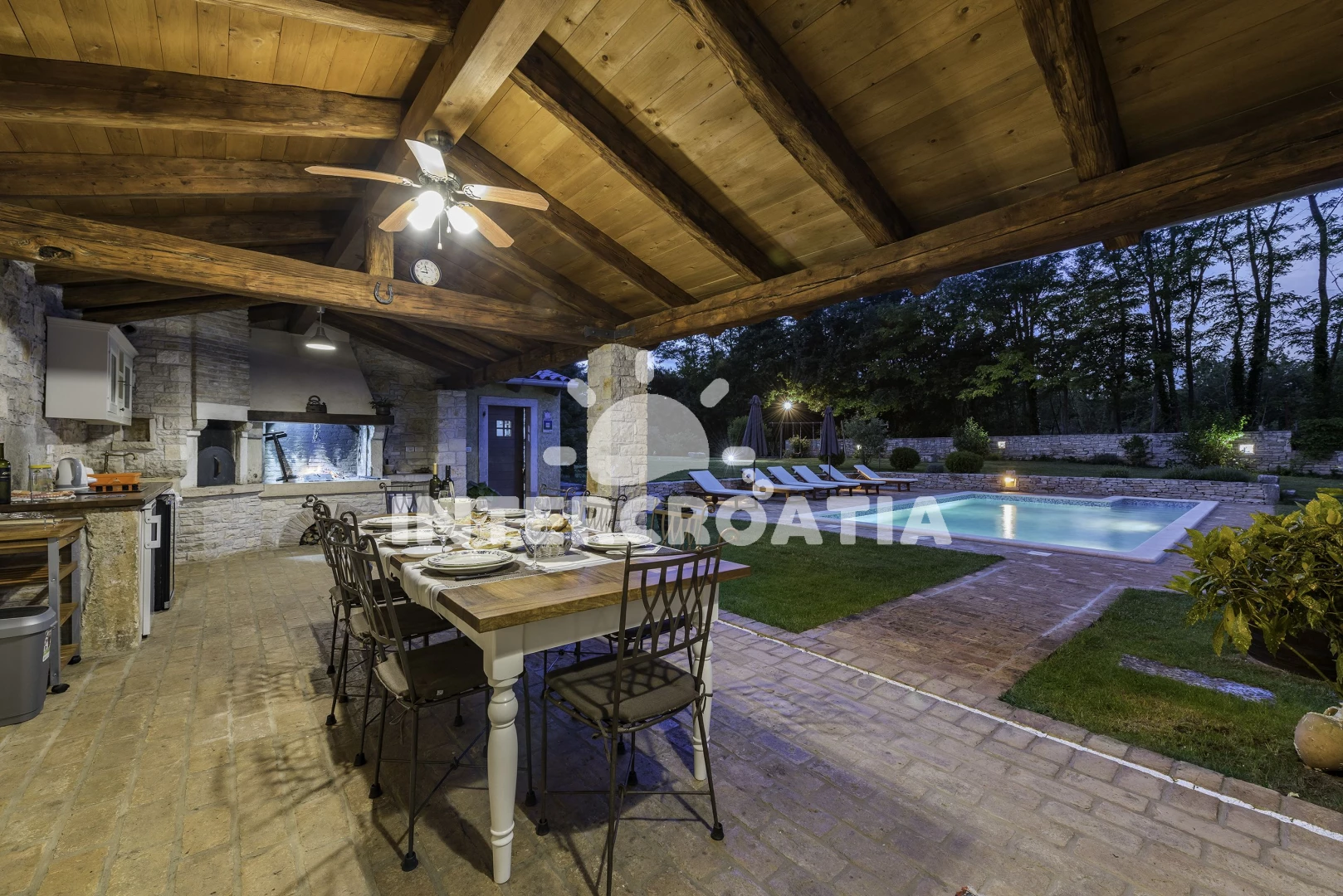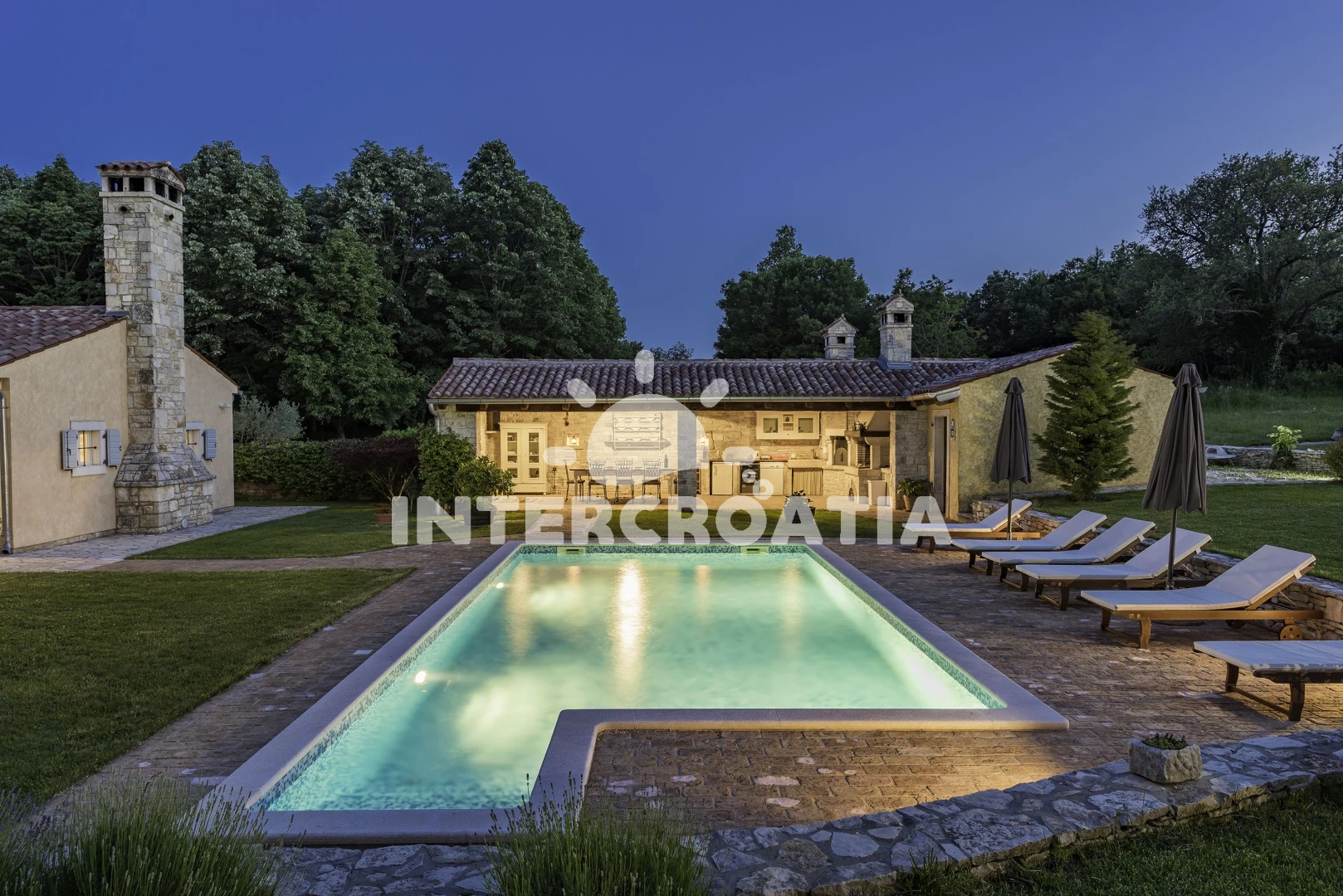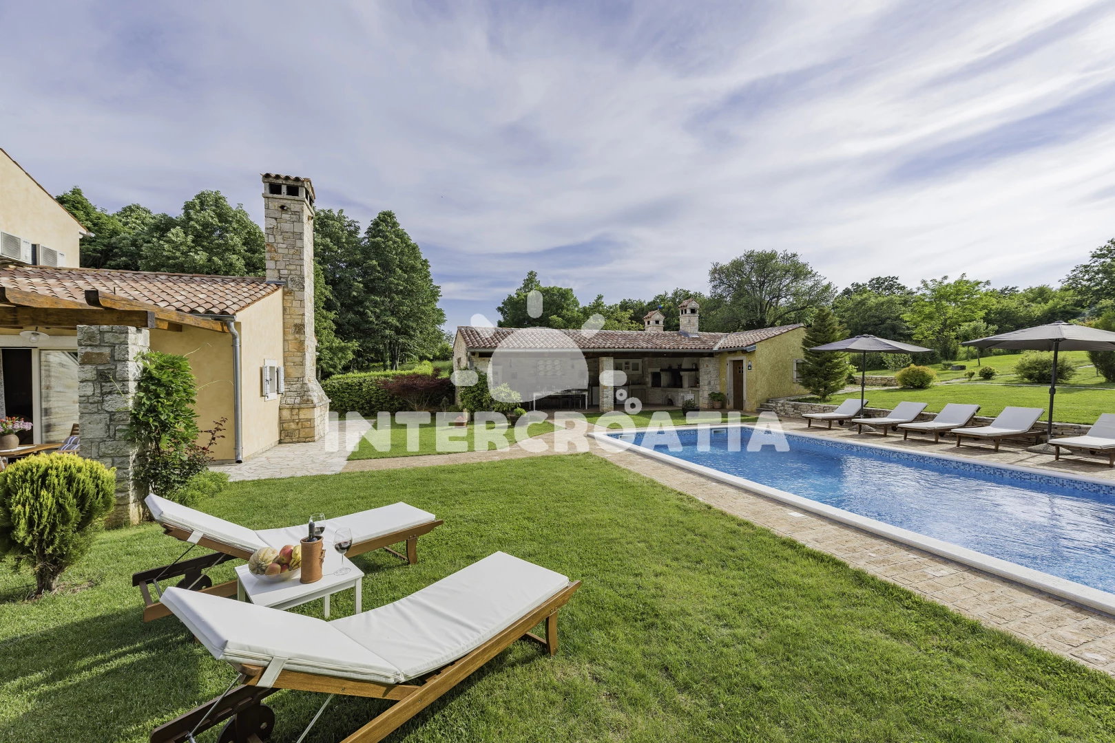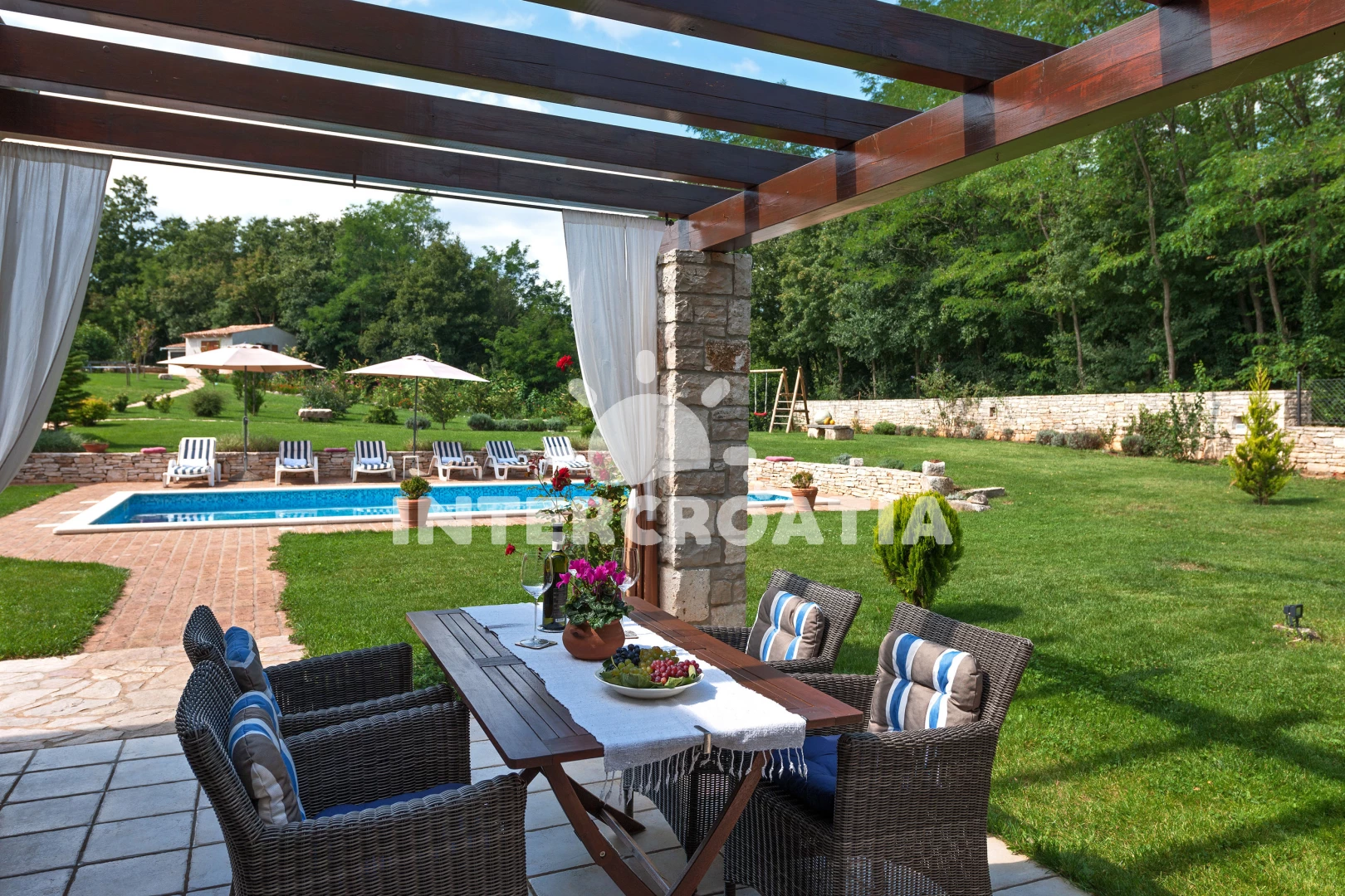 Vila se nachází 7000 m od moře a pláže. Pláž je skalnatá, oblázková a větší kamení. Vila disponuje bazénem s lehátky pro ubytované hosty. K dispozici sauna. U objektu je k dispozici společná zahrada s posezením a grilem. Parkování je před domem.