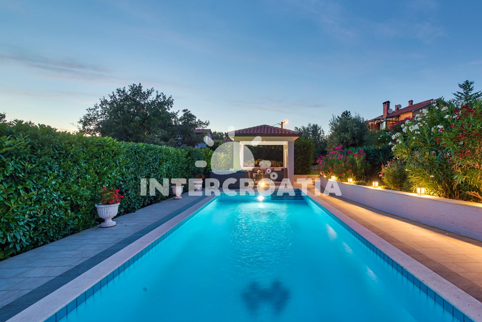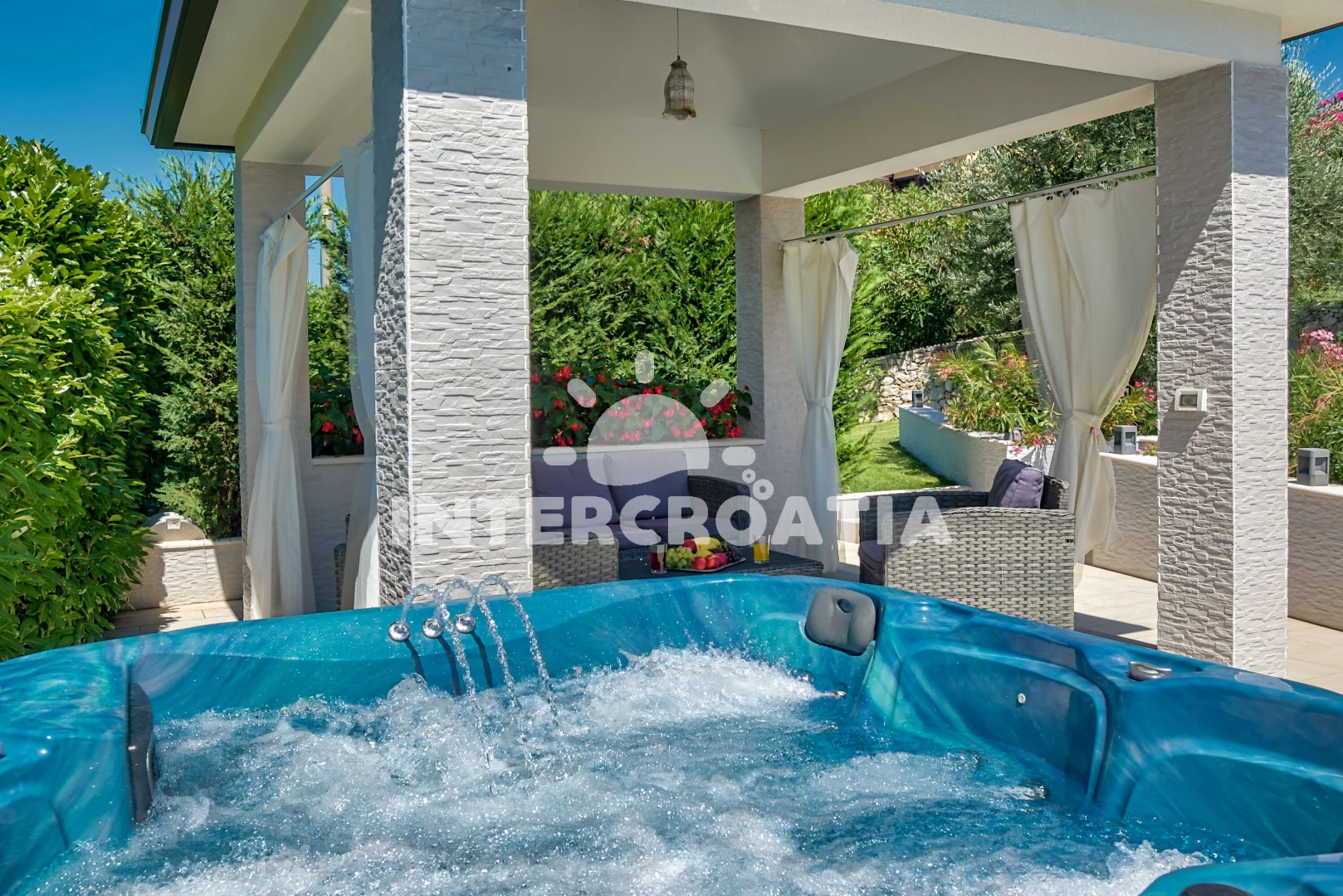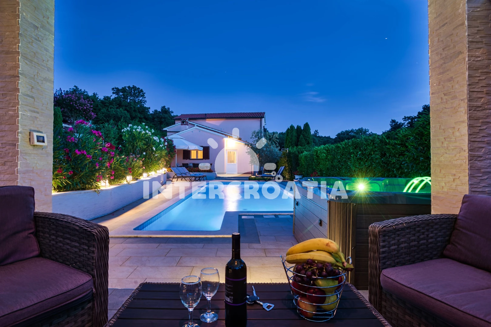 Vila se nachází 3500 m od moře a pláže. Pláž je oblázková a betonové desky. Vila disponuje bazénem s lehátky pro ubytované hosty. K dispozici vířivka. U objektu je k dispozici společná zahrada s posezením a grilem. Parkování je před domem.