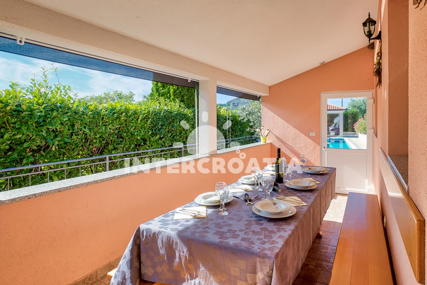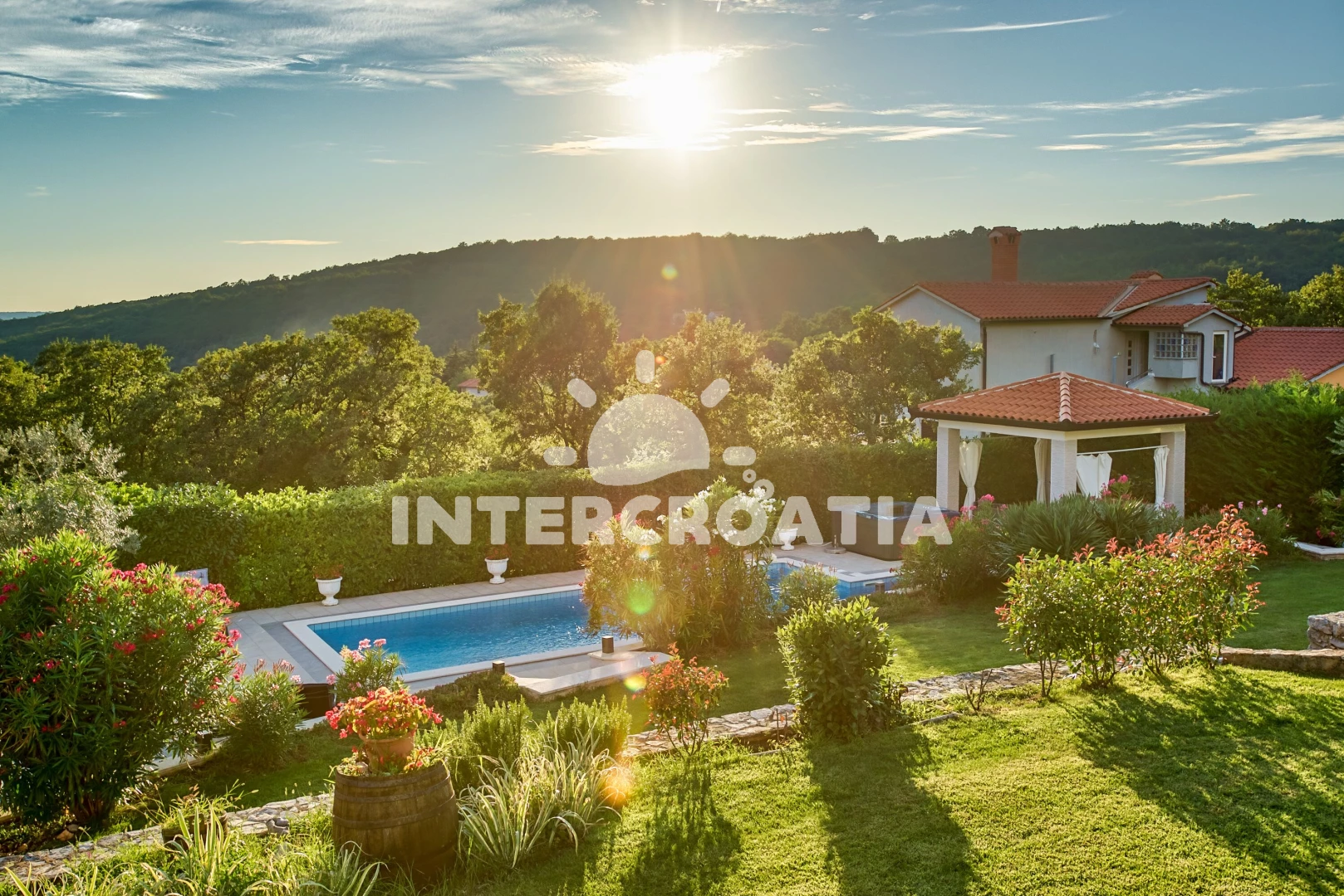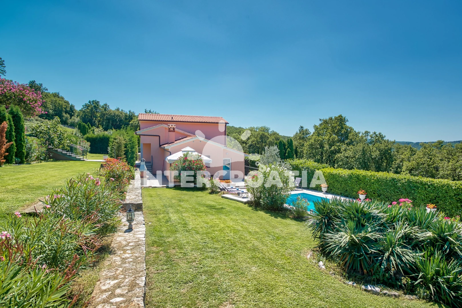 Vila se nachází 3500 m od moře a pláže. Pláž je oblázková a betonové desky. Vila disponuje bazénem s lehátky pro ubytované hosty. K dispozici vířivka. U objektu je k dispozici společná zahrada s posezením a grilem. Parkování je před domem.