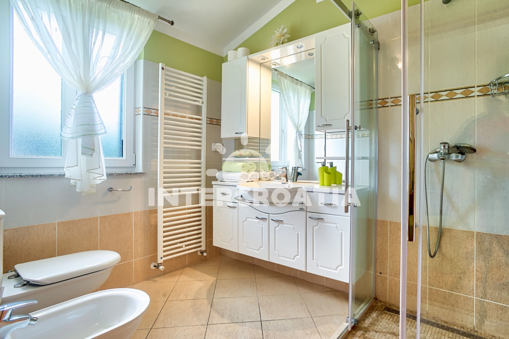 Vila (140 m2). Vila má 3 ložnice a je vhodná pro až 8 osob. Kuchyňská linka je vybavena varnou deskou, kávovarem, troubou, toustovačem, myčkou na nádobí, mikrovlnnou troubou, rychlovarnou konvicí, nádobím, lednicí, mrazákem. V obývací místnosti je rozložitelná pohovka (extra lůžko pro 2 osoby). K dispozici televize se satelitním programem, sejf, radio, žehlička. První ložnice s dvoulůžkem. Druhá ložnice s dvoulůžkem. Třetí ložnice s dvoulůžkem. První koupelna se sprchovým koutem, umyvadlem, fénem a WC. Druhá koupelna se sprchovým koutem, umyvadlem, fénem a WC. Třetí koupelna se sprchovým koutem, umyvadlem, fénem a WC.