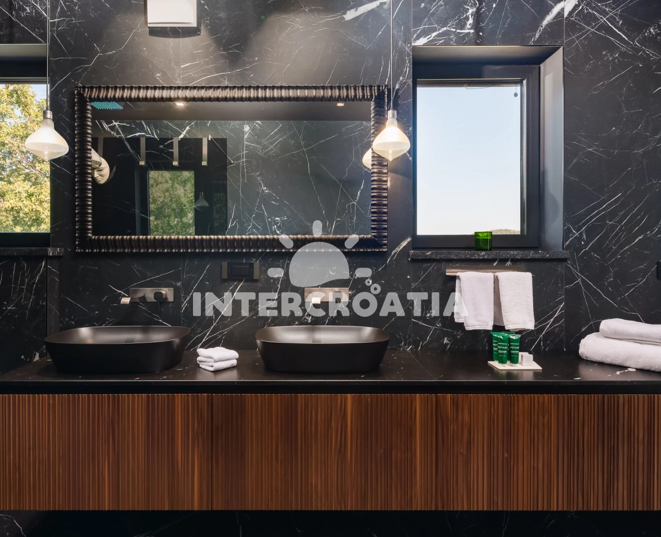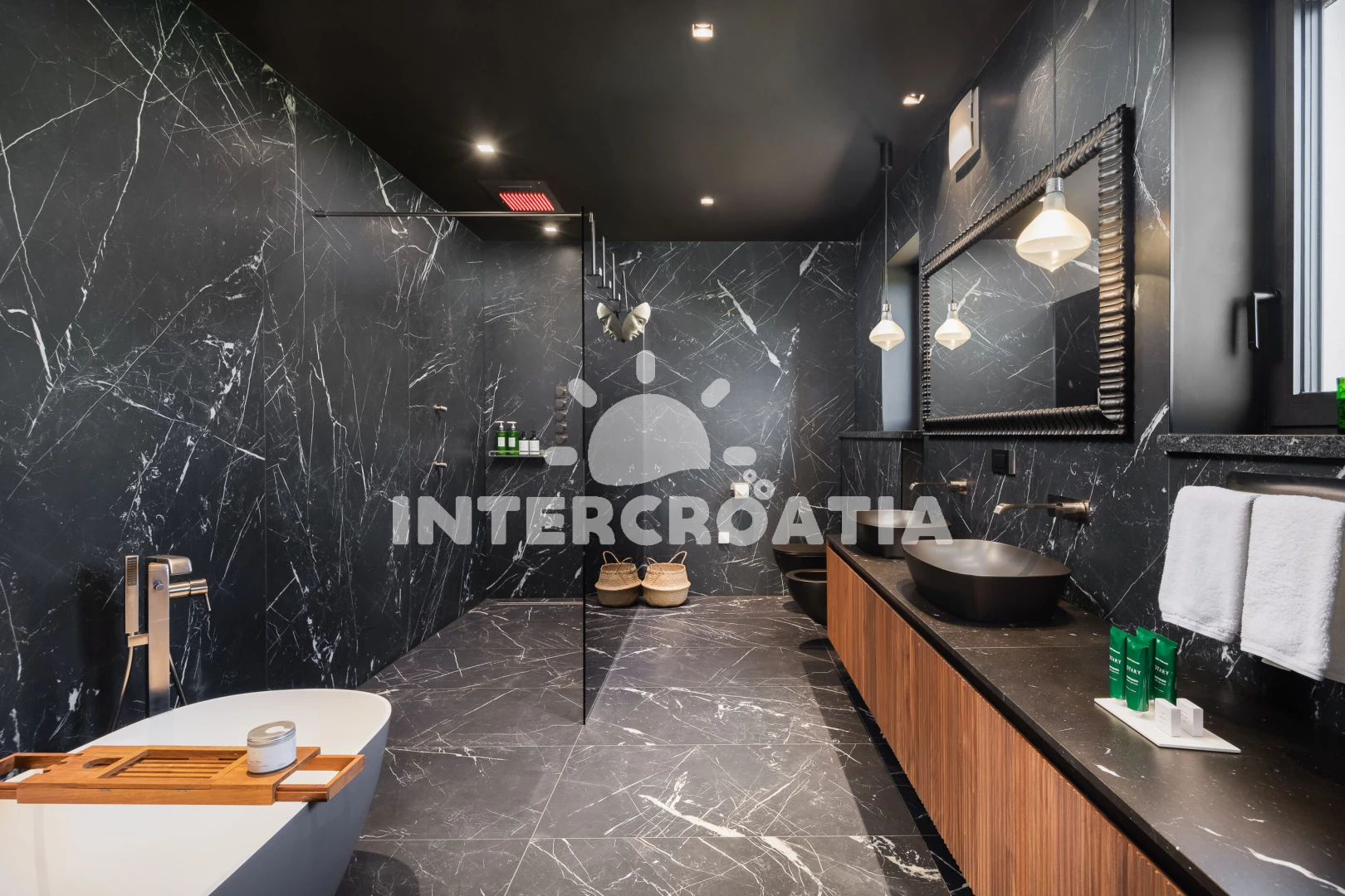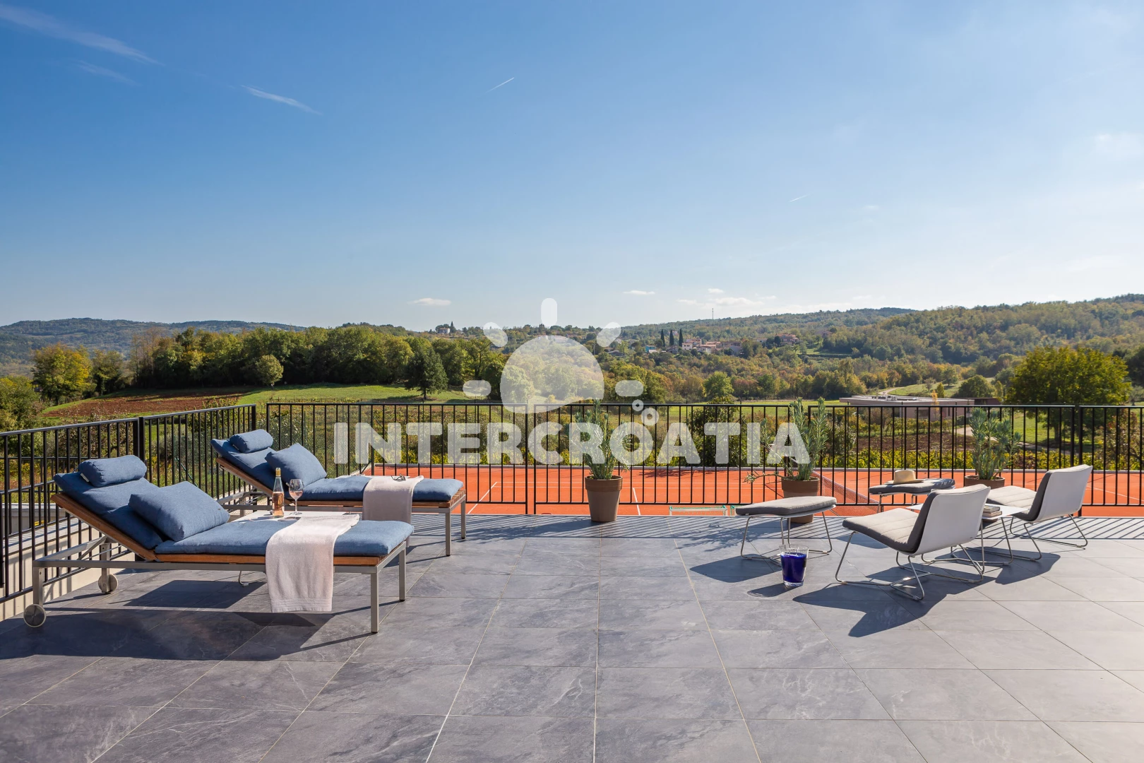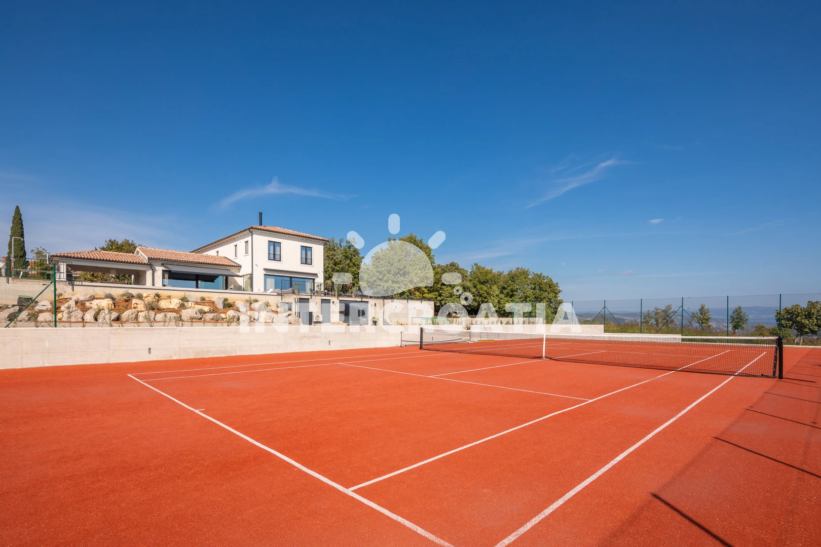 Vila (500 m2). Vila má 1 ložnici a je vhodná pro až 8 osob. Kuchyňská linka je vybavena varnou deskou, kávovarem, troubou, toustovačem, myčkou na nádobí, mikrovlnnou troubou, rychlovarnou konvicí, nádobím, lednicí, mrazákem. K dispozici televize se satelitním programem, sejf, žehlička. První koupelna se sprchovým koutem, umyvadlem, fénem a WC. Druhá koupelna se sprchovým koutem, umyvadlem, fénem a WC. Třetí koupelna se sprchovým koutem, umyvadlem, fénem a WC. Čtvrtá koupelna s vanou, umyvadlem, fénem a WC. Dále samostatné WC.