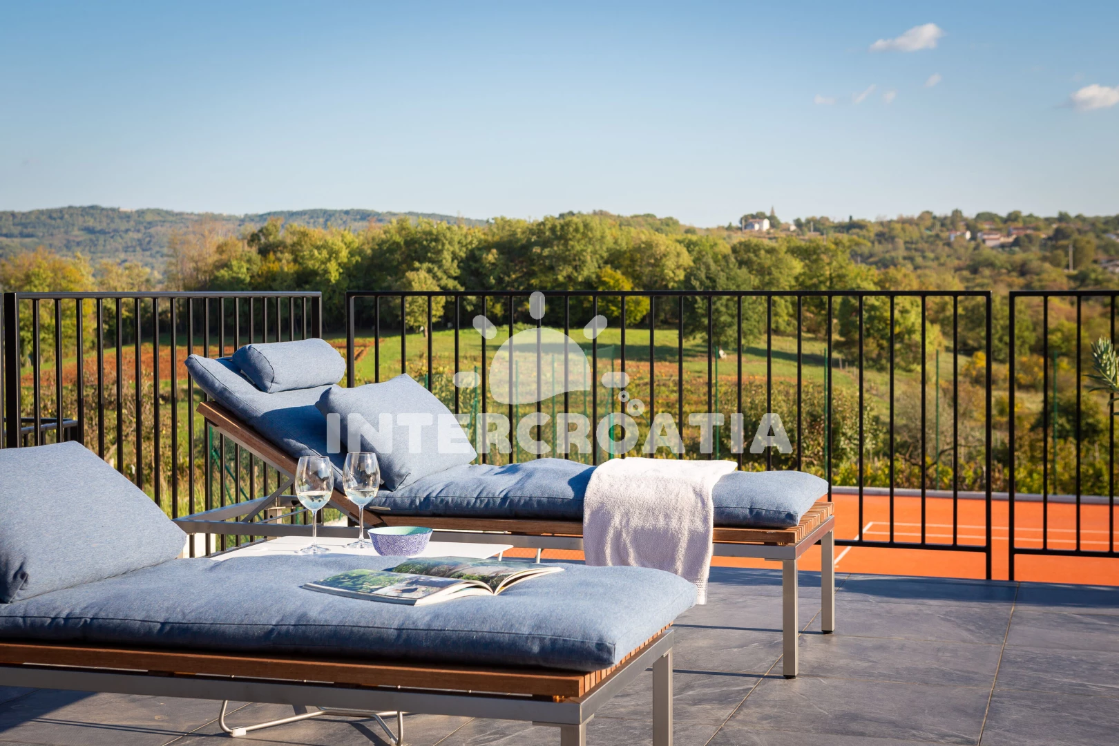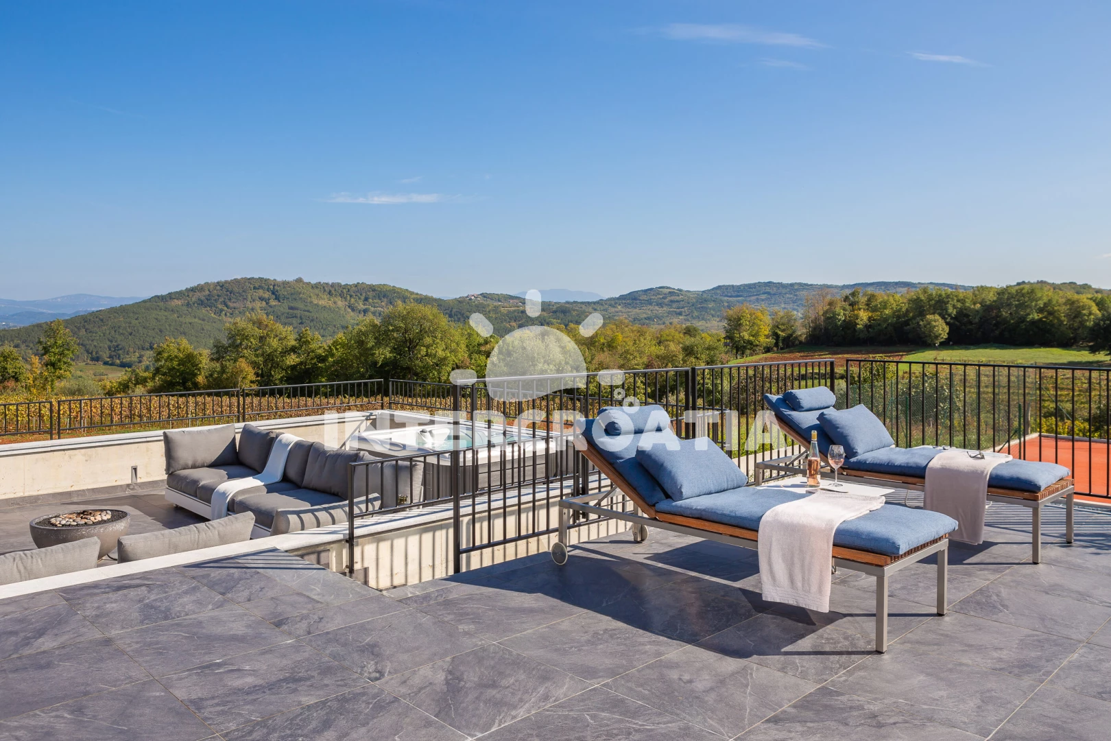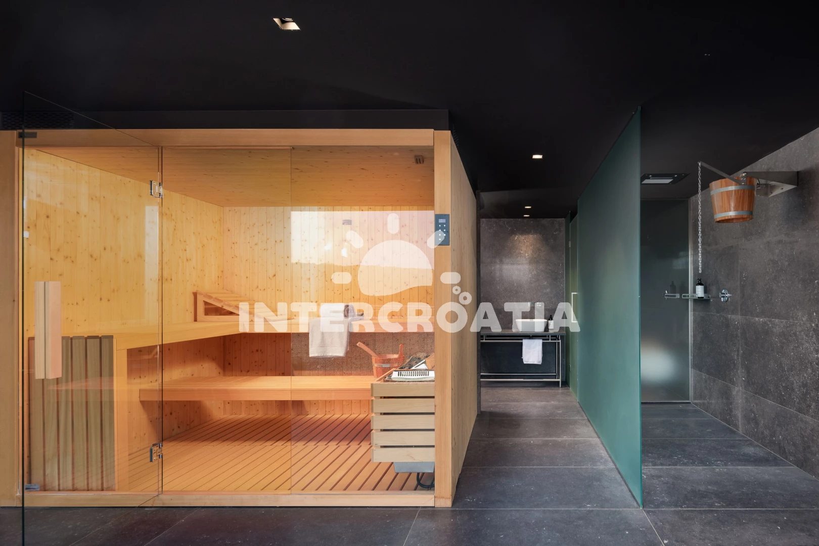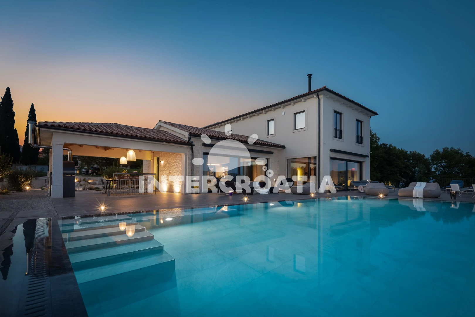 Vila (500 m2). Vila má 1 ložnici a je vhodná pro až 8 osob. Kuchyňská linka je vybavena varnou deskou, kávovarem, troubou, toustovačem, myčkou na nádobí, mikrovlnnou troubou, rychlovarnou konvicí, nádobím, lednicí, mrazákem. K dispozici televize se satelitním programem, sejf, žehlička. První koupelna se sprchovým koutem, umyvadlem, fénem a WC. Druhá koupelna se sprchovým koutem, umyvadlem, fénem a WC. Třetí koupelna se sprchovým koutem, umyvadlem, fénem a WC. Čtvrtá koupelna s vanou, umyvadlem, fénem a WC. Dále samostatné WC.