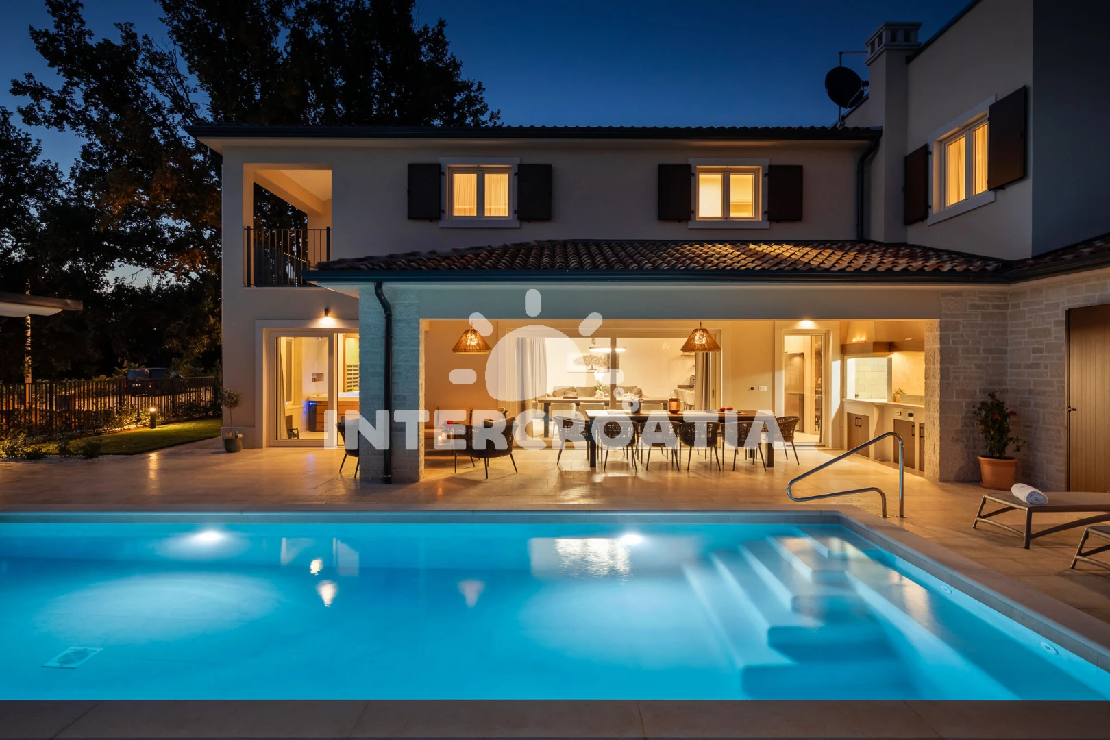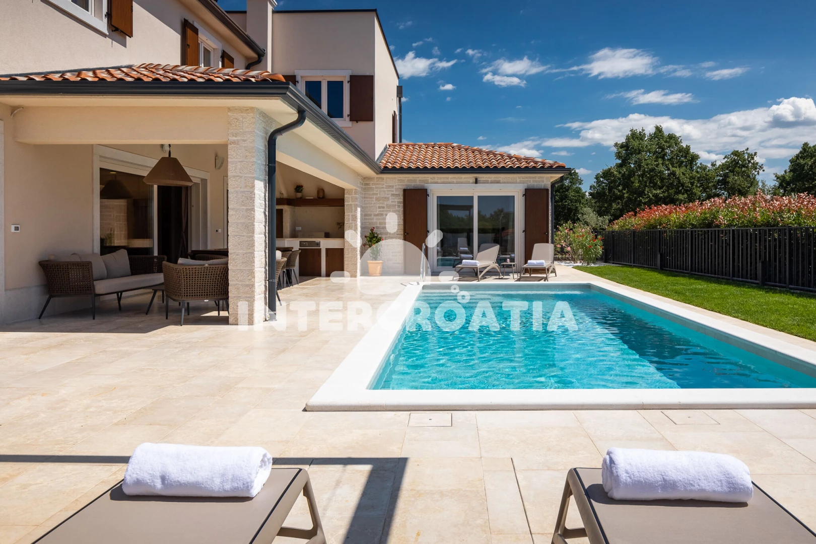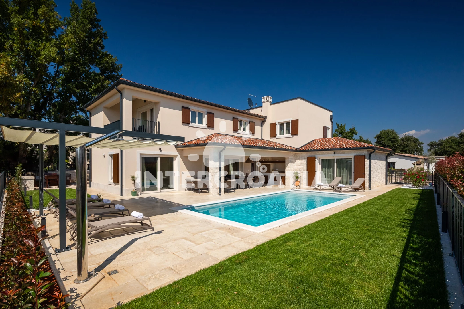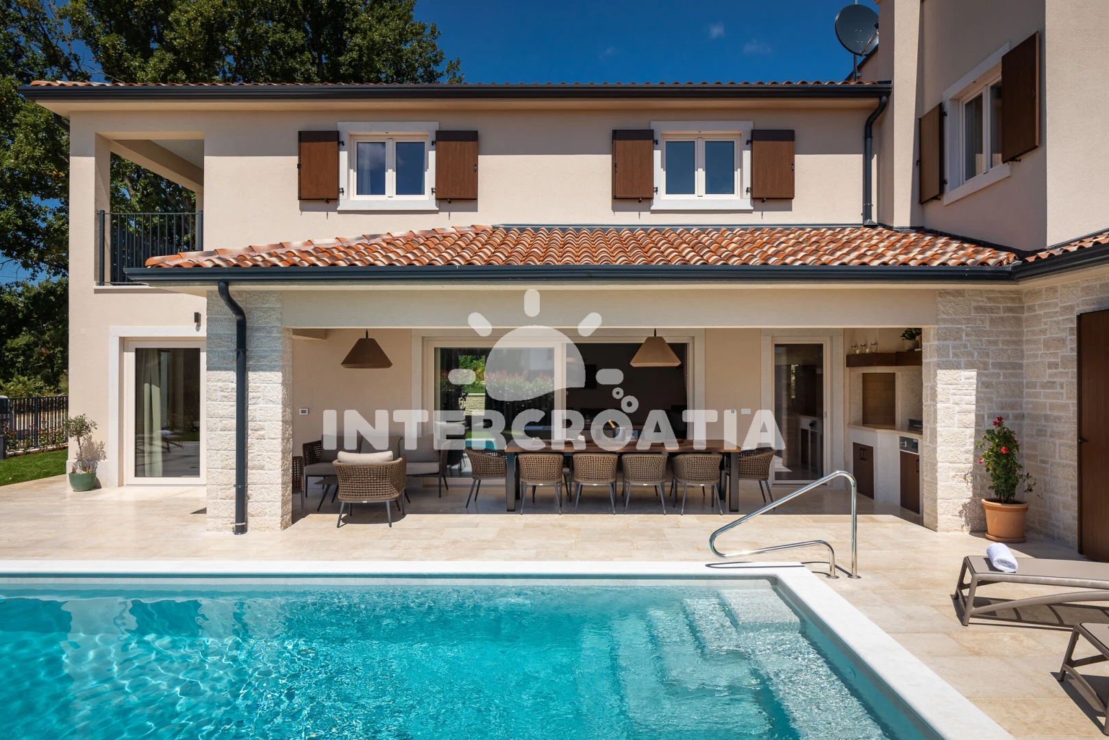 Vila se nachází 5000 m od moře a pláže. Pláž je skalnatá, oblázková, větší kamení a betonové desky. Vila disponuje bazénem s lehátky pro ubytované hosty. K dispozici vířivka. U objektu je k dispozici společná zahrada s posezením a grilem. Parkování je před domem.