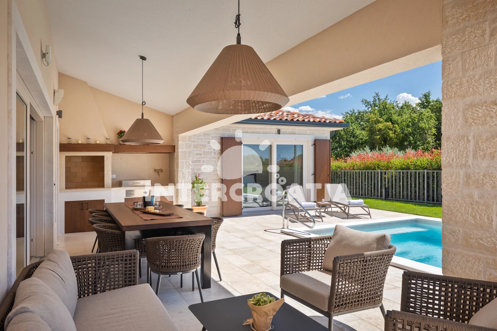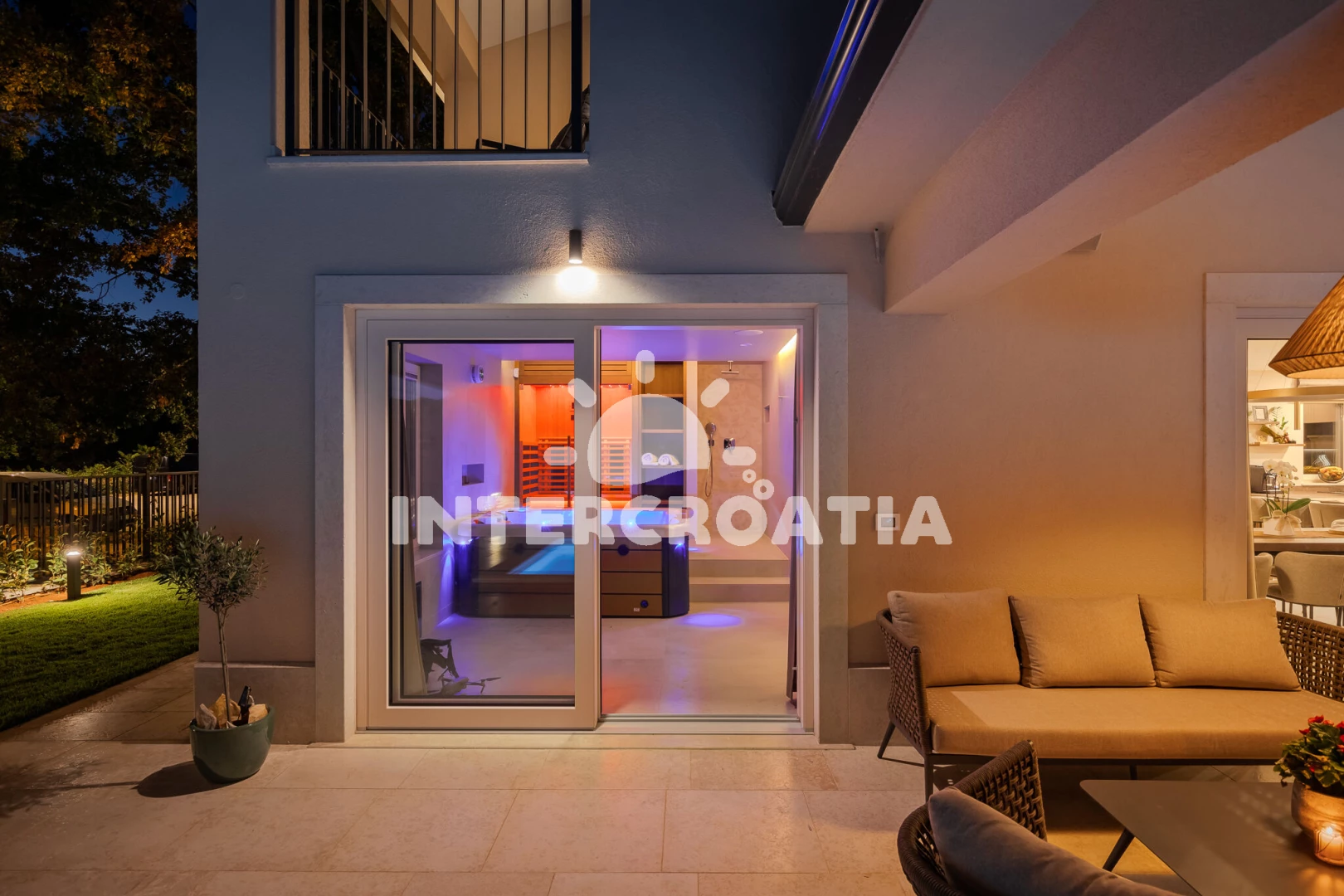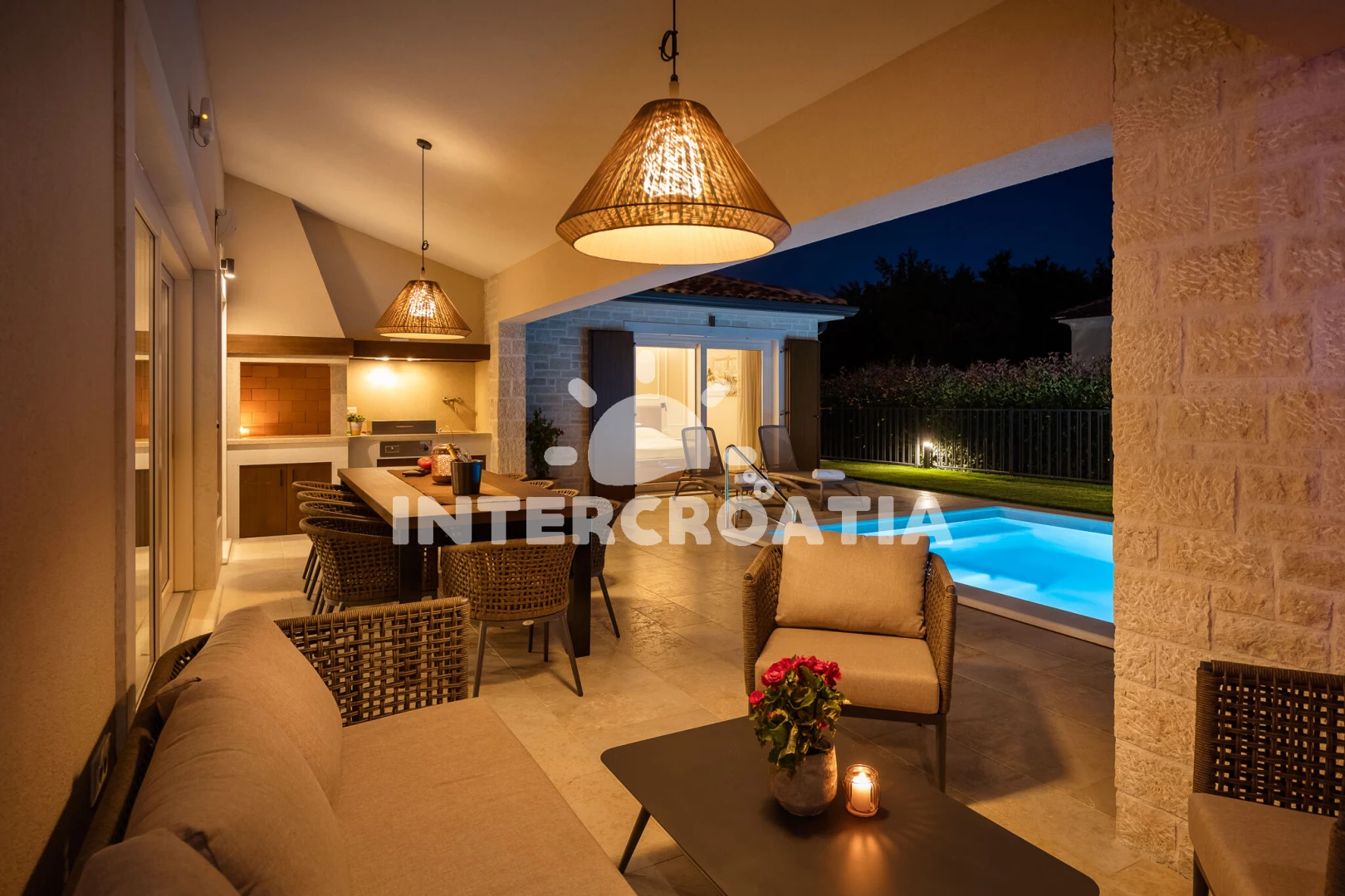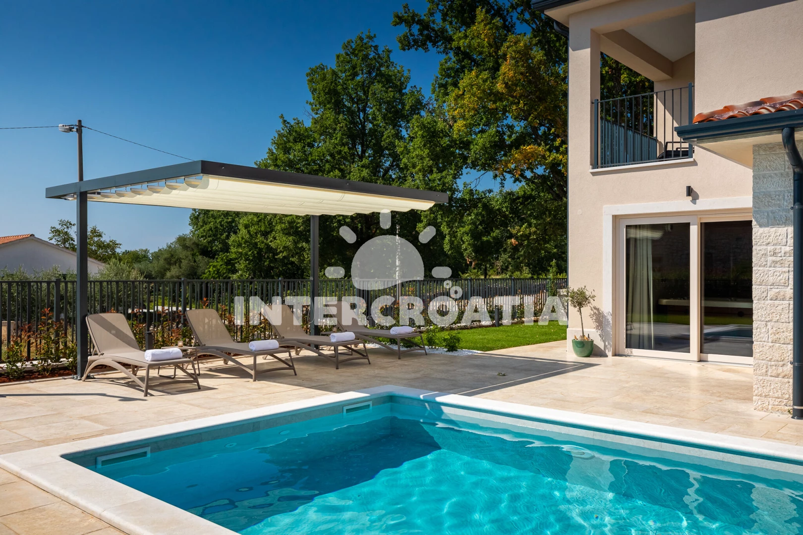 Vila se nachází 5000 m od moře a pláže. Pláž je skalnatá, oblázková, větší kamení a betonové desky. Vila disponuje bazénem s lehátky pro ubytované hosty. K dispozici vířivka. U objektu je k dispozici společná zahrada s posezením a grilem. Parkování je před domem.