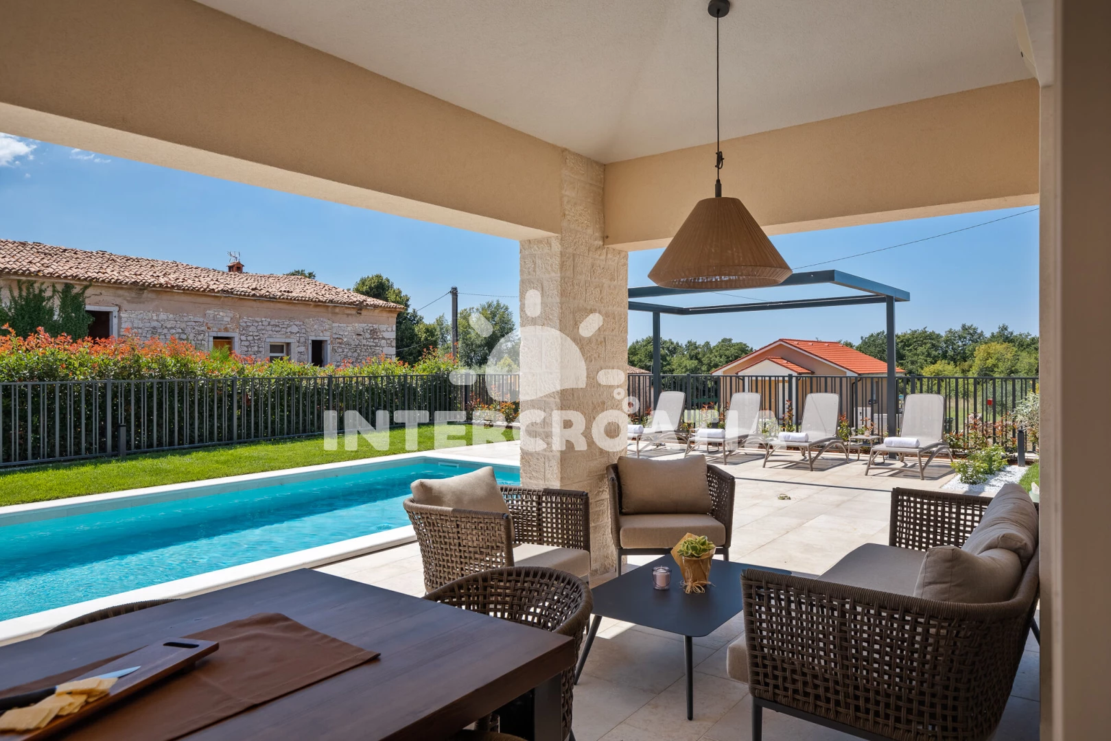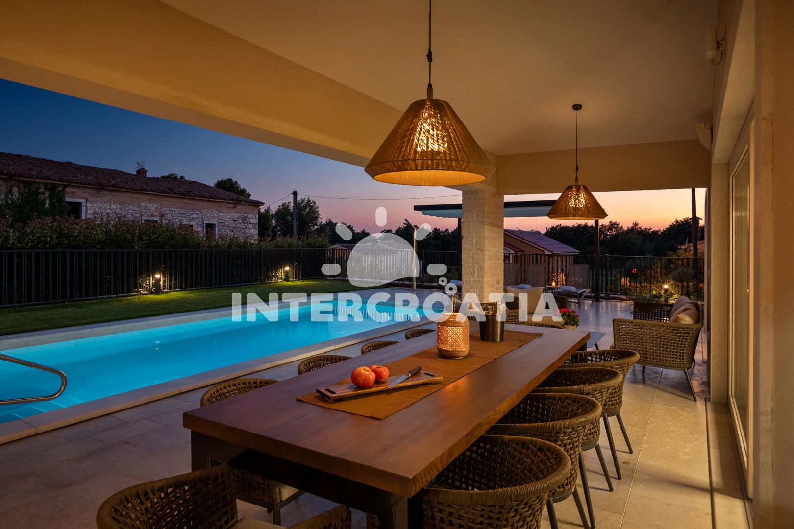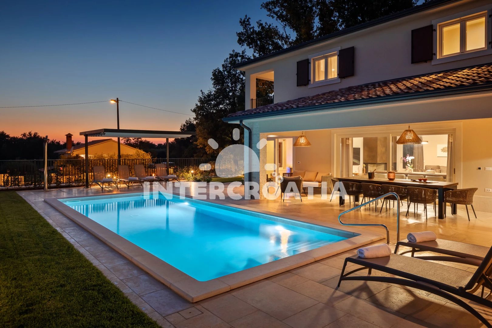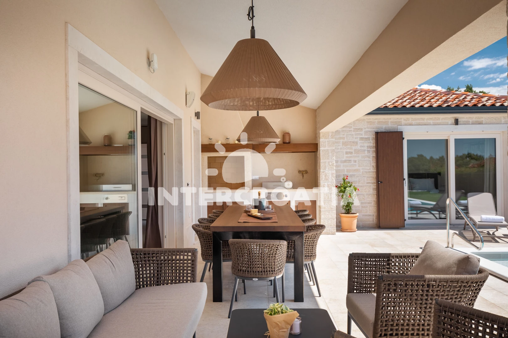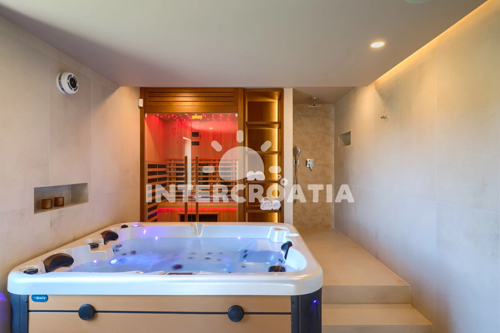 Vila se nachází 5000 m od moře a pláže. Pláž je skalnatá, oblázková, větší kamení a betonové desky. Vila disponuje bazénem s lehátky pro ubytované hosty. K dispozici vířivka. U objektu je k dispozici společná zahrada s posezením a grilem. Parkování je před domem.