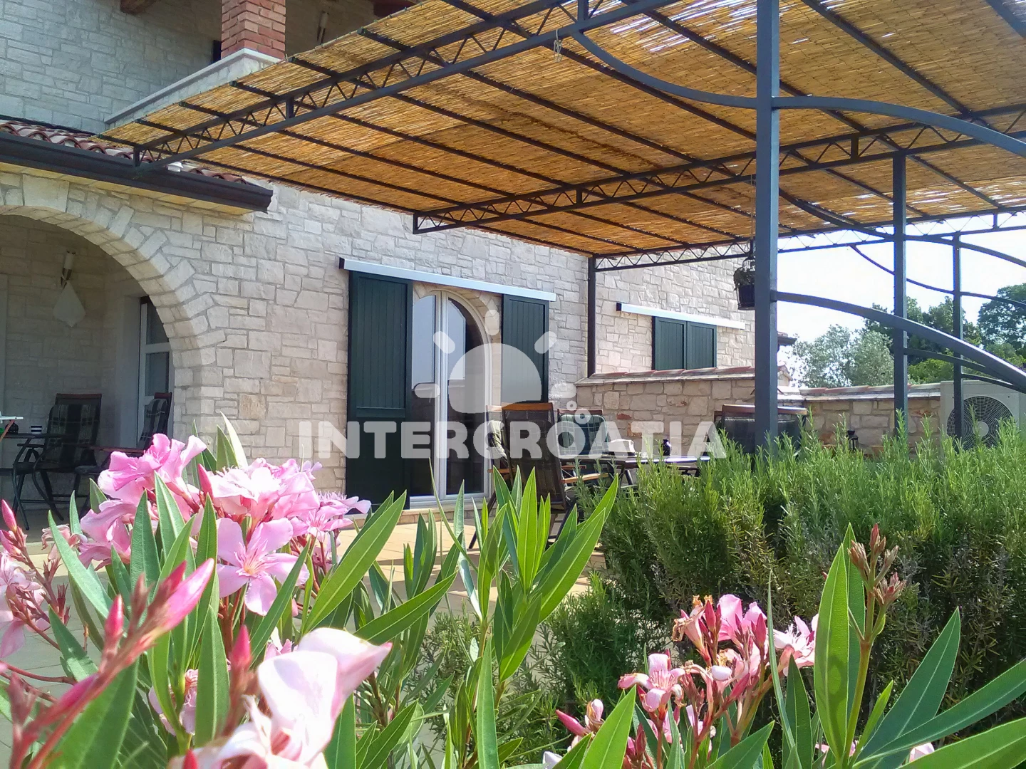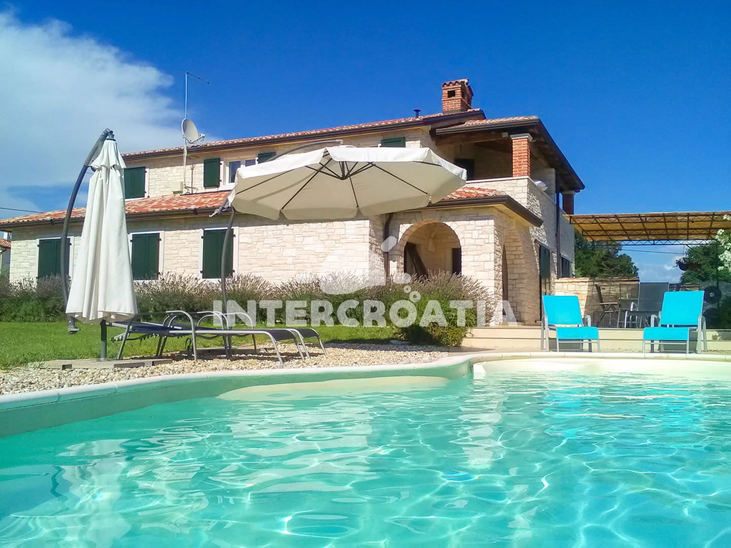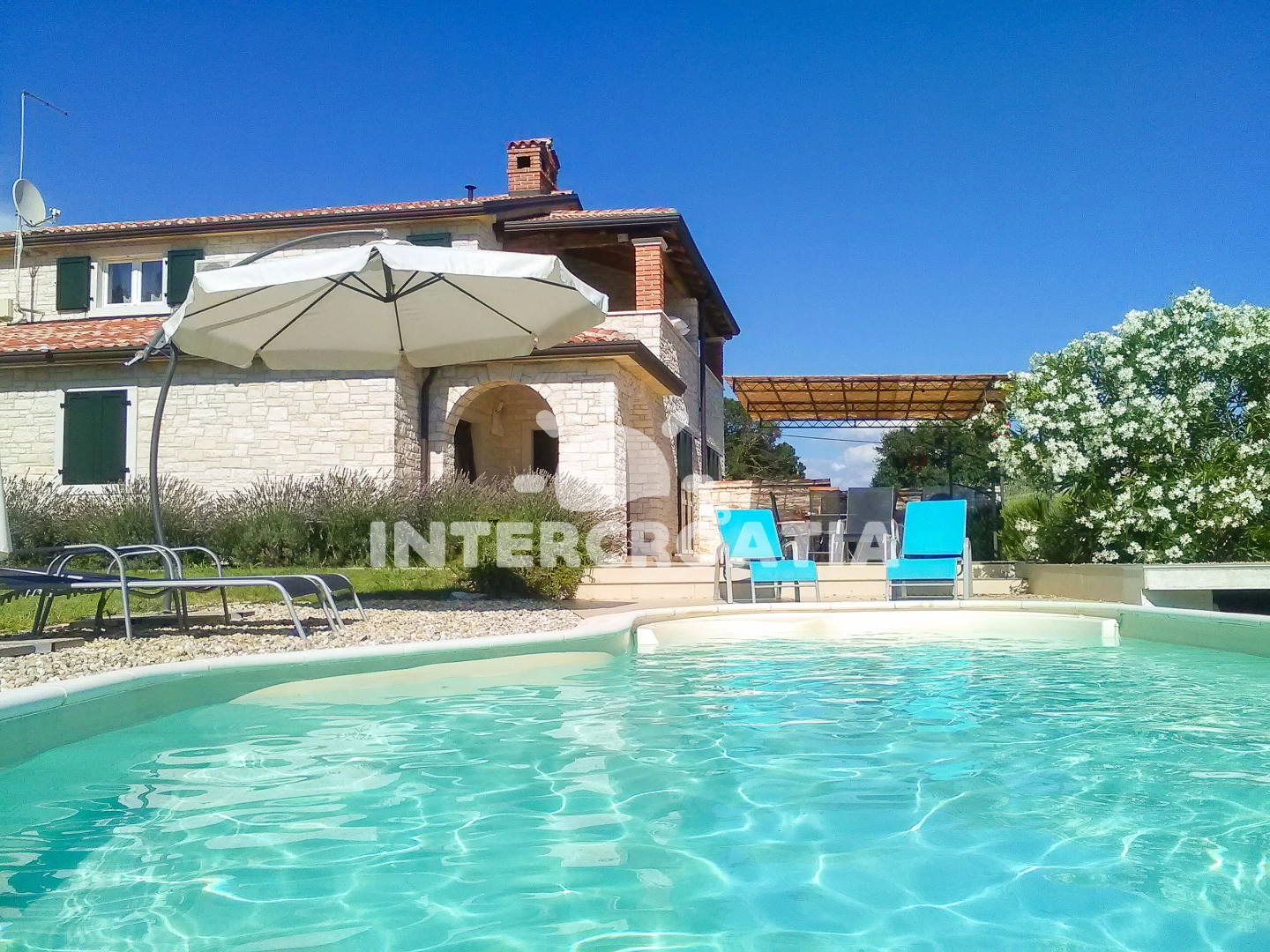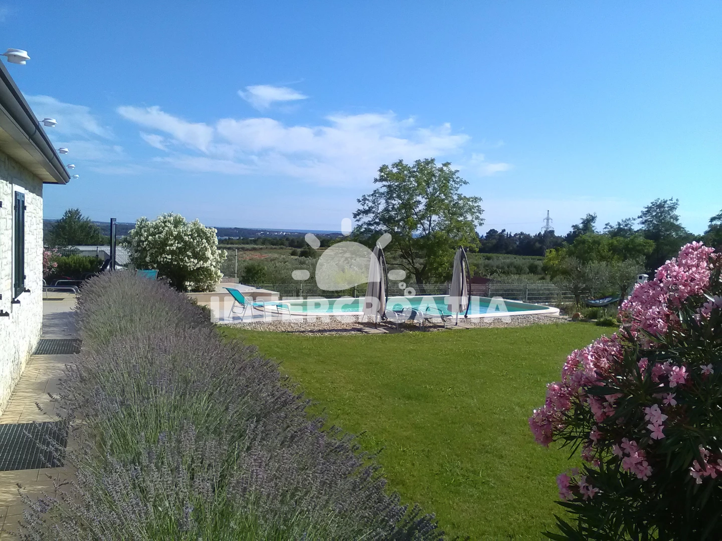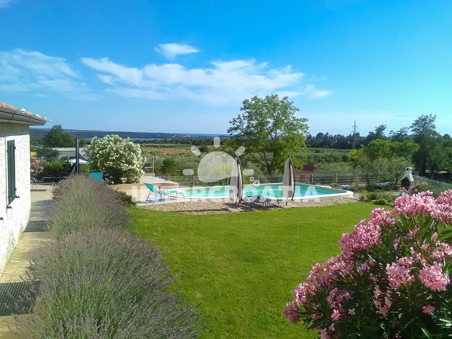Vila se nachází 2500 m od moře a pláže. Pláž je oblázková a betonové desky. Vila disponuje bazénem s lehátky pro ubytované hosty. U objektu je k dispozici společná zahrada s posezením a grilem. Parkování je před domem.