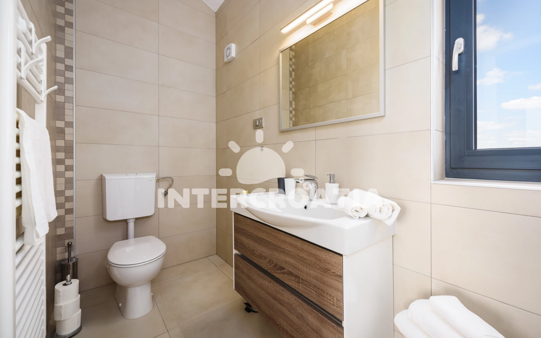 Vila (2) s balkonem. Vila má 3 ložnice a je vhodná pro až 4 osoby. Kuchyňská linka je vybavena varnou deskou, kávovarem, toustovačem, troubou, myčkou na nádobí, mikrovlnnou troubou, rychlovarnou konvicí, nádobím, lednicí, mrazákem. K dispozici televize, sejf, žehlička. První ložnice s dvoulůžky. Druhá ložnice s dvoulůžkem. Třetí ložnice s dvoulůžkem. Hostům je k dispozici parkování u objektu zdarma.