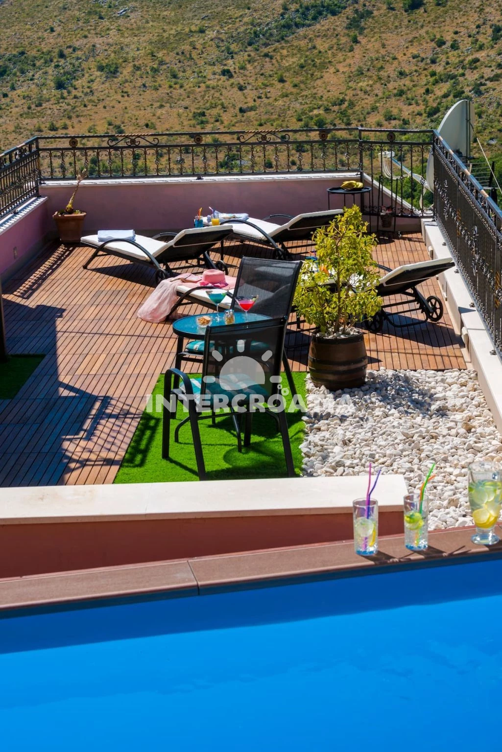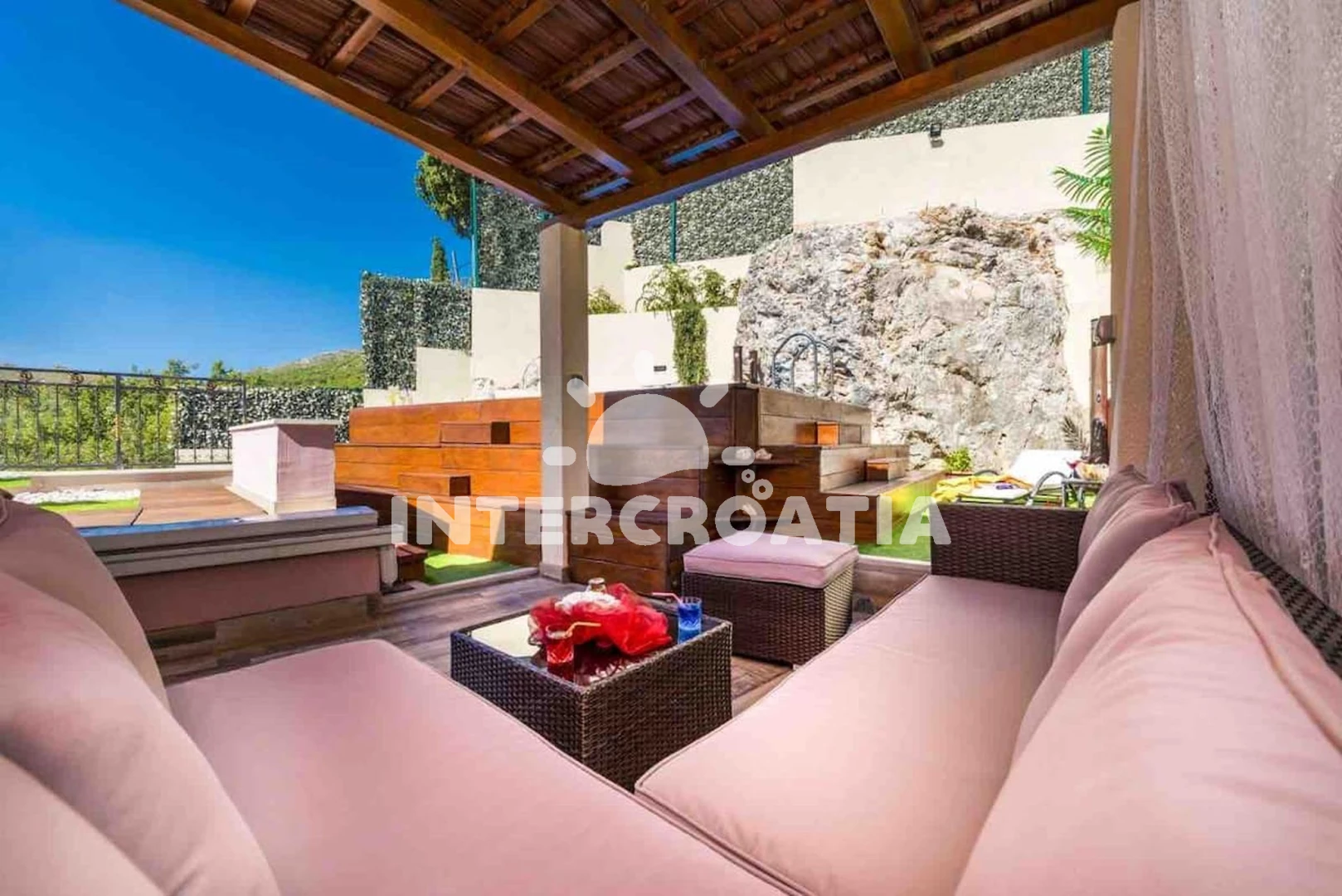 Vila se nachází 4000 m od moře a pláže. Pláž je oblázková. Vila disponuje bazénem s lehátky pro ubytované hosty. U objektu je k dispozici společná zahrada s posezením a grilem. Parkování je před domem.