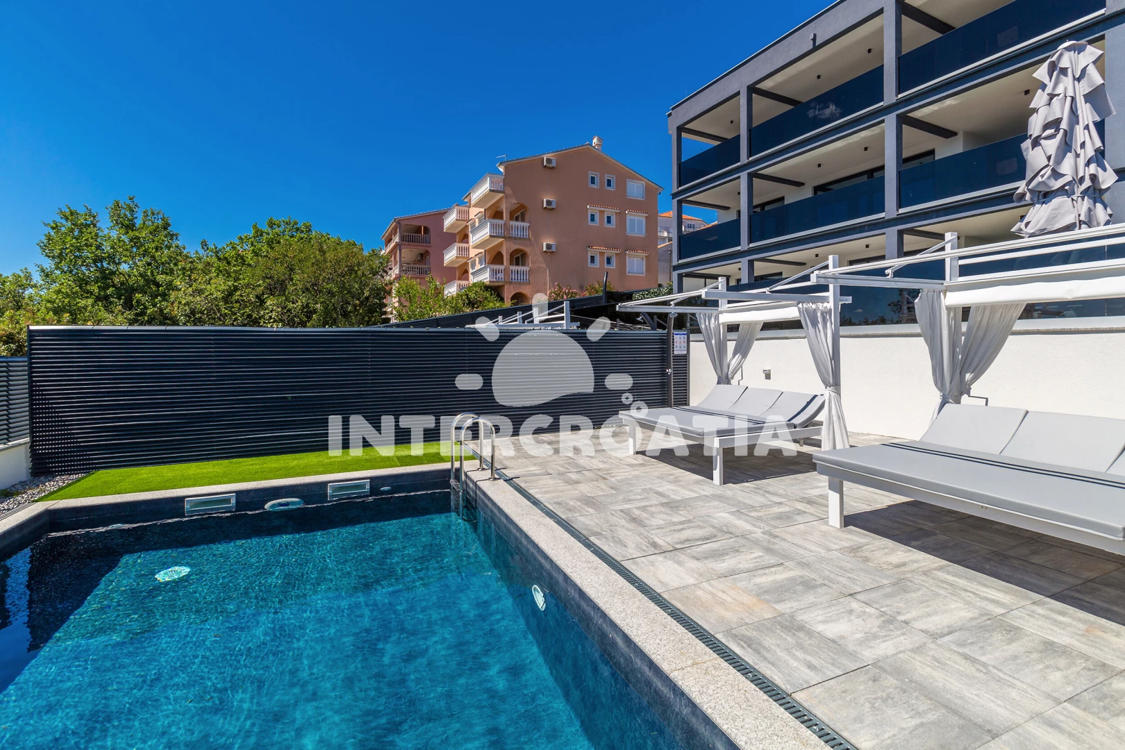 Vzdálenosti: Moře 500 m, pláž 500 m (oblázky), supermarket 150 m, veřejná doprava 200 m, bar 300 m, restaurace 400 m, centrum 800 m, čerpací stanice 800 m, lékárna 1 km, směnárna 1 km, pošta 1,1 km, ambulance 1,2 km, banka 1,2 km, diskotéka 1,2 km, letiště (Rijeka) 25 km,