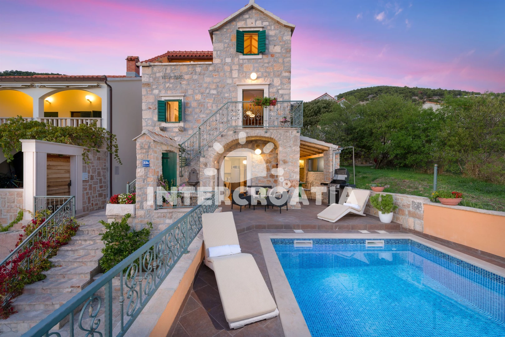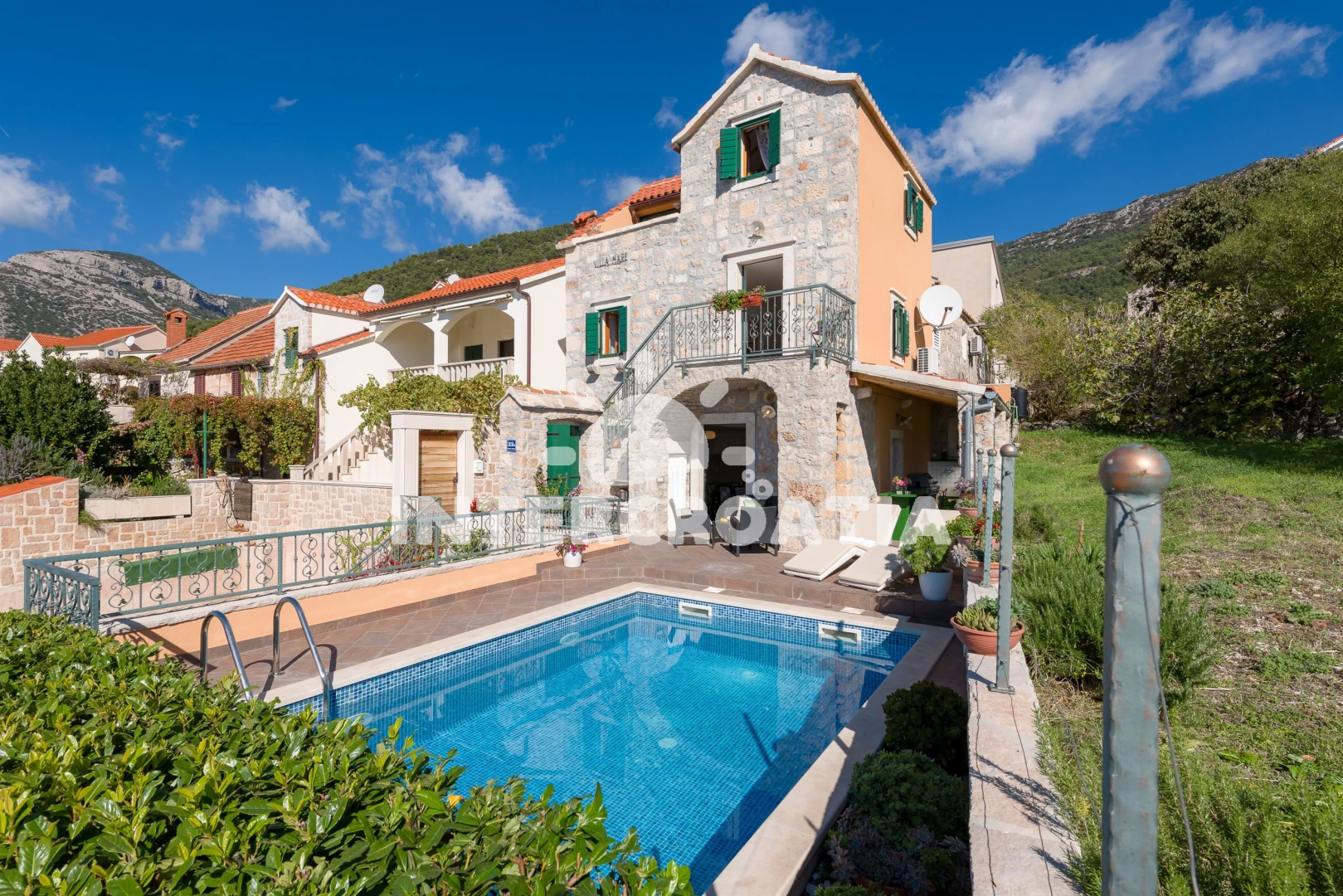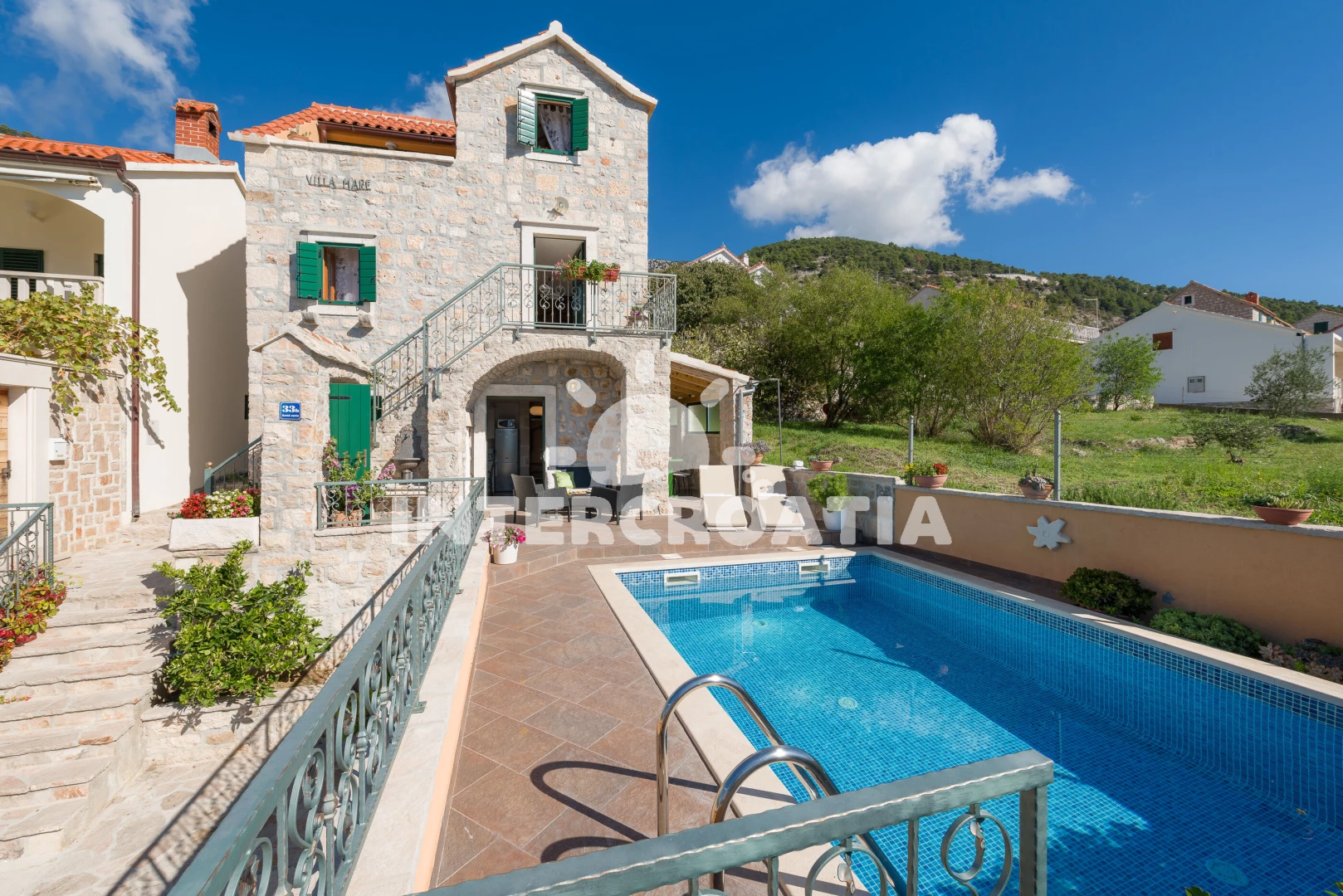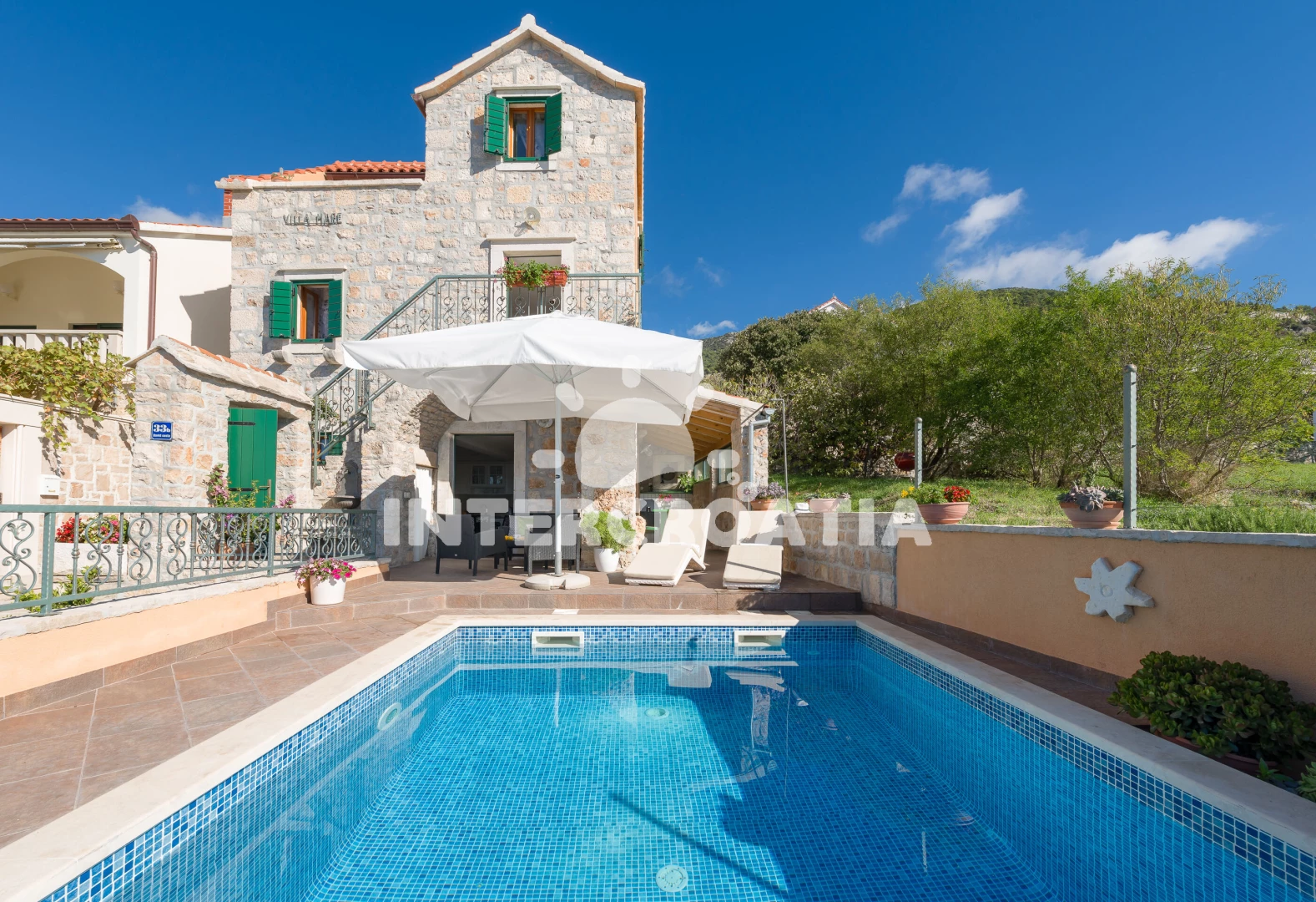 Vila se nachází 300 m od moře a pláže. Pláž je oblázková a větší kamení. Vila disponuje bazénem s lehátky pro ubytované hosty. U objektu je k dispozici společná zahrada s posezením a grilem. Parkování je před domem.