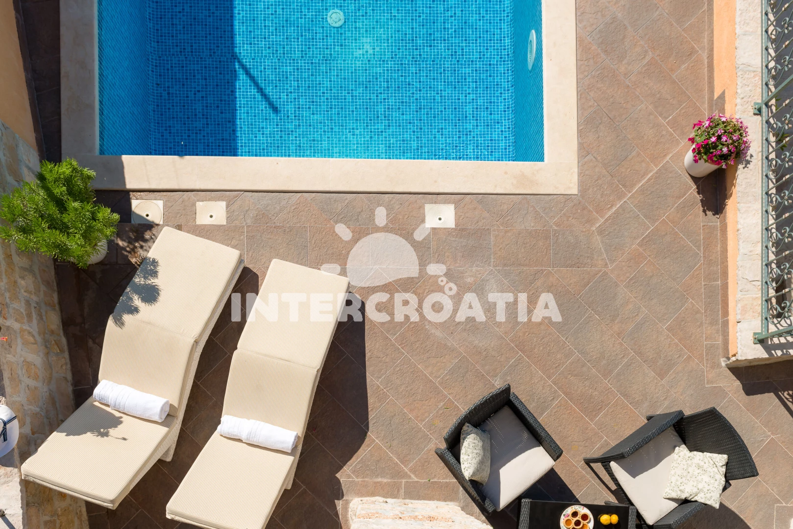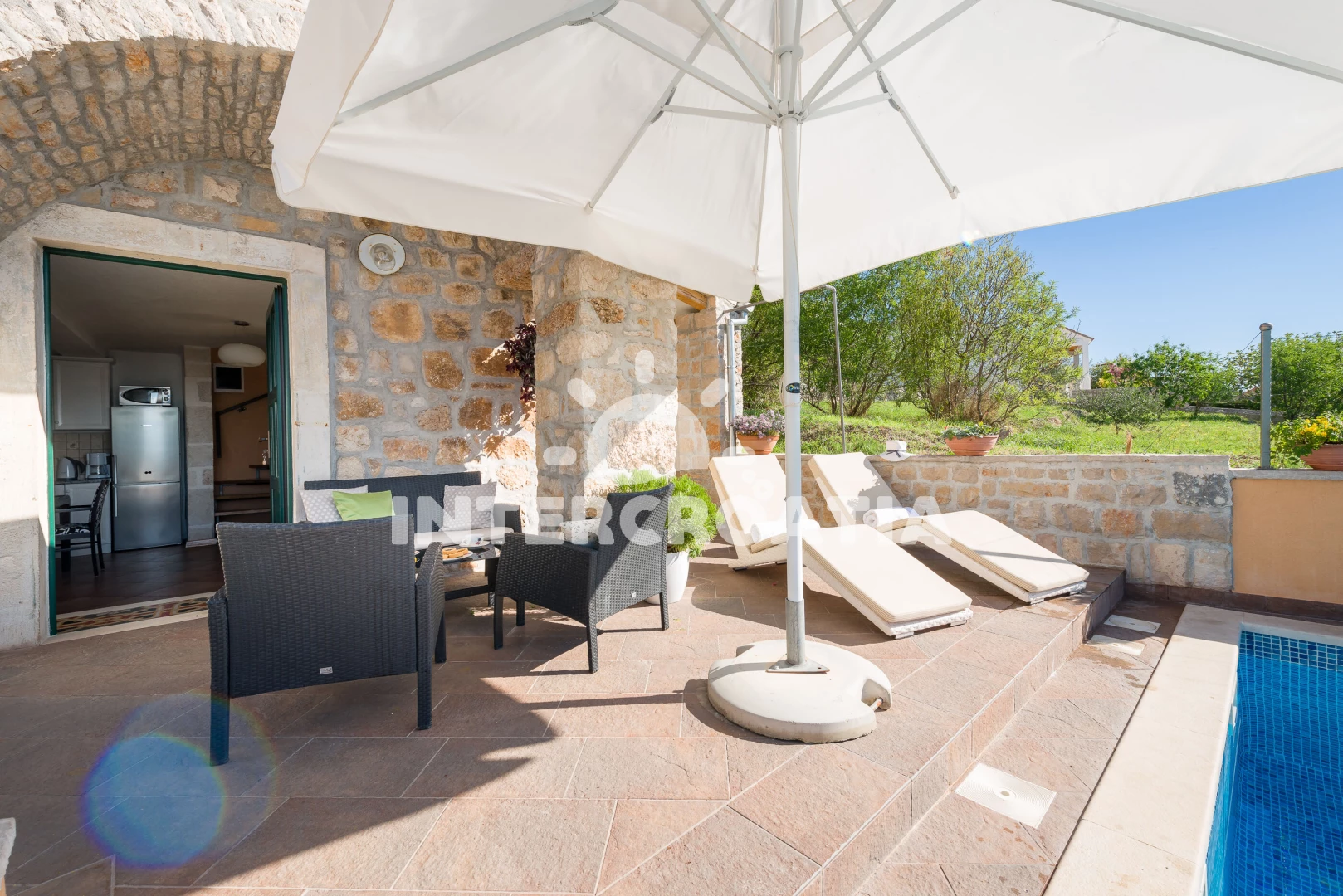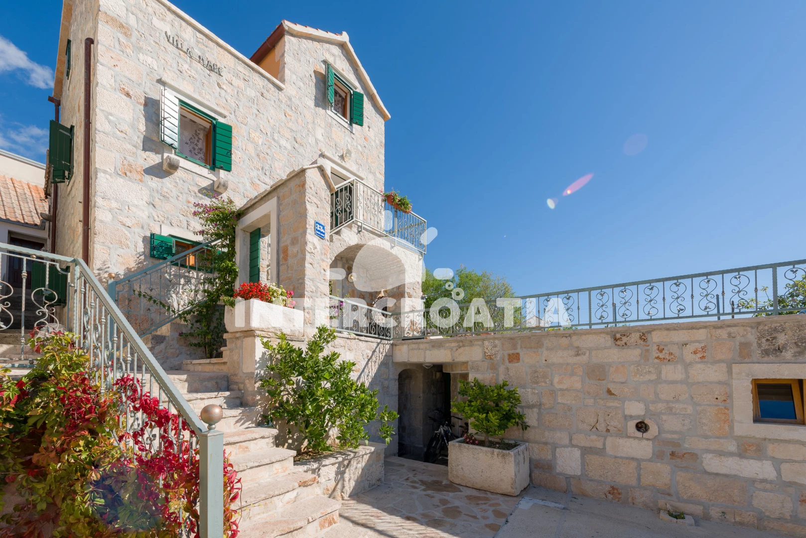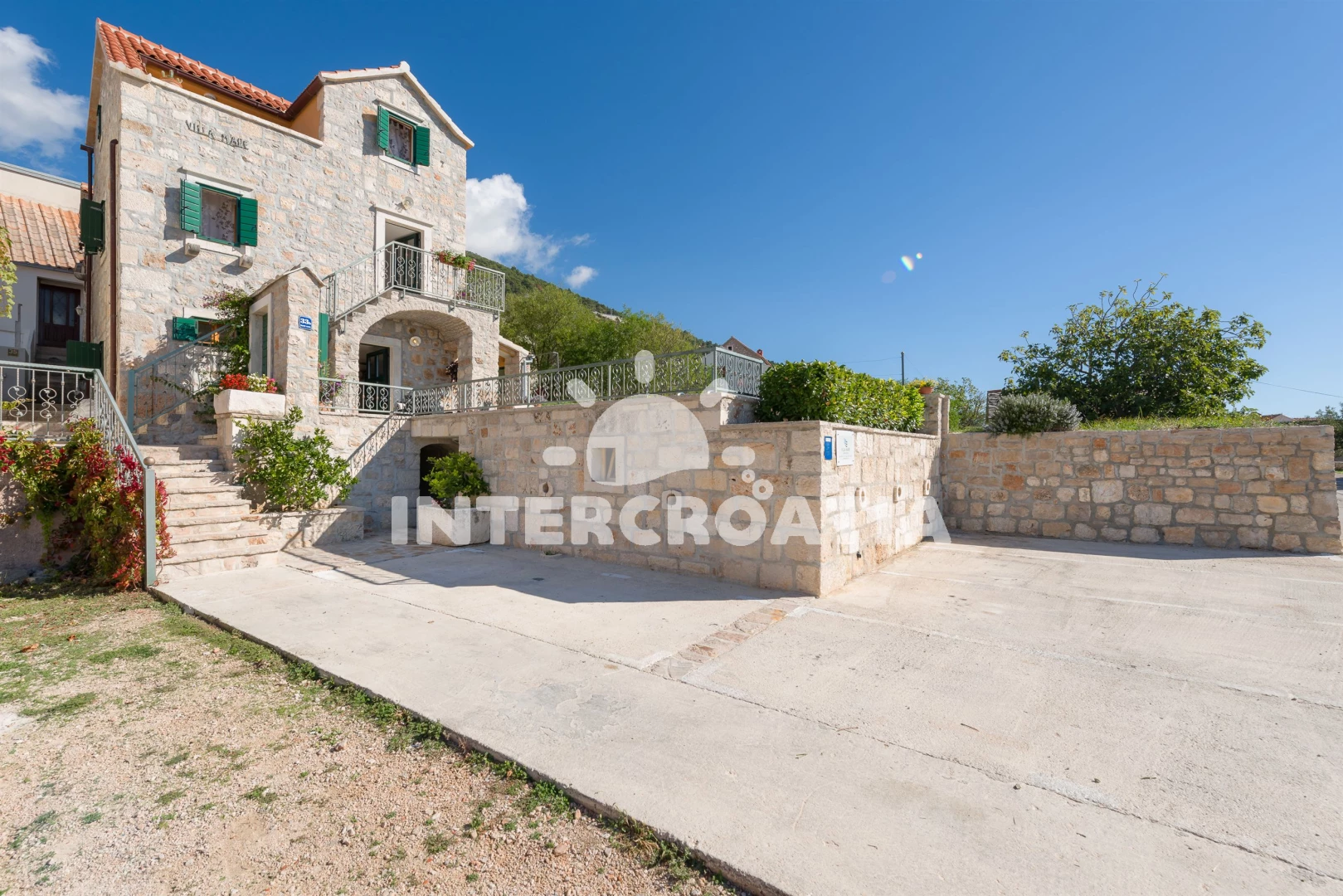 Vila se nachází 300 m od moře a pláže. Pláž je oblázková a větší kamení. Vila disponuje bazénem s lehátky pro ubytované hosty. U objektu je k dispozici společná zahrada s posezením a grilem. Parkování je před domem.