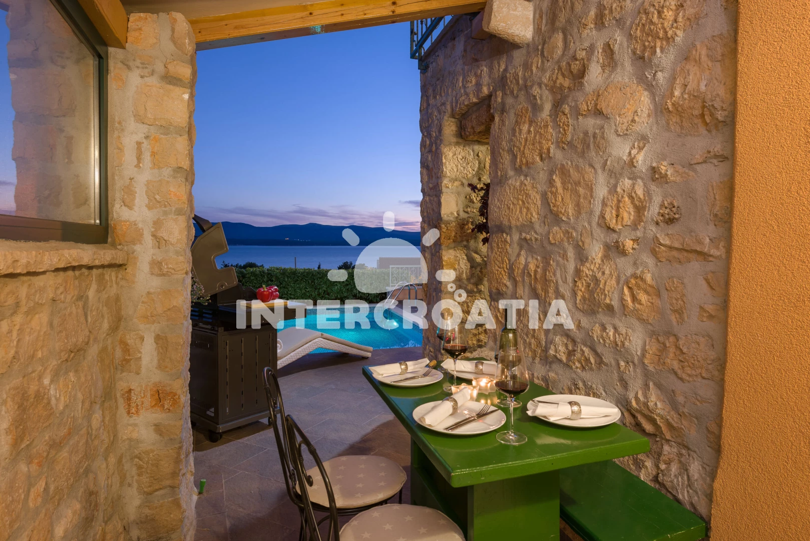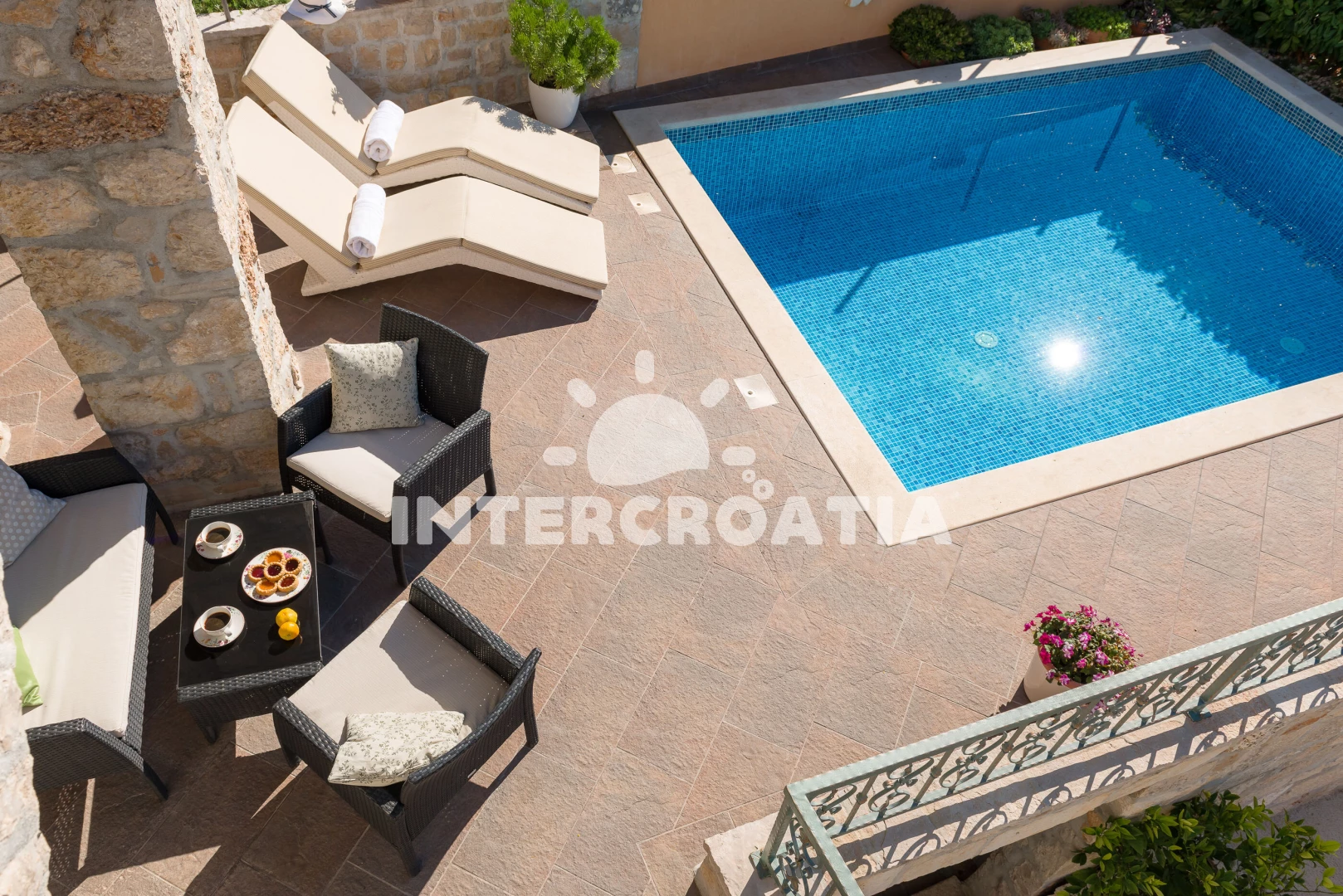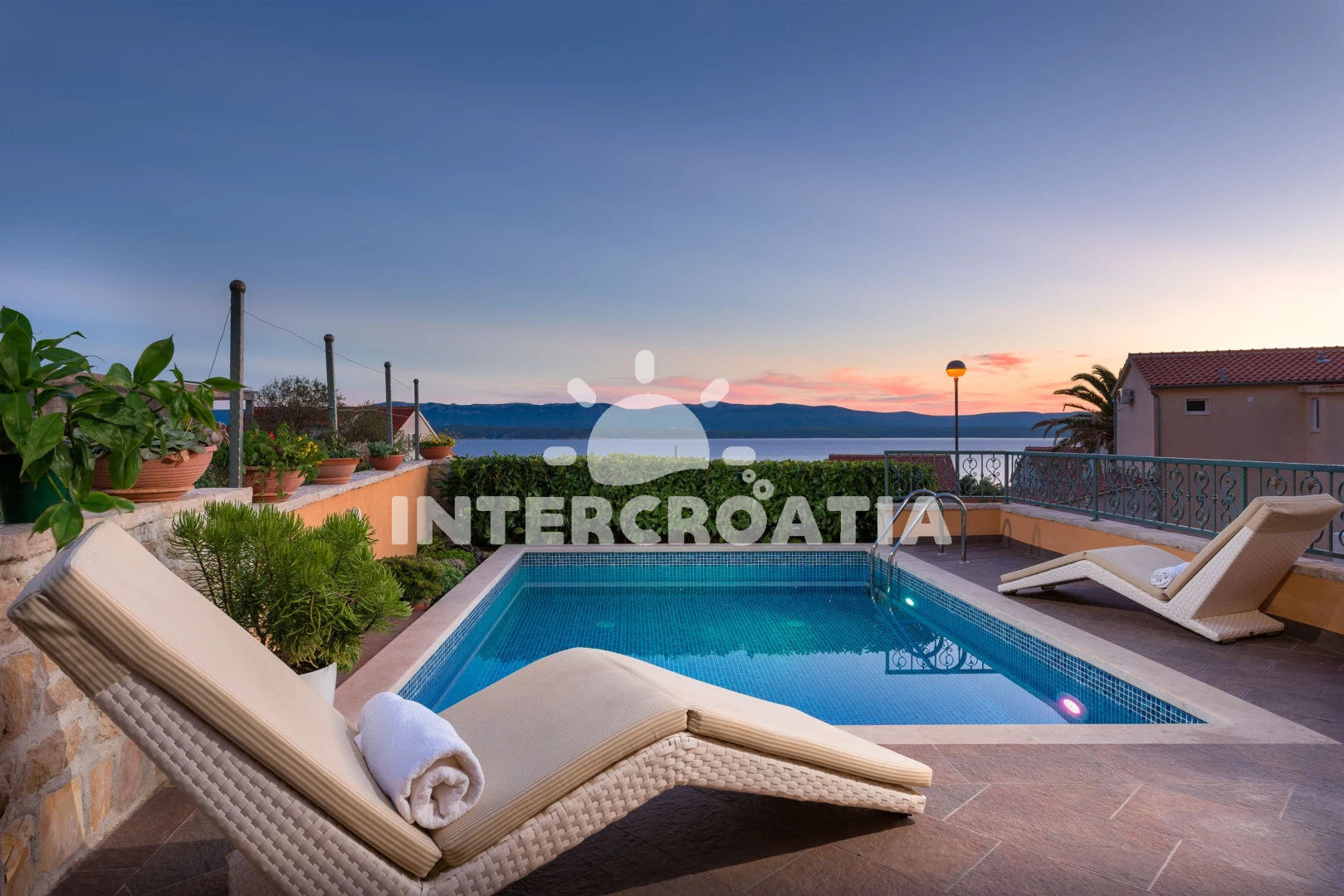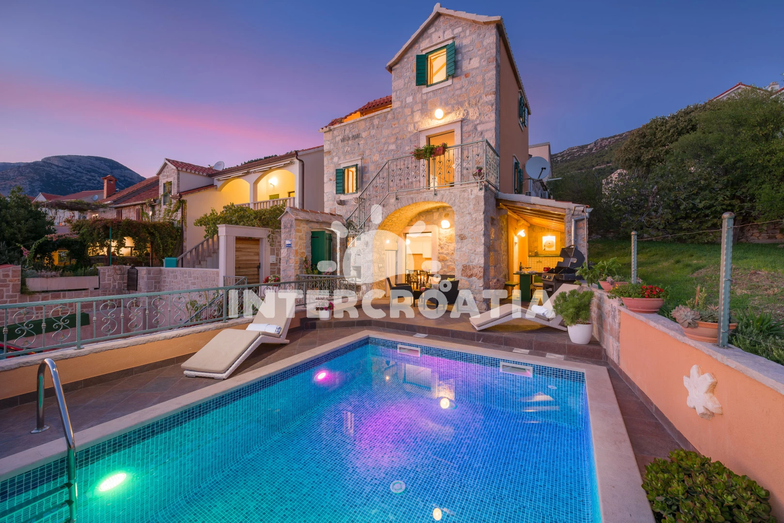 Vila se nachází 300 m od moře a pláže. Pláž je oblázková a větší kamení. Vila disponuje bazénem s lehátky pro ubytované hosty. U objektu je k dispozici společná zahrada s posezením a grilem. Parkování je před domem.