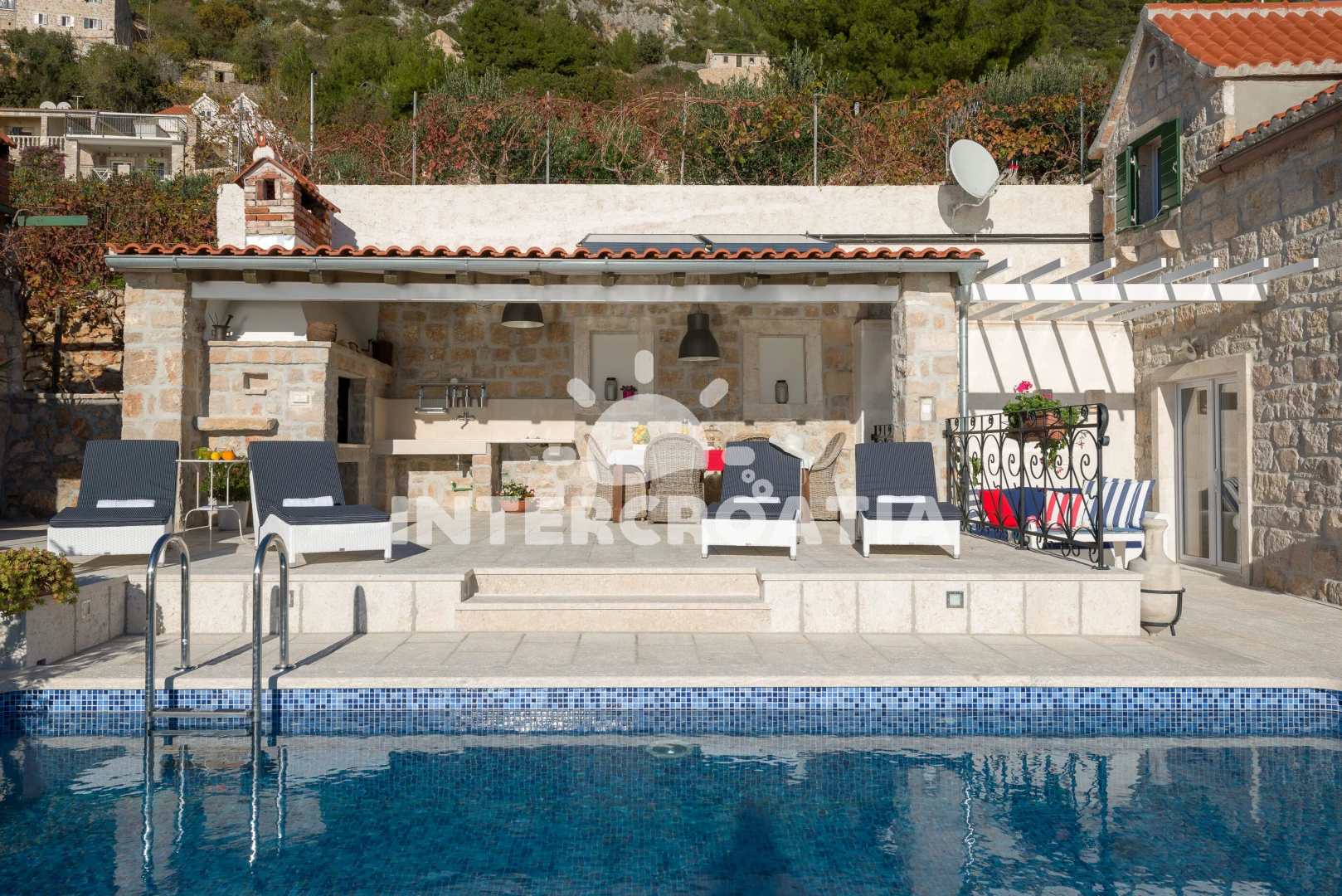 Vila se nachází 250 m od moře a pláže. Pláž je oblázková. Vila disponuje bazénem s lehátky pro ubytované hosty. U objektu je k dispozici společná zahrada s posezením a grilem. Parkování je před domem.