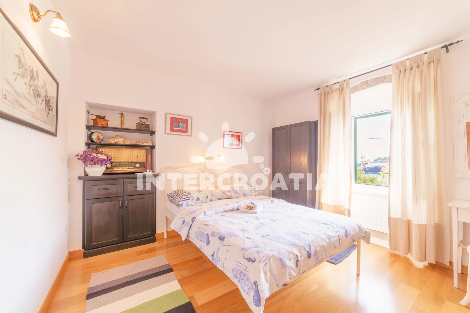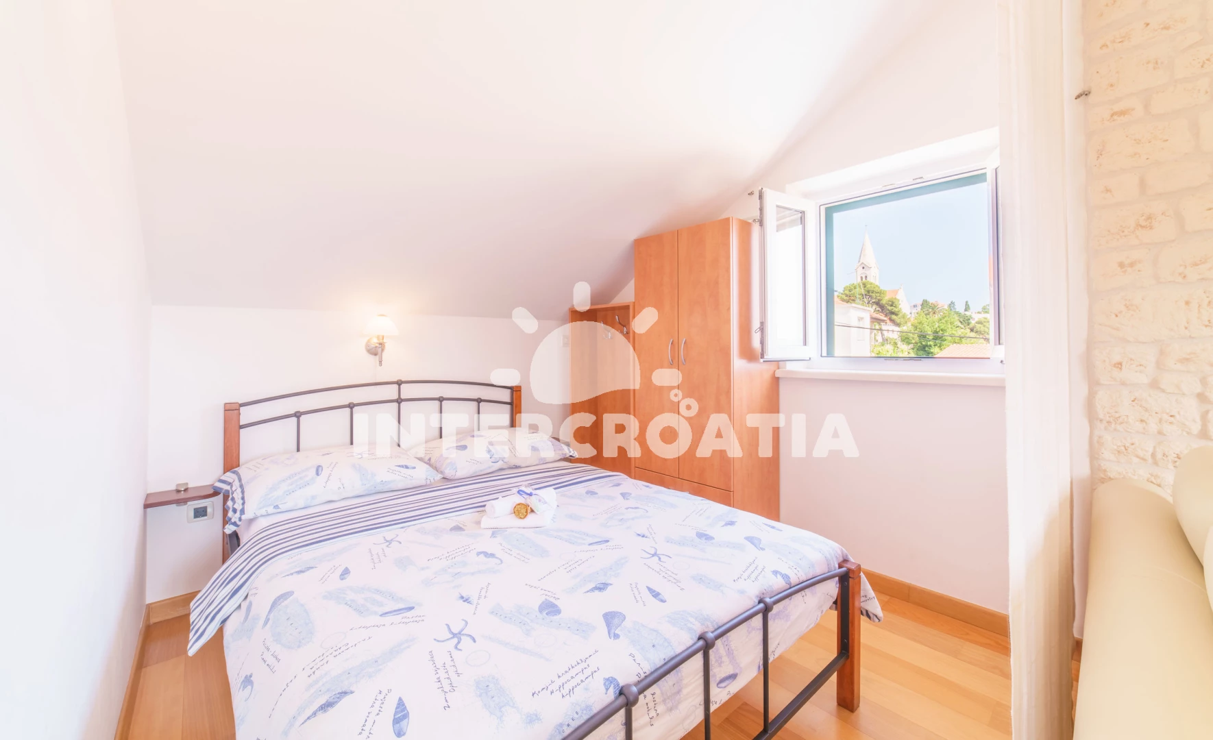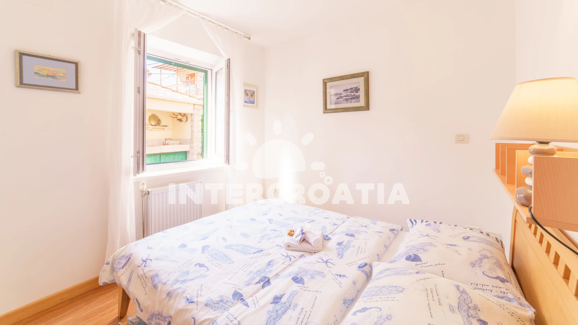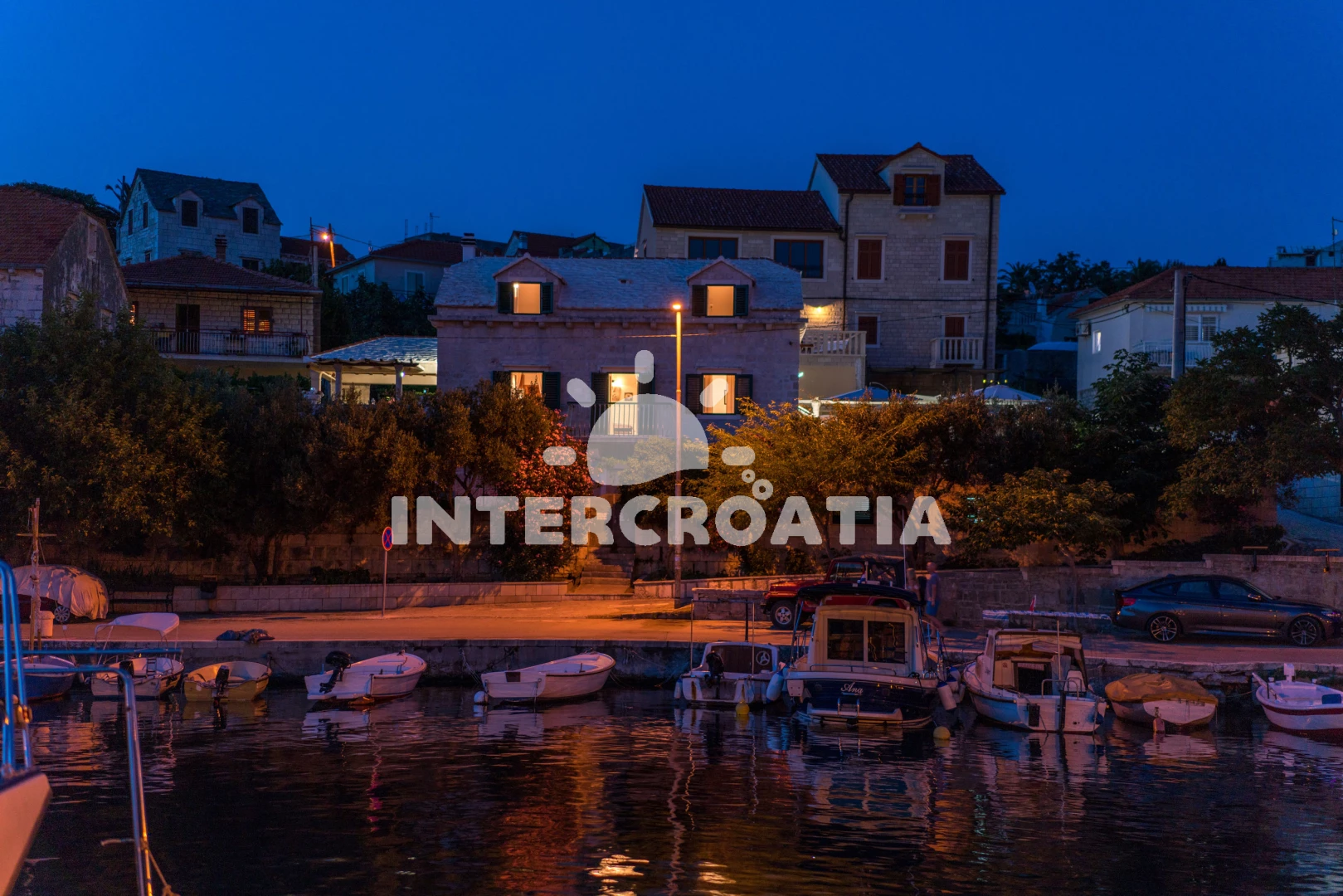 Vzdálenosti: Moře 10 m, pláž 100 m (oblázky), kotviště pro čluny 50 m, pošta 50 m, půjčovna motorových člunů 50 m, marina 50 m, bar 50 m, supermarket 50 m, centrum 50 m, restaurace 50 m, směnárna 100 m, trajekt (Sumartin) 200 m, veřejná doprava 200 m, muzeum 200 m, potápění 500 m, čerpací stanice 1,5 km, tenisové kurty 3 km, lékárna 3 km, ambulance 3 km, banka 40 km,