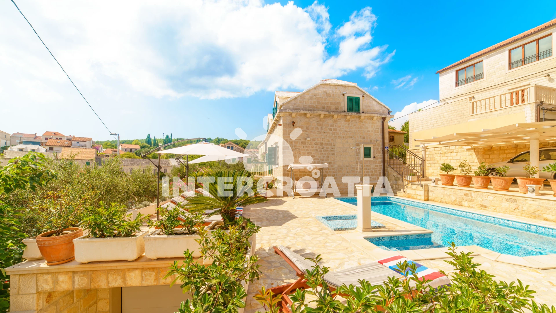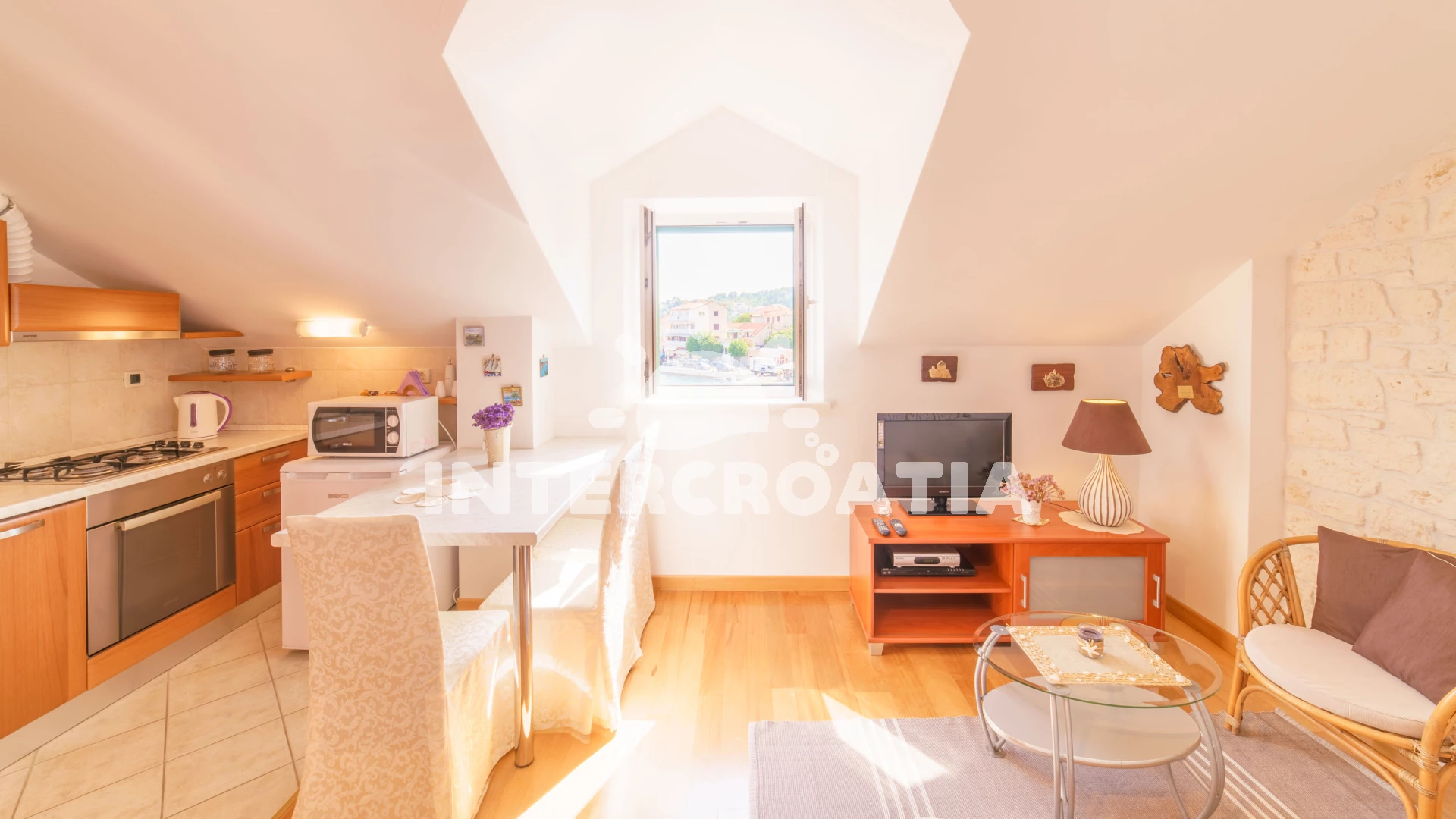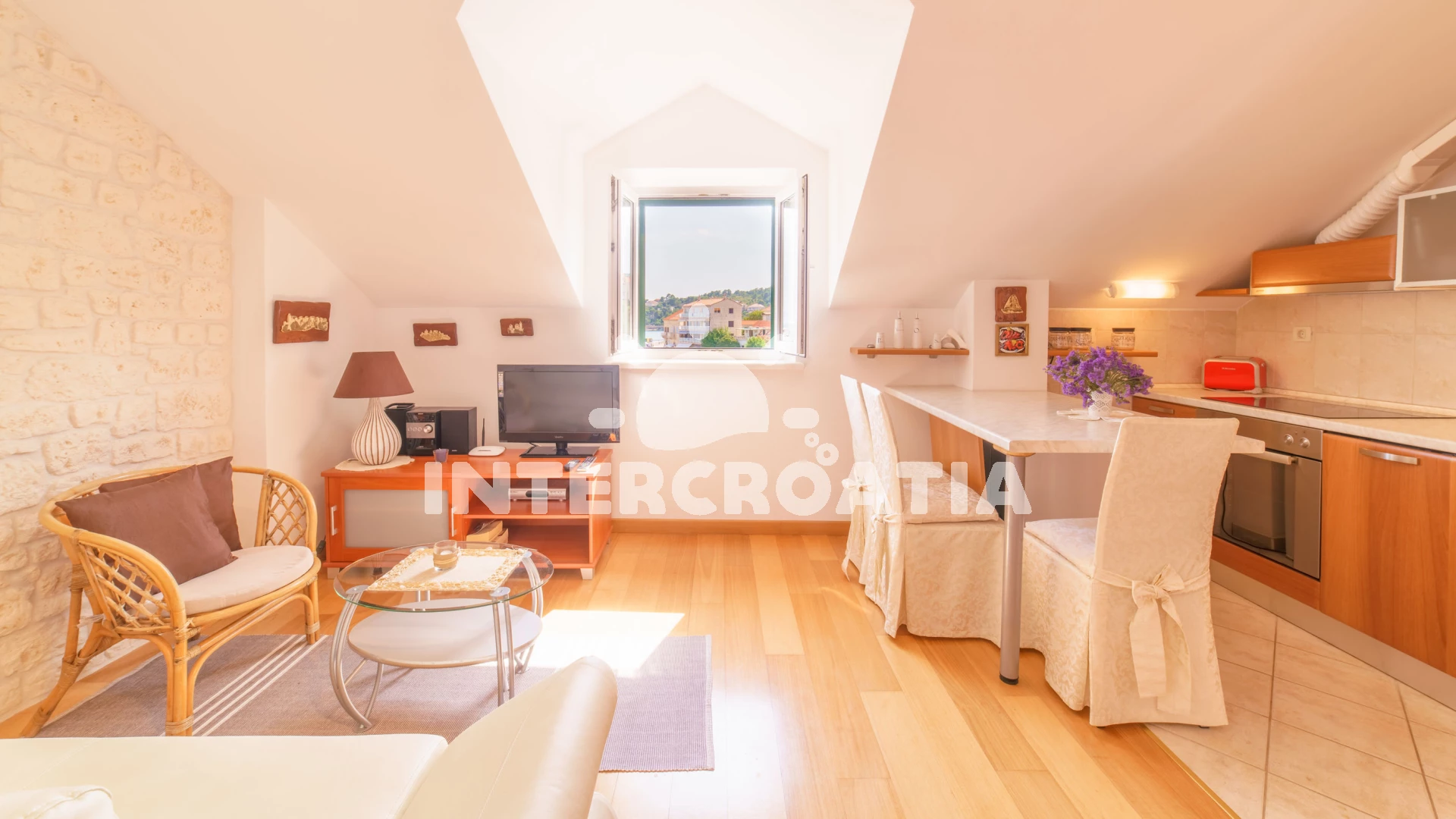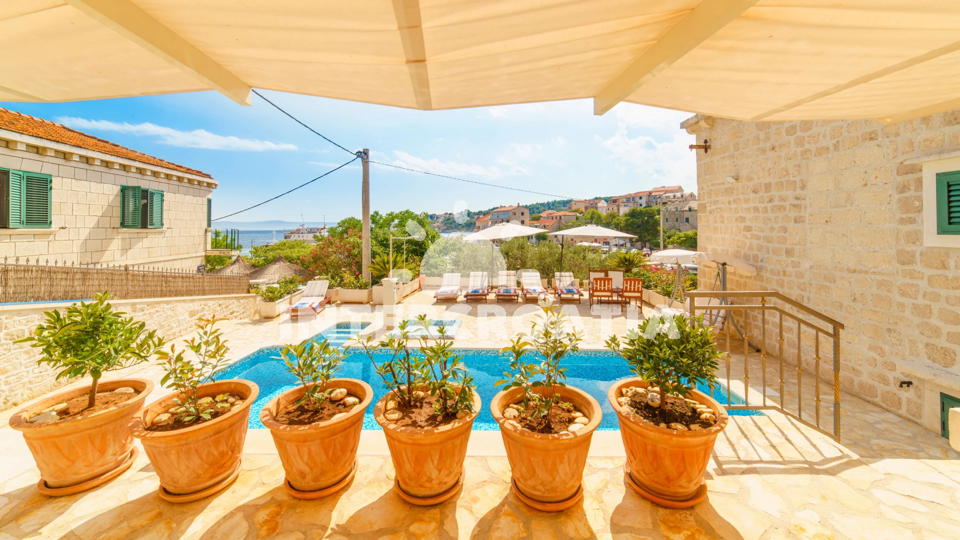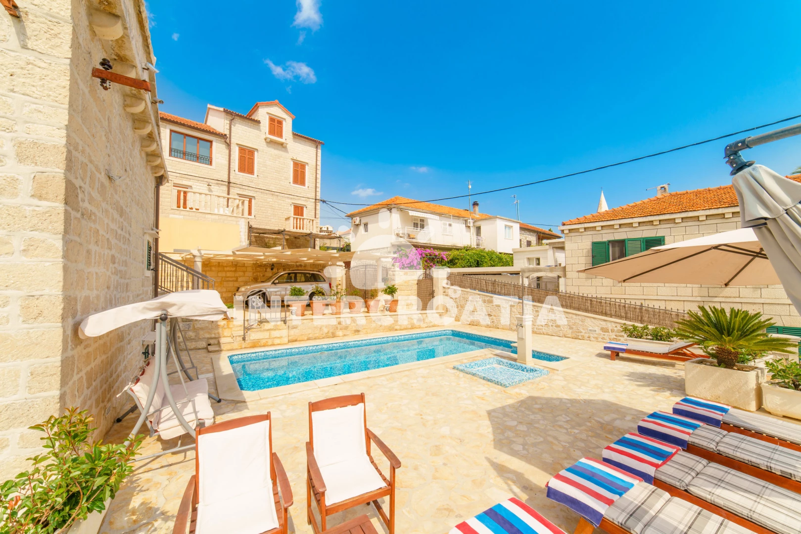 Vzdálenosti: Moře 10 m, pláž 100 m (oblázky), kotviště pro čluny 50 m, pošta 50 m, půjčovna motorových člunů 50 m, marina 50 m, bar 50 m, supermarket 50 m, centrum 50 m, restaurace 50 m, směnárna 100 m, trajekt (Sumartin) 200 m, veřejná doprava 200 m, muzeum 200 m, potápění 500 m, čerpací stanice 1,5 km, tenisové kurty 3 km, lékárna 3 km, ambulance 3 km, banka 40 km,
