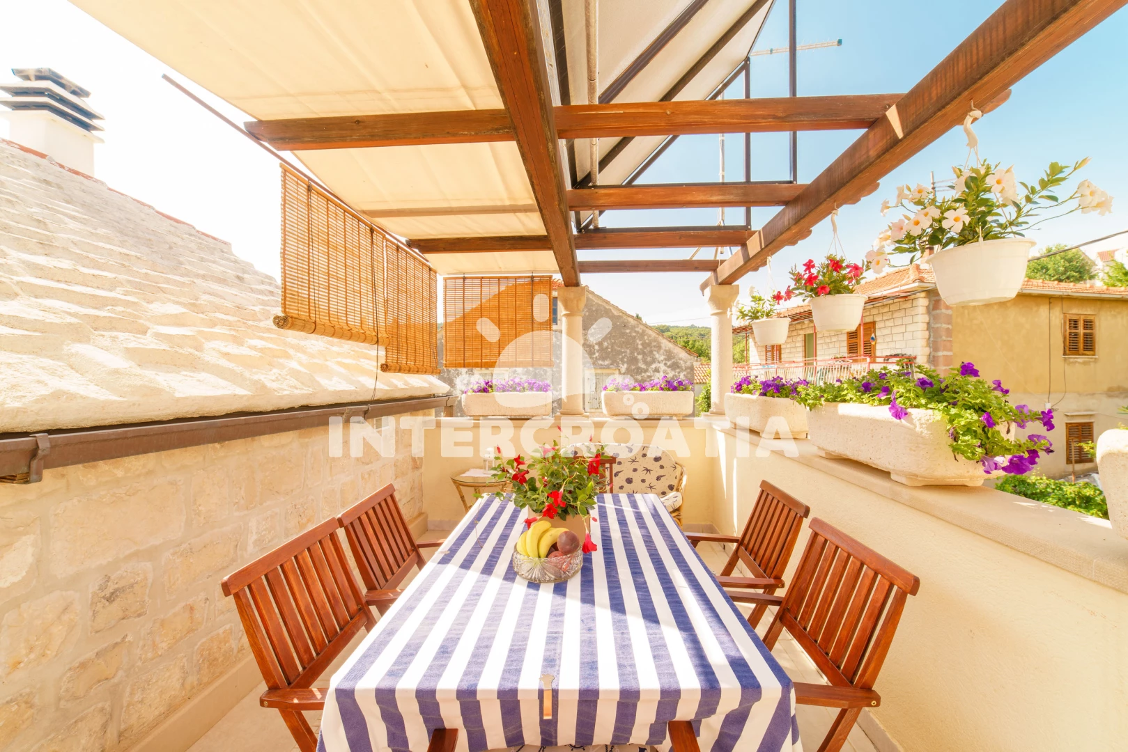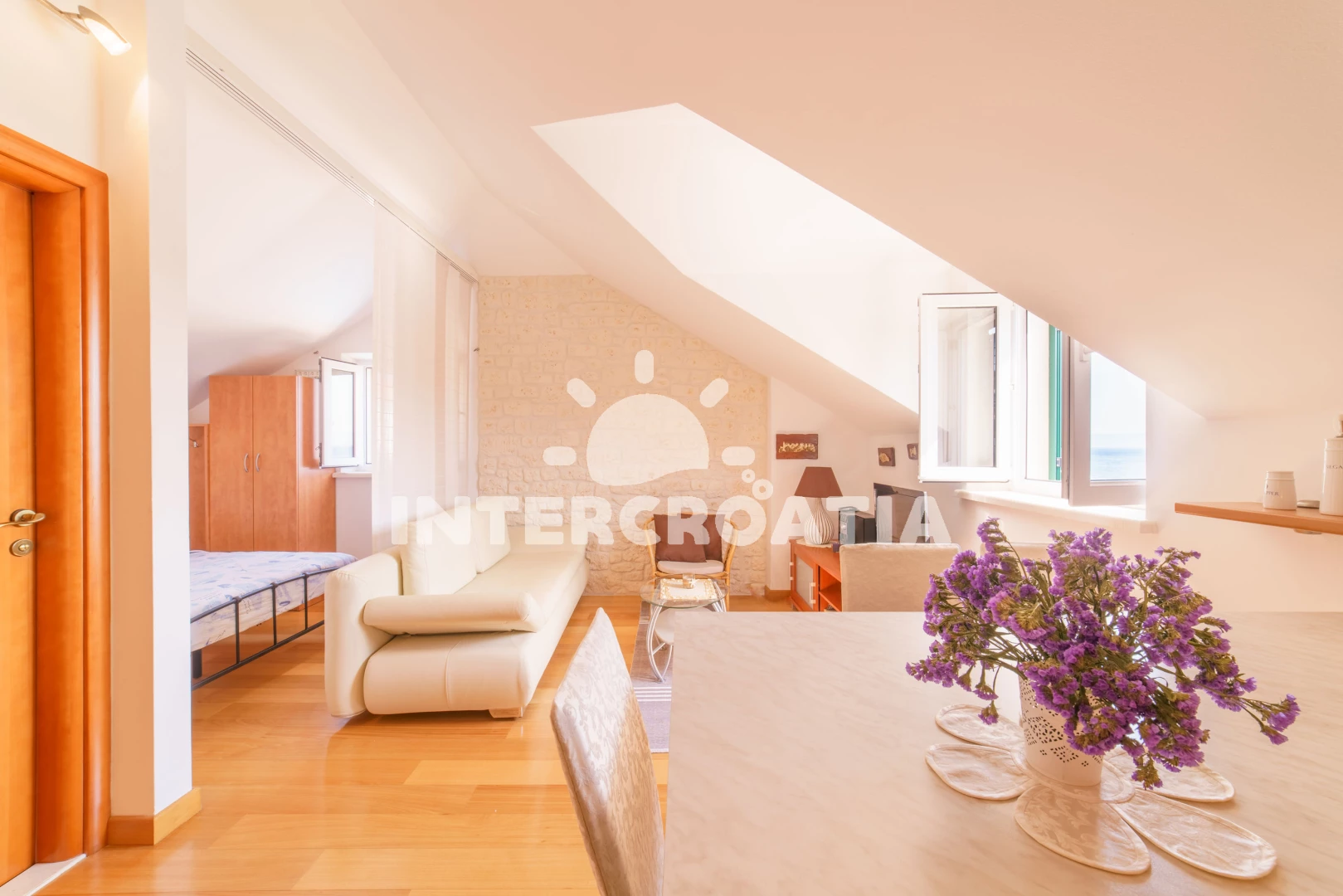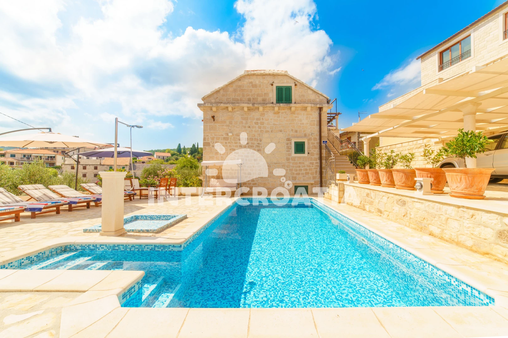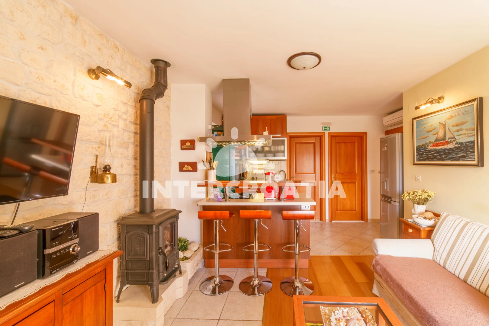 Vzdálenosti: Moře 10 m, pláž 100 m (oblázky), kotviště pro čluny 50 m, pošta 50 m, půjčovna motorových člunů 50 m, marina 50 m, bar 50 m, supermarket 50 m, centrum 50 m, restaurace 50 m, směnárna 100 m, trajekt (Sumartin) 200 m, veřejná doprava 200 m, muzeum 200 m, potápění 500 m, čerpací stanice 1,5 km, tenisové kurty 3 km, lékárna 3 km, ambulance 3 km, banka 40 km,