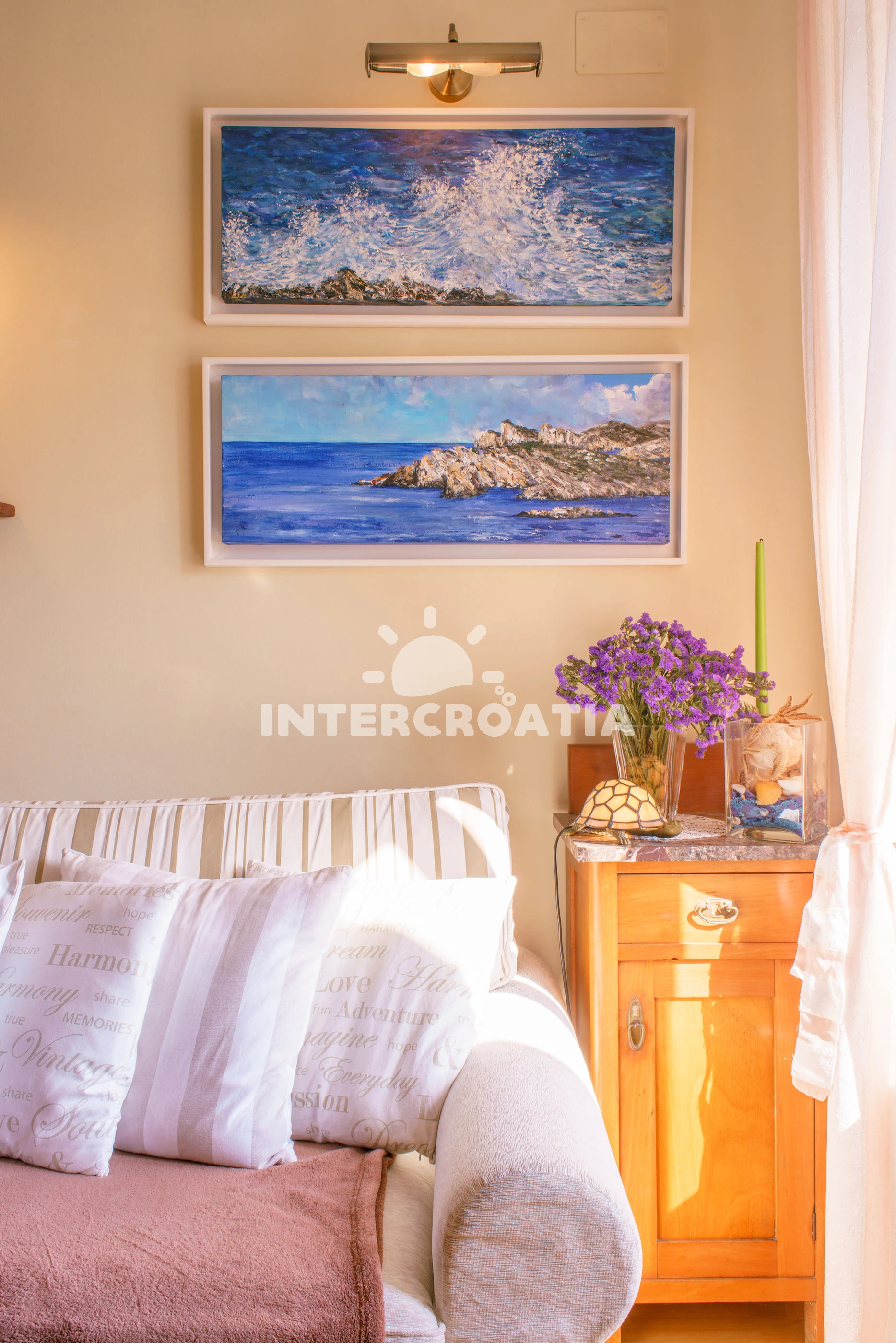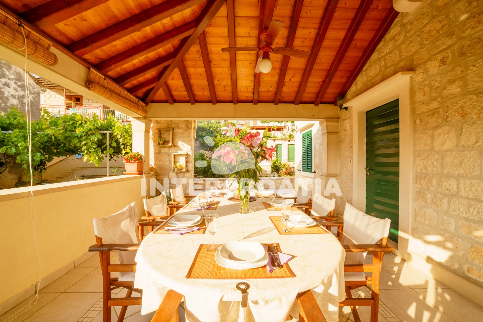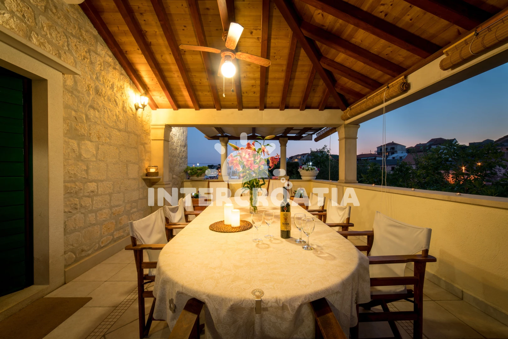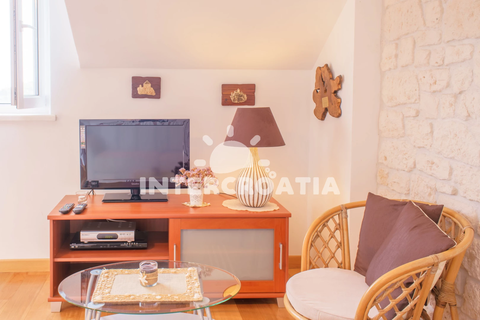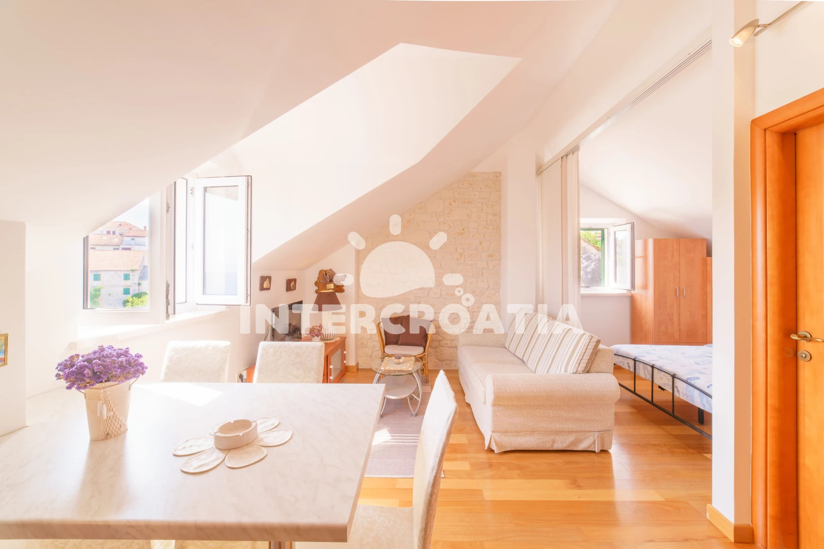 Vzdálenosti: Moře 10 m, pláž 100 m (oblázky), kotviště pro čluny 50 m, pošta 50 m, půjčovna motorových člunů 50 m, marina 50 m, bar 50 m, supermarket 50 m, centrum 50 m, restaurace 50 m, směnárna 100 m, trajekt (Sumartin) 200 m, veřejná doprava 200 m, muzeum 200 m, potápění 500 m, čerpací stanice 1,5 km, tenisové kurty 3 km, lékárna 3 km, ambulance 3 km, banka 40 km,