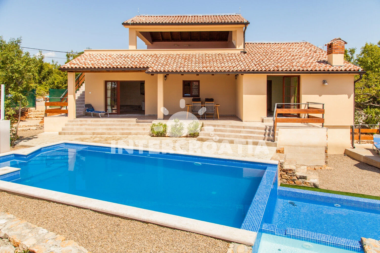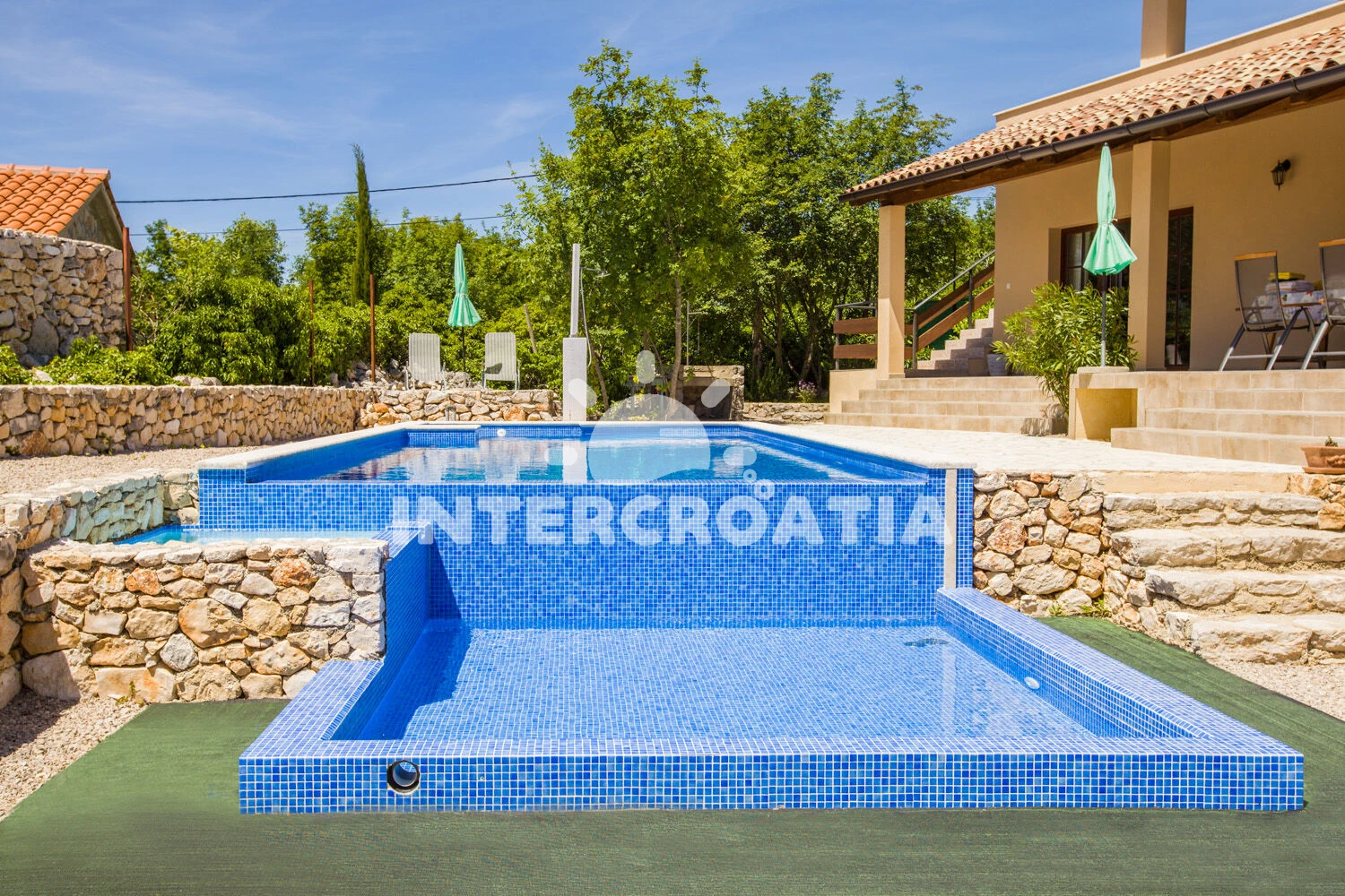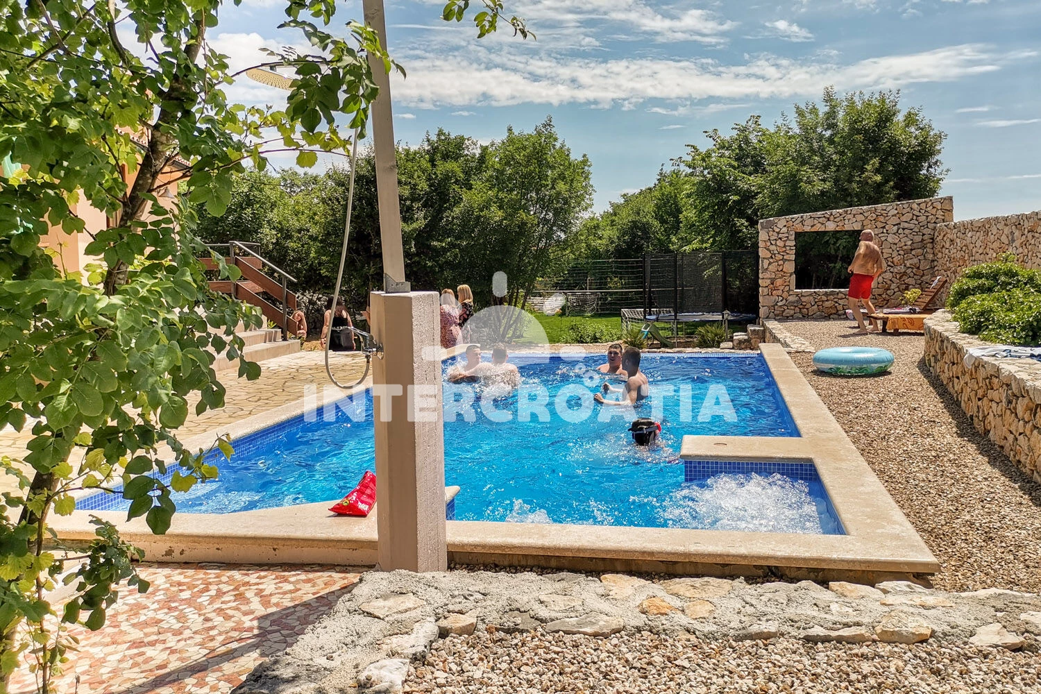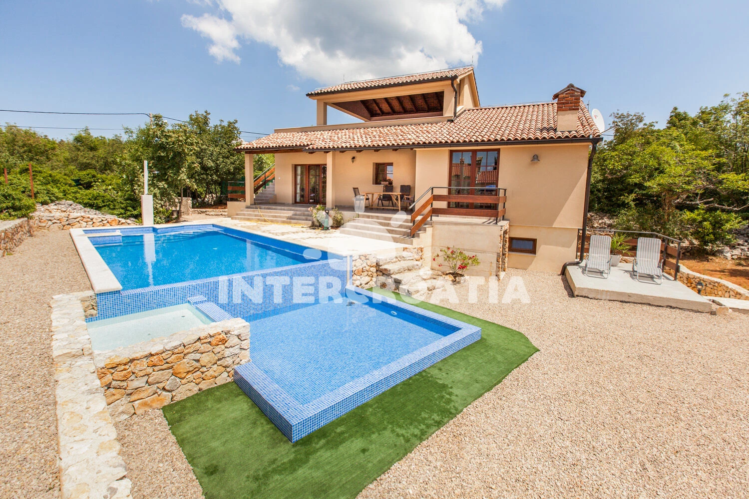Vila se nachází 5000 m od moře a pláže. Pláž je písčitá, skalnatá, oblázková, větší kamení a betonové desky. Vila disponuje bazénem s lehátky pro ubytované hosty. K dispozici vířivka. U objektu je k dispozici společná zahrada s posezením a grilem. Parkování je před domem.