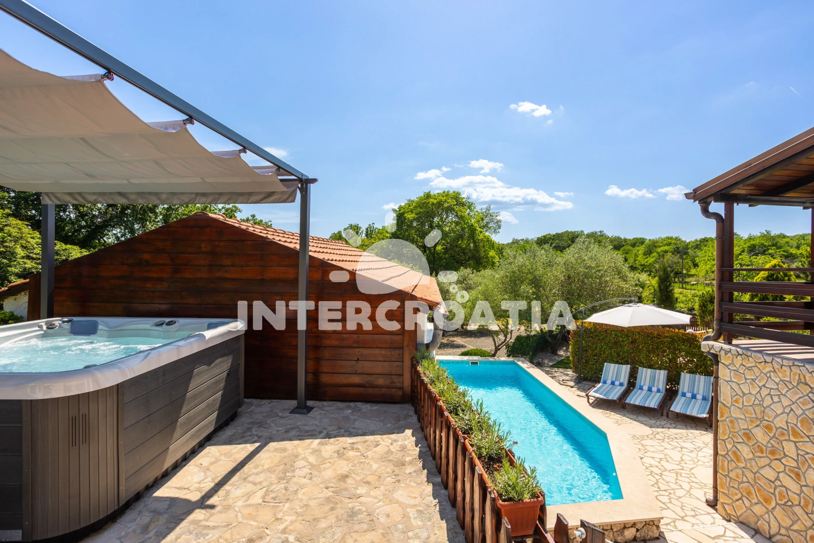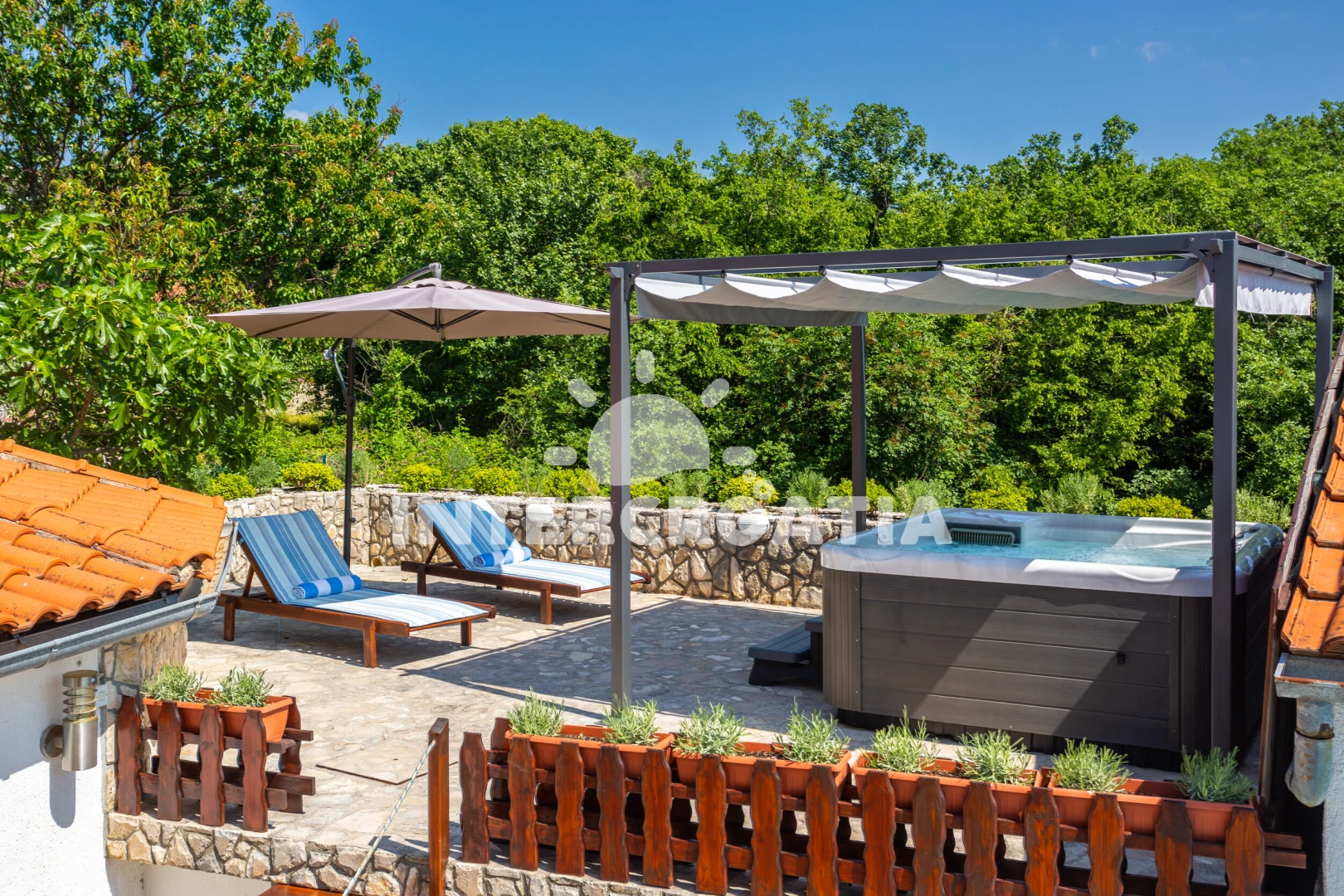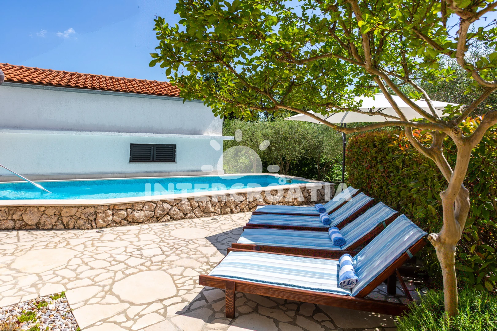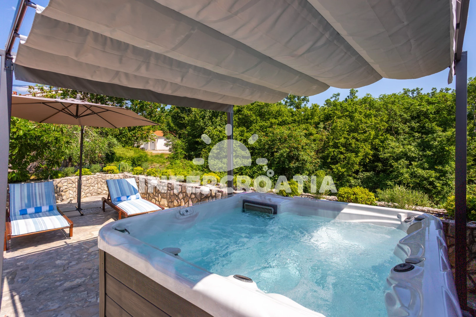Vila se nachází 1500 m od moře a pláže. Pláž je oblázková. Vila disponuje bazénem s lehátky pro ubytované hosty. K dispozici vířivka. U objektu je k dispozici společná zahrada s posezením a grilem. Parkování je před domem.