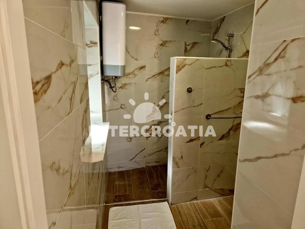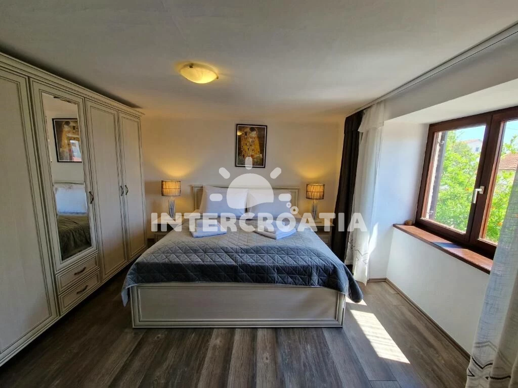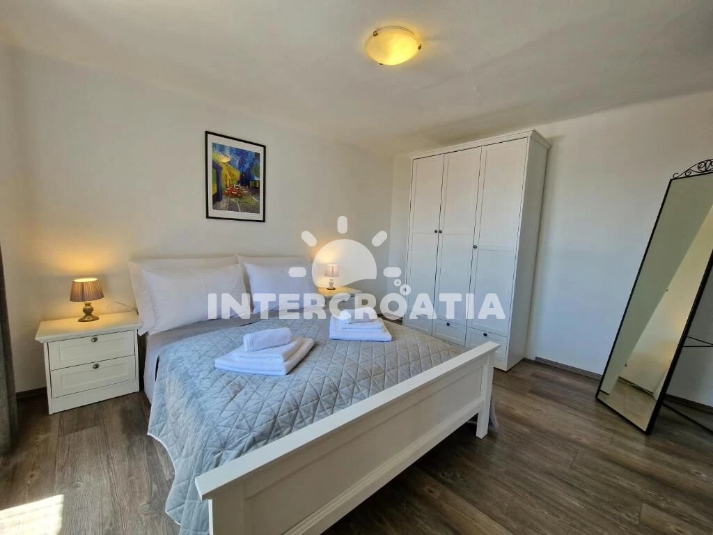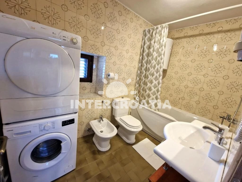 Patrová vila o rozloze 120 m2, nabízí terasu s venkovním posezením a výhledem na moře. Vila má celkem 3 ložnice, 2 koupelny a je vhodná pro až 6 osob. Kuchyňská linka je vybavena varnou deskou, digestoří, vestavěnou troubou, myčkou na nádobí, mikrovlnnou troubou, rychlovarnou konvicí, kávovarem, toustovačem, nádobím a lednicí s mrazákem. Obývací místnost s jídelním stolem, televizí a vstupem na terasu. Chodba s klimatizací a vstupy do ložnic. Všechny tři ložnice jsou vybaveny vždy s jedním dvoulůžkem. První koupelna s vanou, sprchovou zástěnou, umyvadlem, pračkou, fénem, bidetem a wc. Druhá koupelna se sprchovým koutem, umyvadlem a wc. Hostům je k dispozici parkování u objektu zdarma.