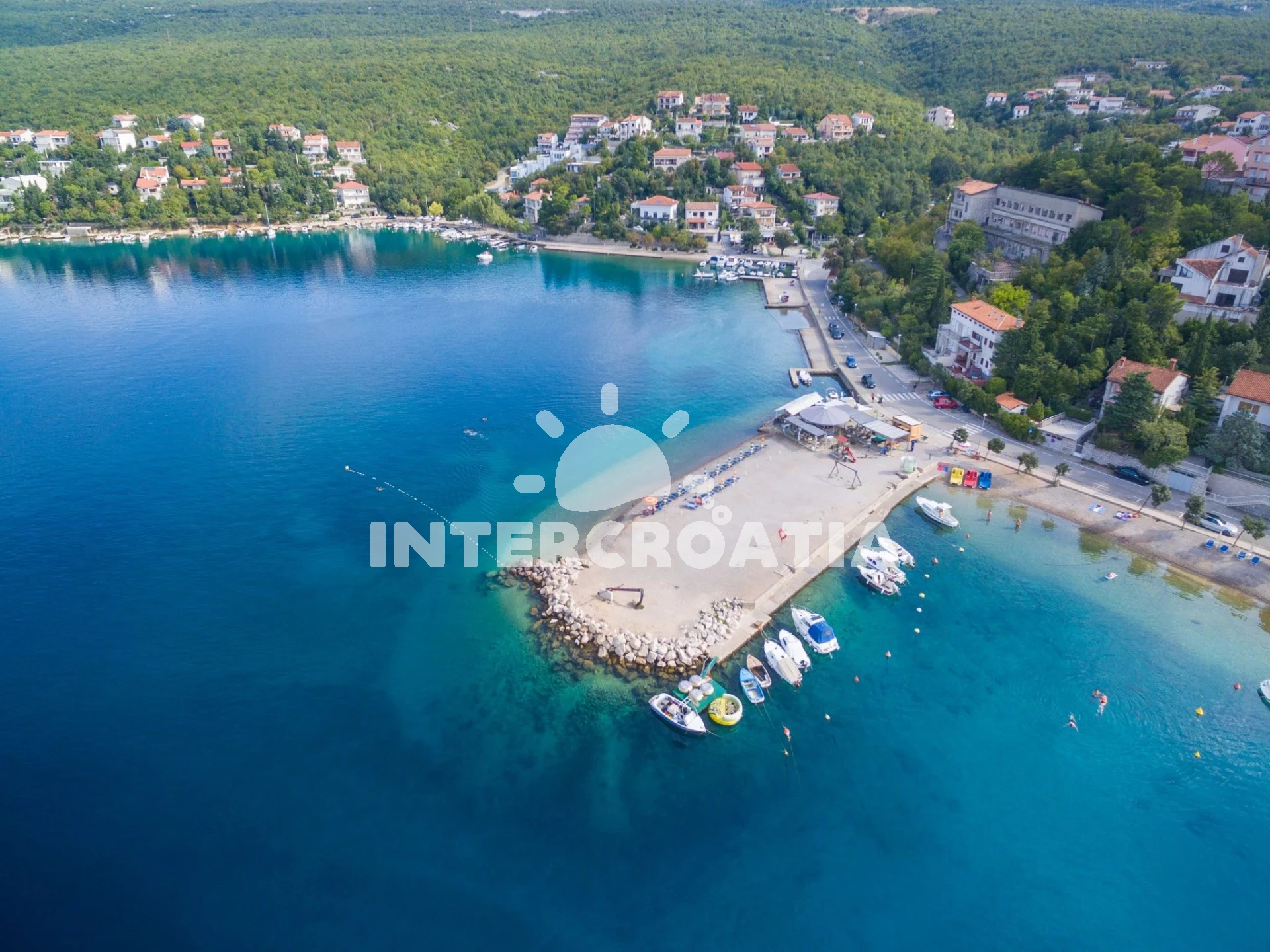 Vzdálenosti: Moře a betonová pláž 1 km, oblázková pláž Jadranovo 1,6 km, obchod s potravinami 1 km, restaurace 1,8 km, pošta 1,2 km, čerpací stanice 750 m, centrum 1 km, banka 10 km, trajekt (Rijeka) 15 km, letiště (Rijeka) 15 km.