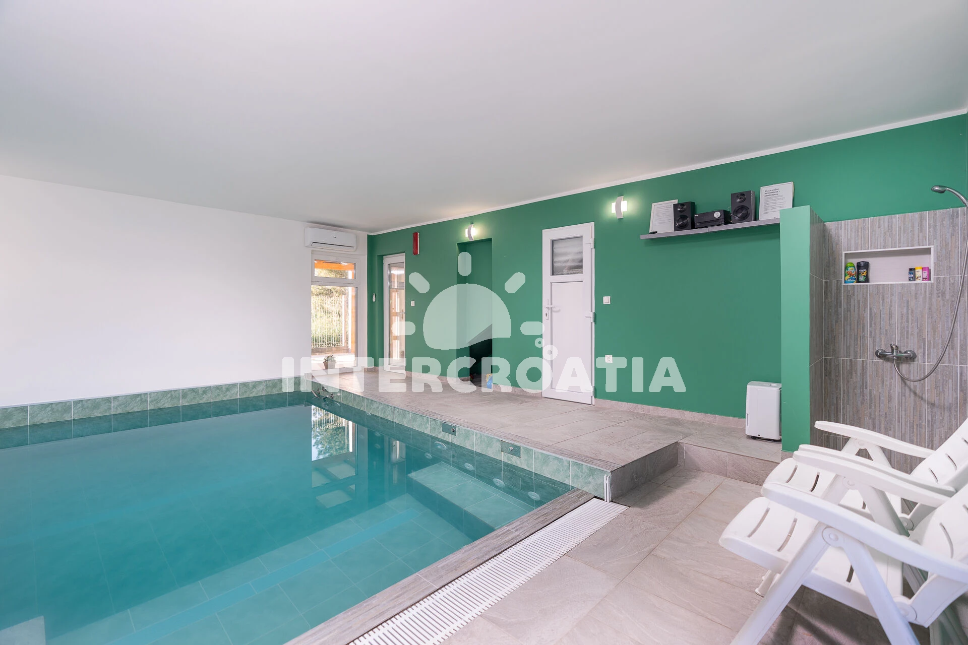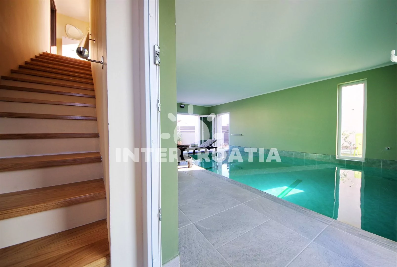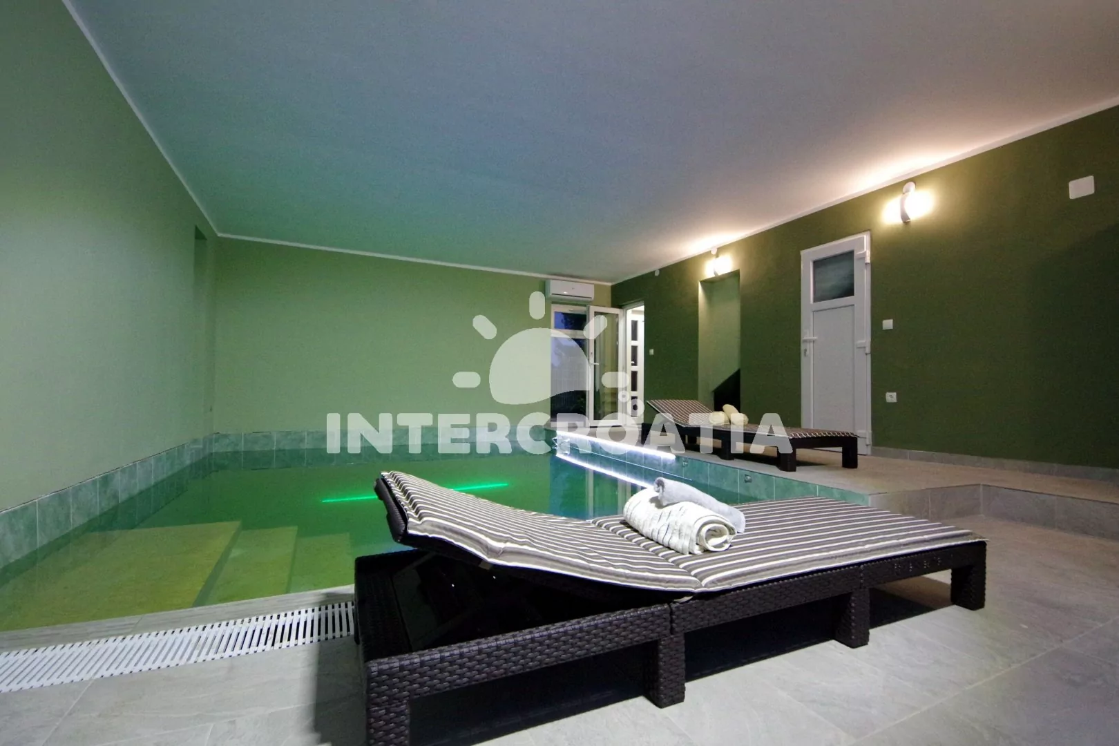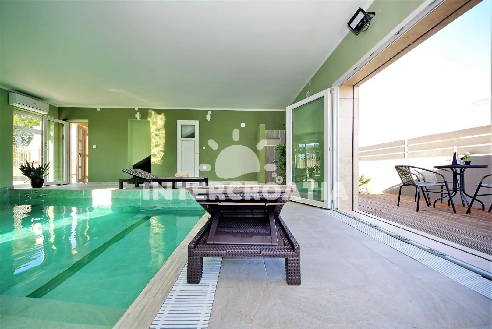 Jedinečně zařízená luxusní vila s vnitřním, vyhřívaným bazénem, terasami s venkovním posezením, lehátky a grilem. Celá vila je oplocená a nabízí dostatek soukromí. Vstup do bazénu vnitřkem vily s možností otevření francouzských oken a vstupem na zahradu. V horním patře prostorná terasa s výhledem na moře. Parkovací místa u vily. K dispozici cyklistická kola, masáže a obchod s vínem.