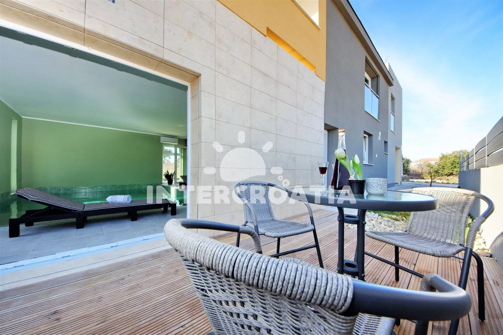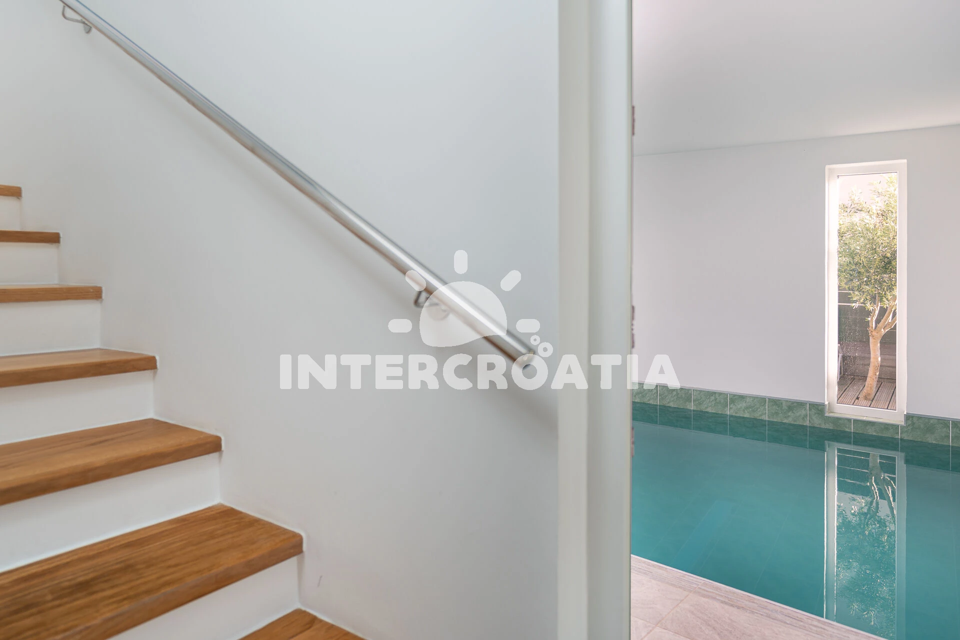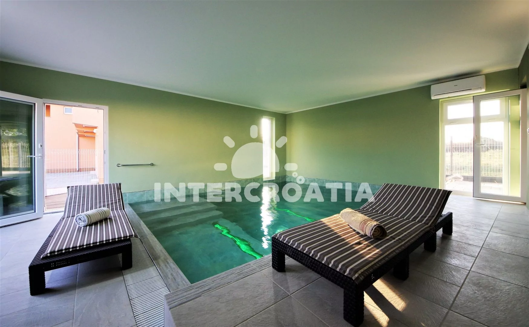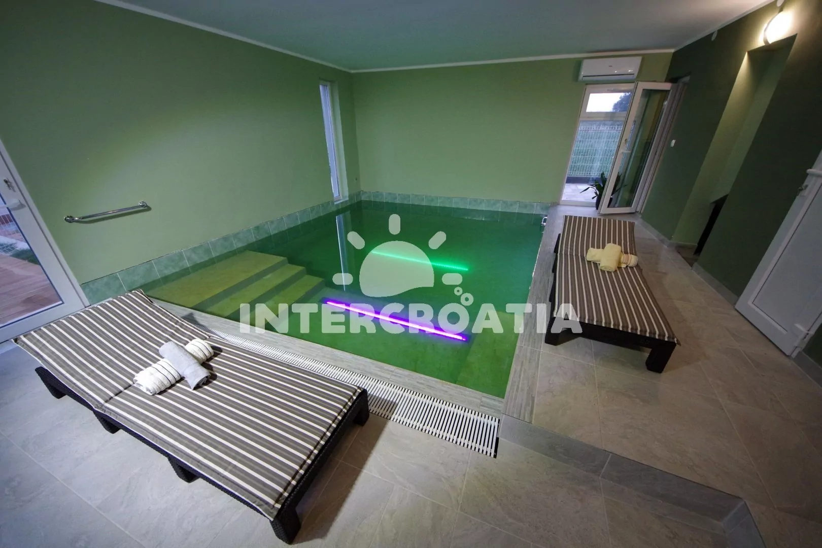 Jedinečně zařízená luxusní vila s vnitřním, vyhřívaným bazénem, terasami s venkovním posezením, lehátky a grilem. Celá vila je oplocená a nabízí dostatek soukromí. Vstup do bazénu vnitřkem vily s možností otevření francouzských oken a vstupem na zahradu. V horním patře prostorná terasa s výhledem na moře. Parkovací místa u vily. K dispozici cyklistická kola, masáže a obchod s vínem.