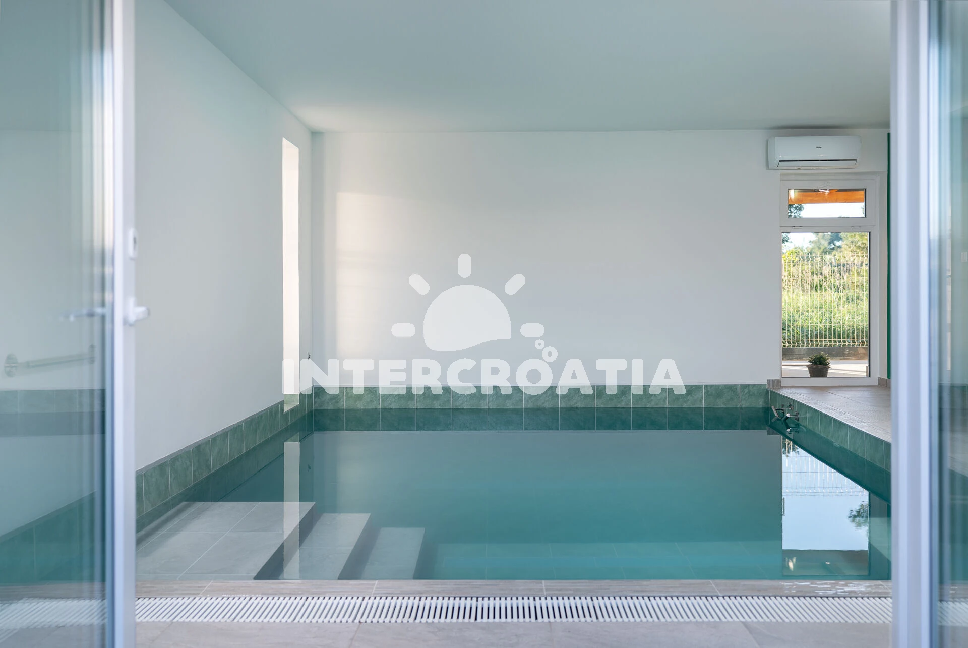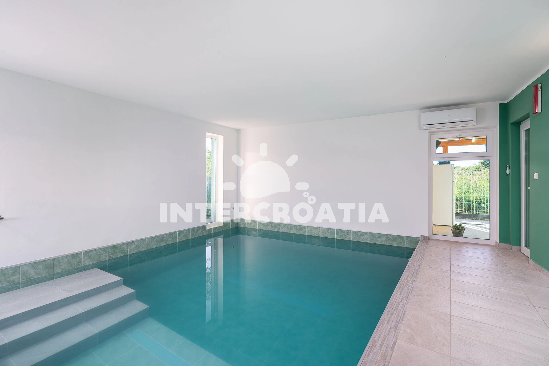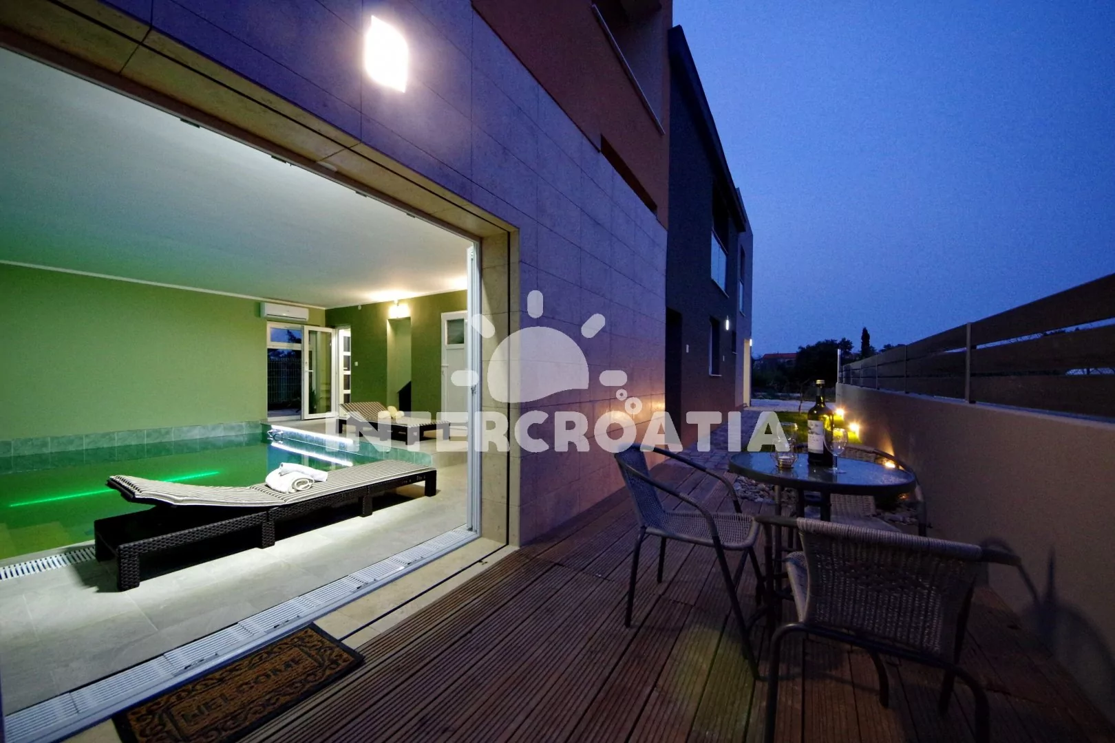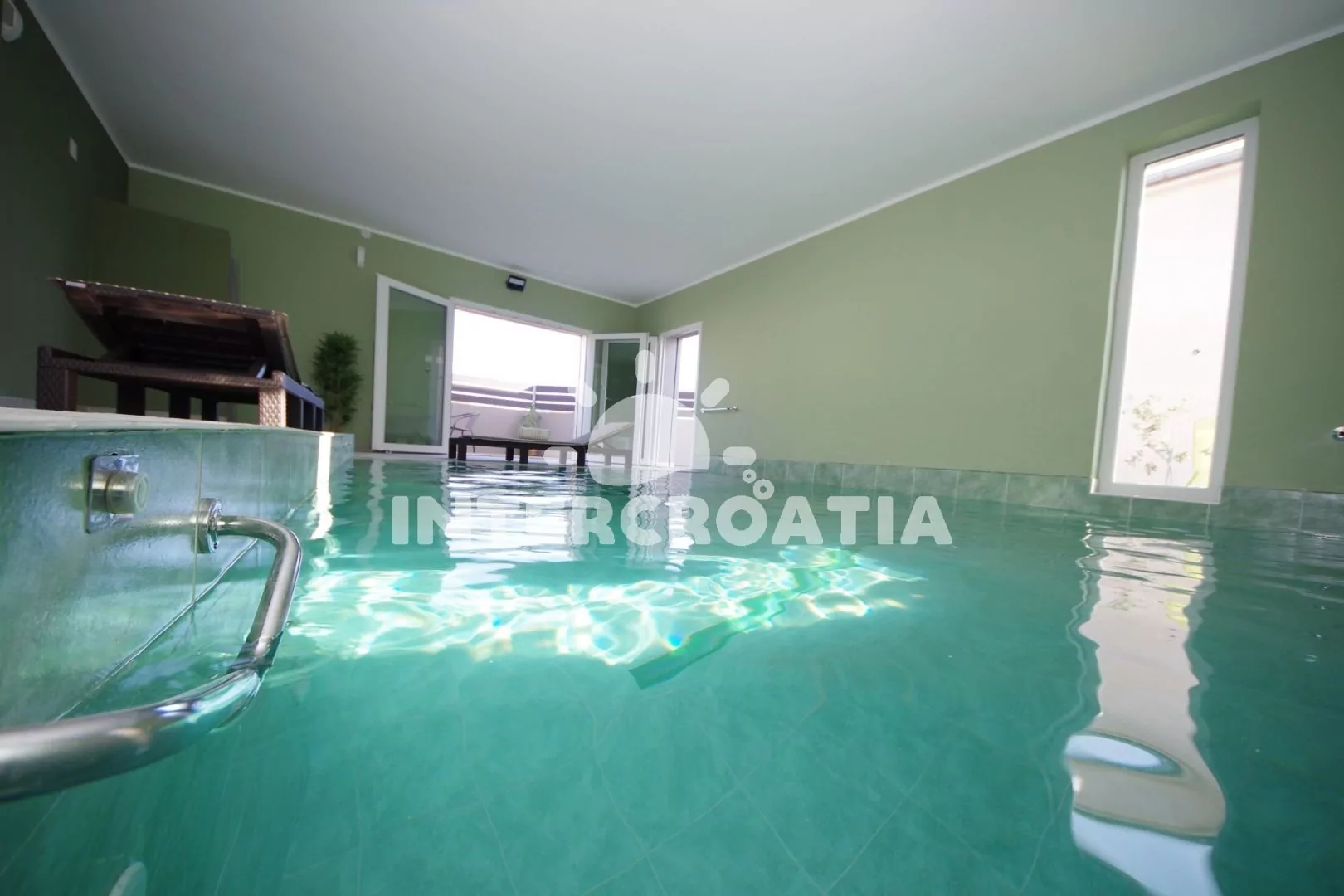 Jedinečně zařízená luxusní vila s vnitřním, vyhřívaným bazénem, terasami s venkovním posezením, lehátky a grilem. Celá vila je oplocená a nabízí dostatek soukromí. Vstup do bazénu vnitřkem vily s možností otevření francouzských oken a vstupem na zahradu. V horním patře prostorná terasa s výhledem na moře. Parkovací místa u vily. K dispozici cyklistická kola, masáže a obchod s vínem.